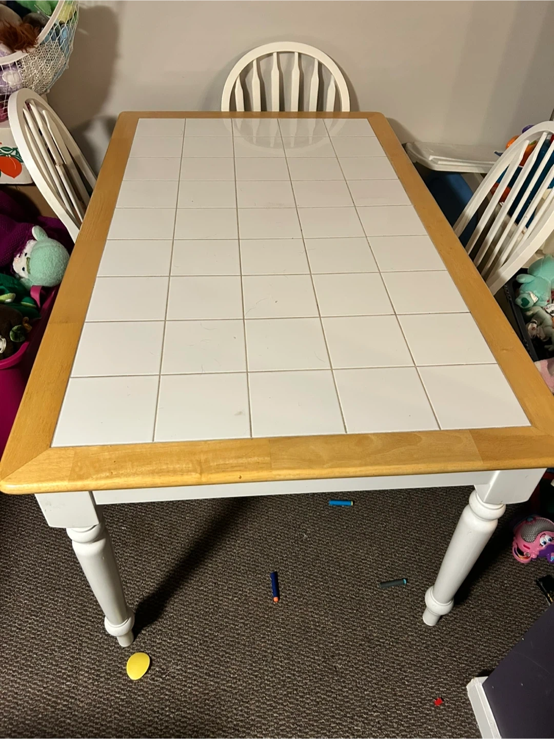 Selling a dining table with a unique tile top and light wood trim. The legs are painted white. It's a sturdy table that would look great in a kitchen or dining room. Perfect for family meals or game nights! Table comes with 6 chairs only 3 in the picture.