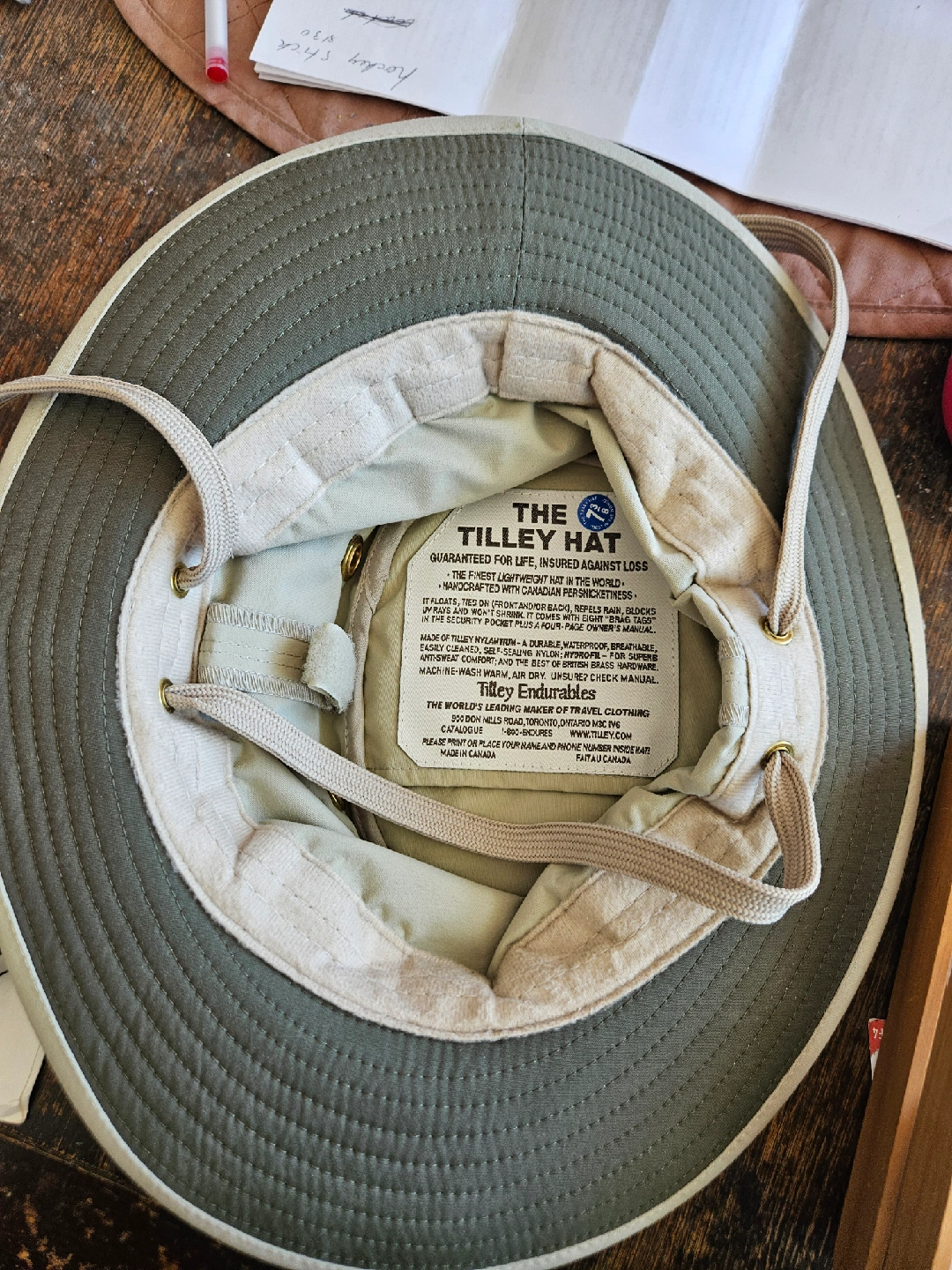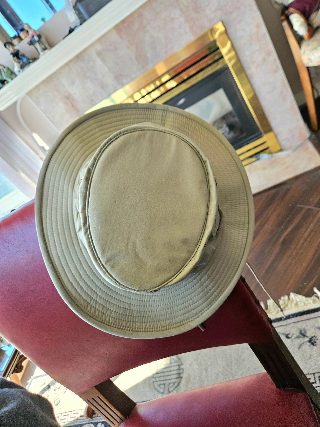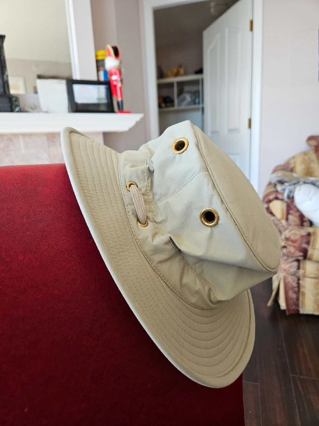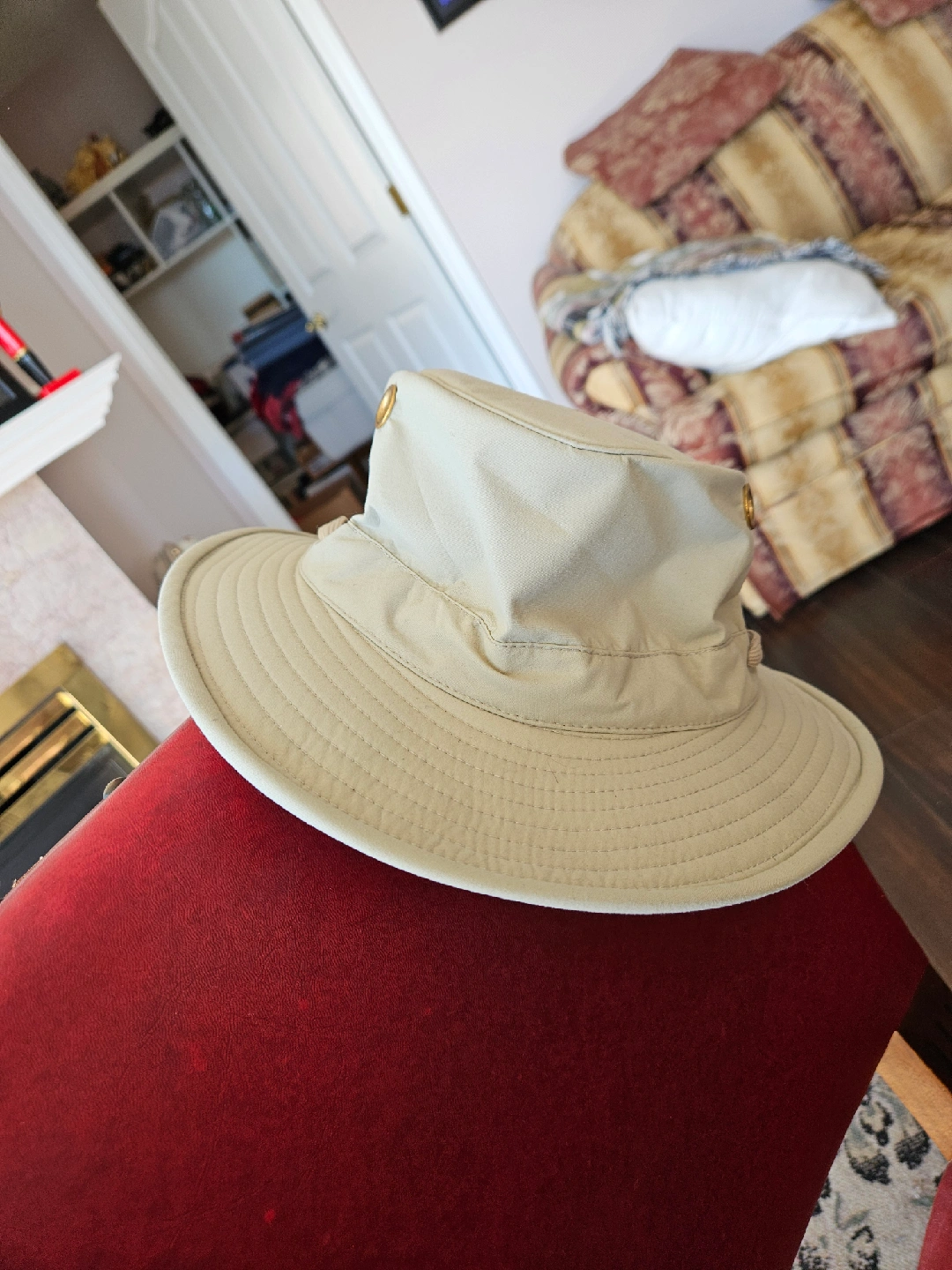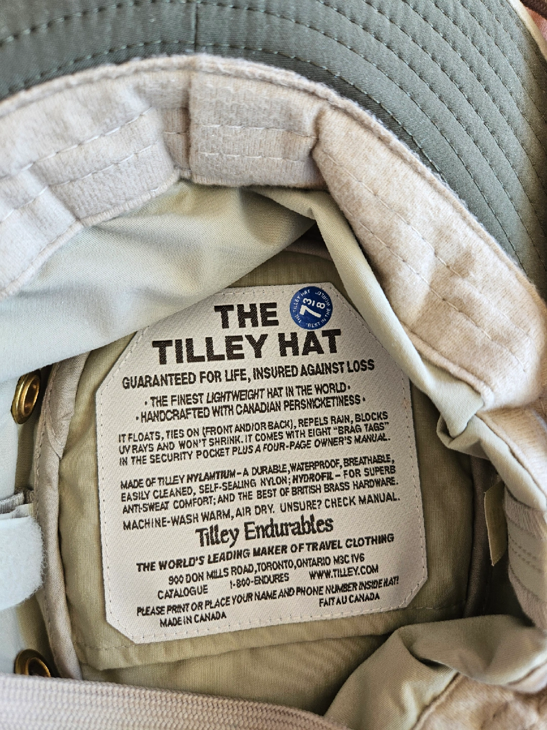 Selling a Tilley Hat. It's the finest lightweight hat in the world, handcrafted with Canadian persnicketiness! It floats, ties on (front and/or back), repels rain, blocks UV rays and won't shrink. Made of Tilley Nylamtium - a durable, waterproof, breathable, easily cleaned, self-sealing nylon; Hydrofil for superior anti-sweat comfort and the best of British brass hardware. Machine-wash warm, air dry.