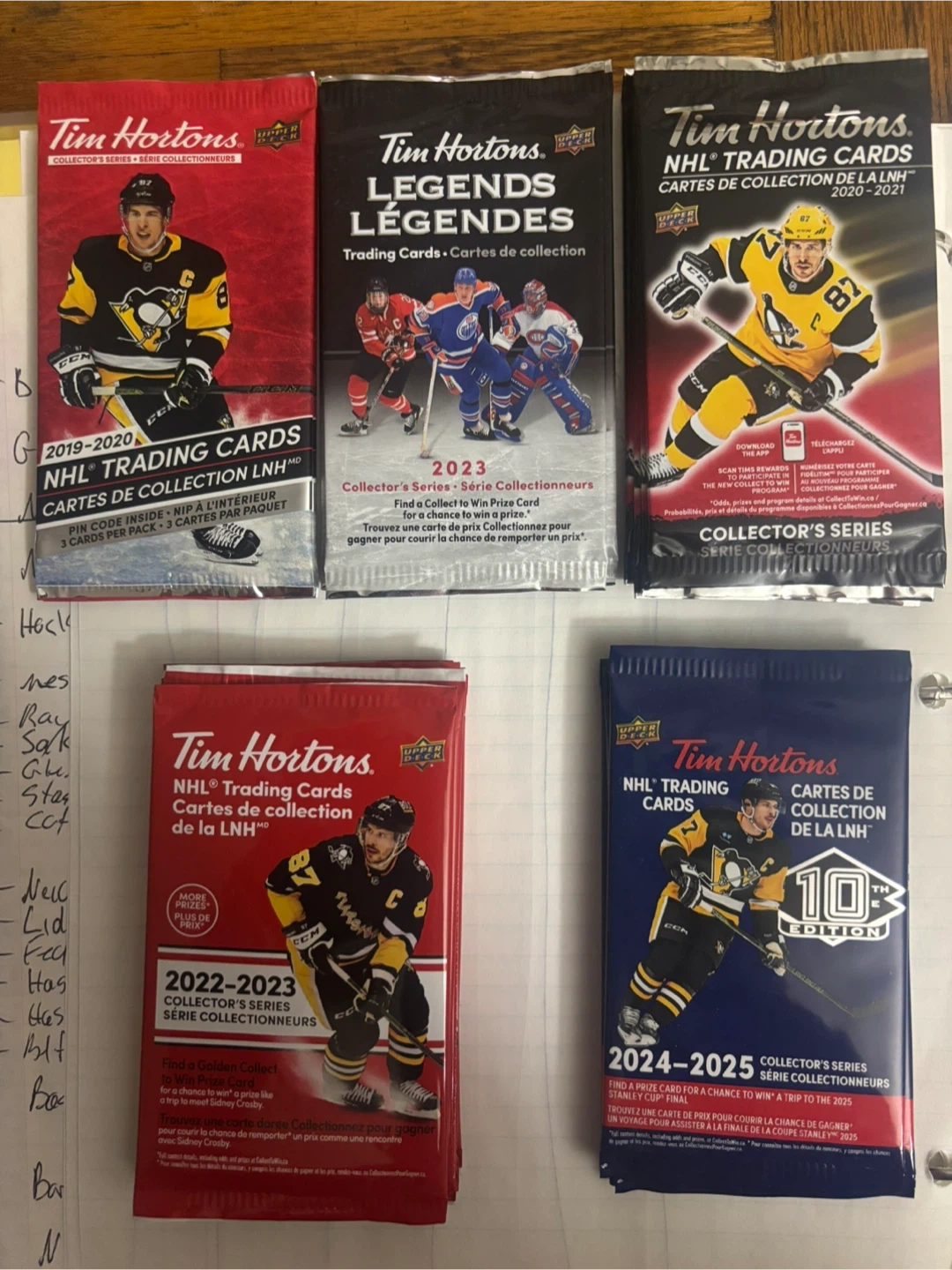 Tim Hortons NHL trading cards - unopened packs from various years: 2019-2020 - 2 packs 2020-2021 - 6 packs 2022-2023 - 7 packs 2023 Legends - 3 packs 2024-2025 10th Edition - 4 packs $5 each pack Pick up in Milton
