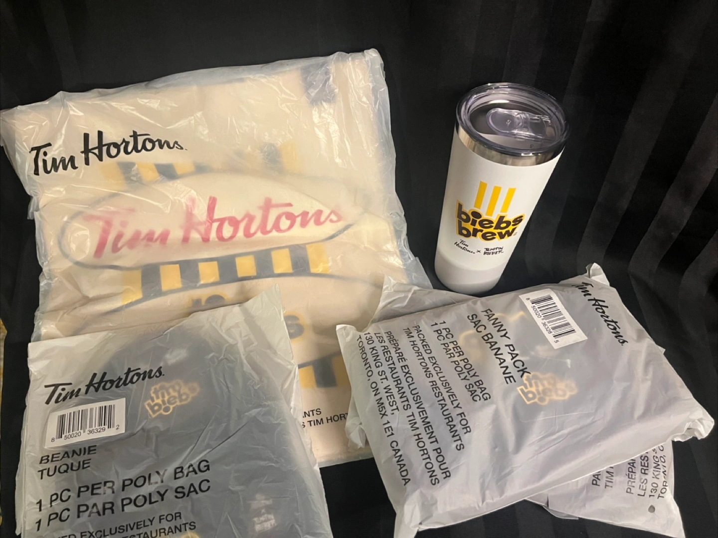 Selling a cool collection of Tim Hortons and Biebs Brew merchandise! Included is a Biebs Brew tumbler and some packaged merch. Perfect for any Tim Hortons fan! Tote Bag Beenie Hat Two fanny packs Tumbler