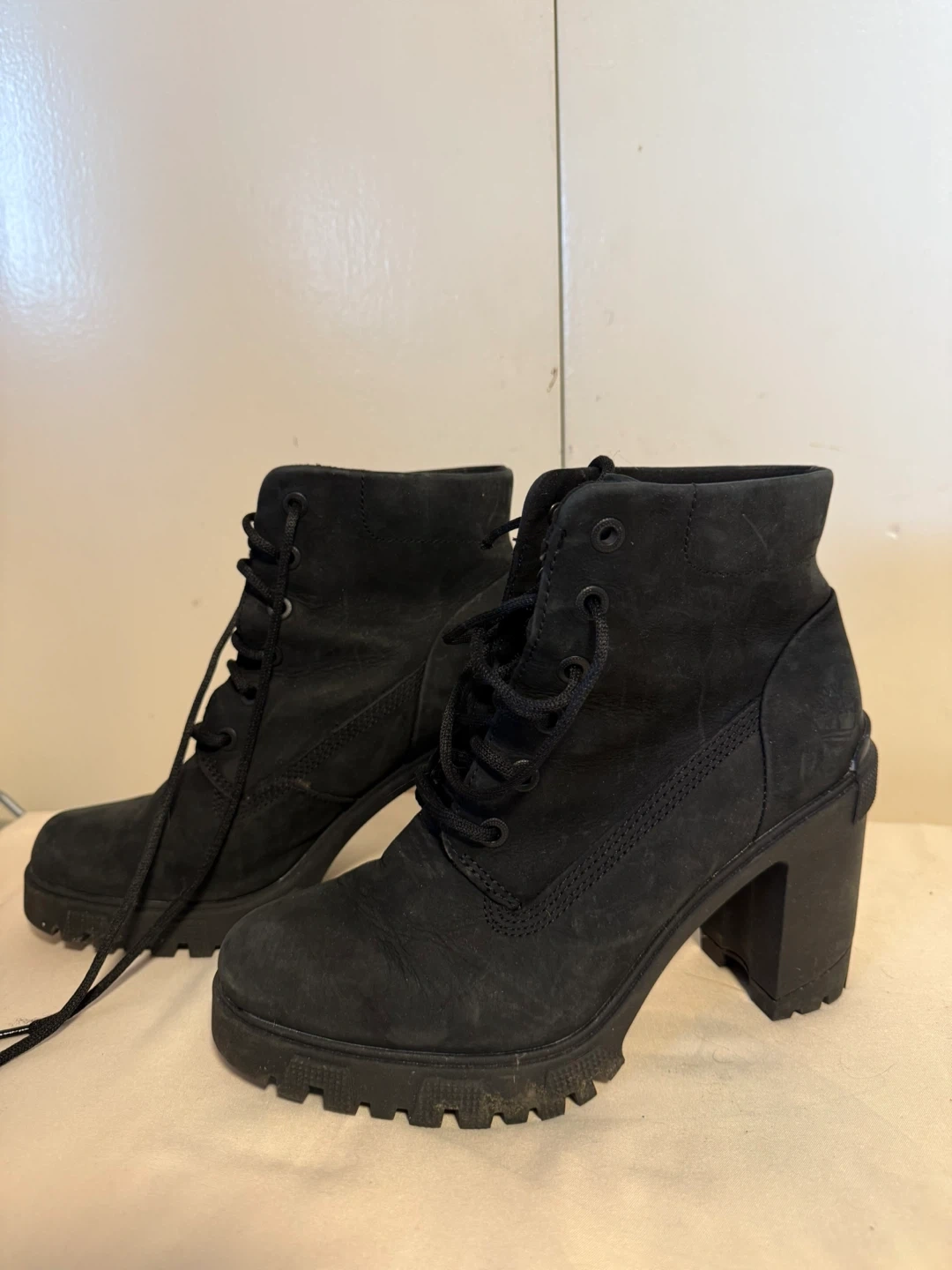 Selling a pair of Timberland heeled boots in black. They have some signs of wear, but are still in good condition. Great for adding a bit of edge to any outfit!