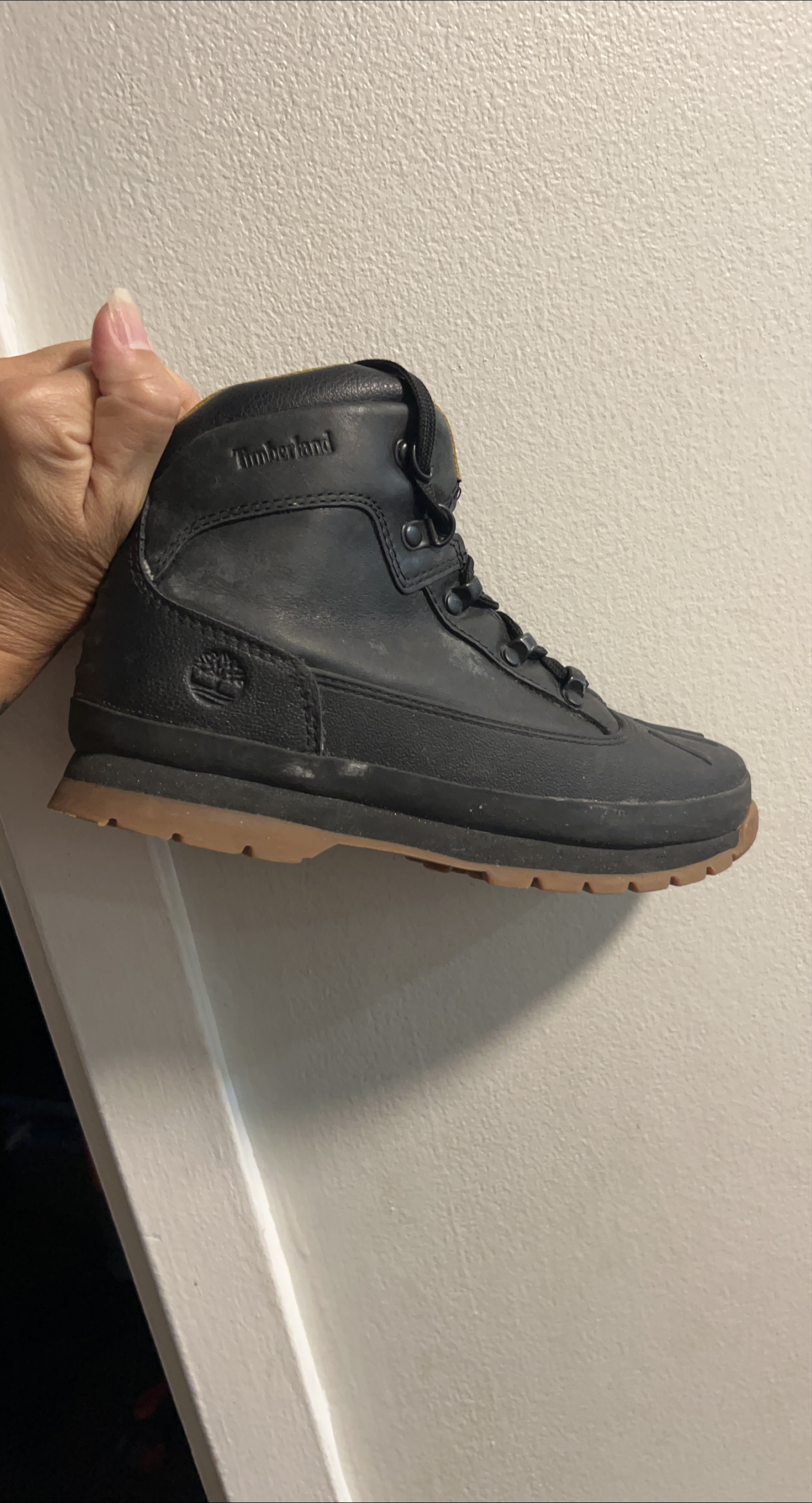 Selling a pair of Timberland ankle boots in black leather. They are in good condition and ready for a new home! Perfect for fall and winter weather