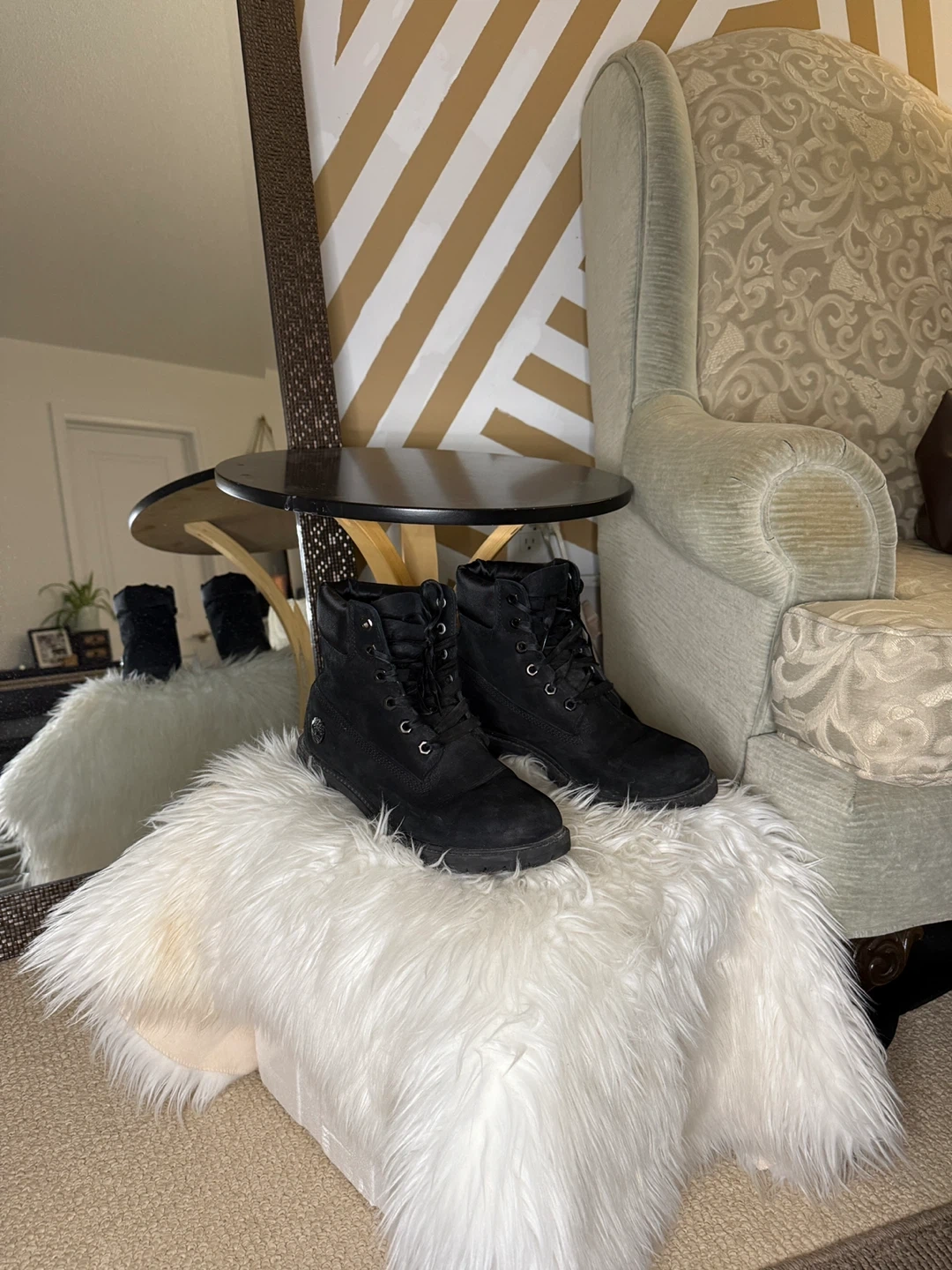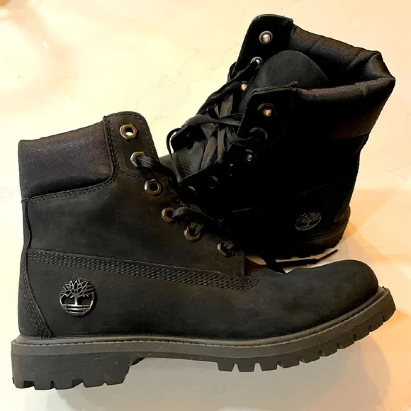 Selling a pair of Womens Timberland boots in black suede and satin rim! They're in great condition and ready for a new home. Comes with replacement laces and worn only 1 season
