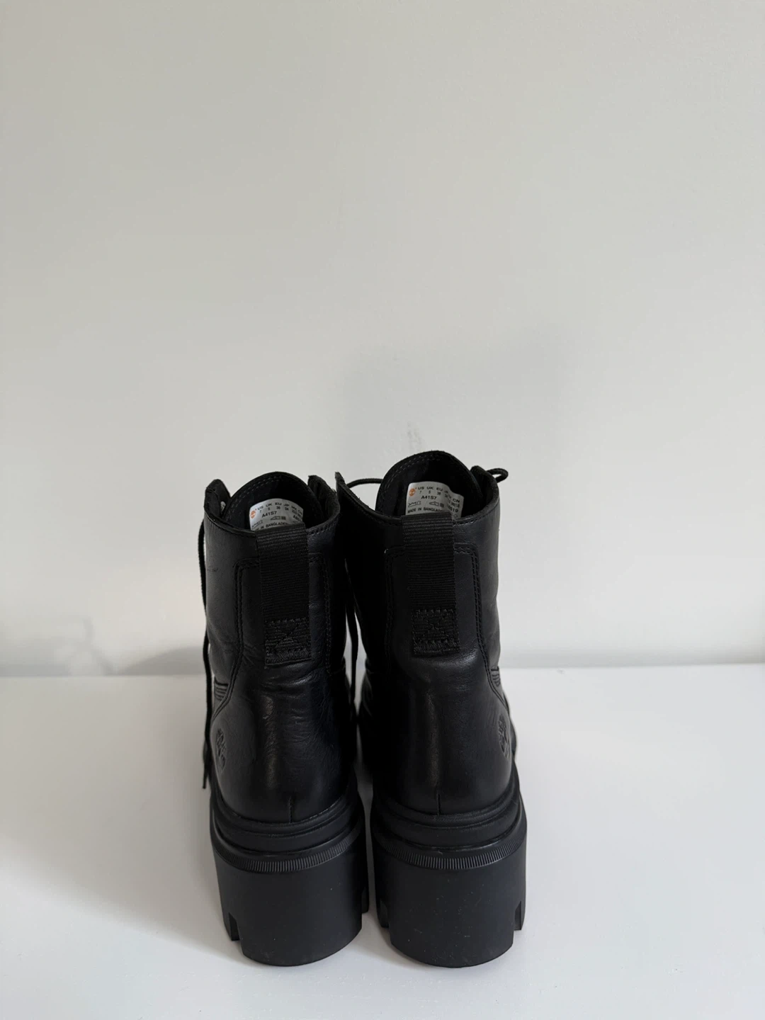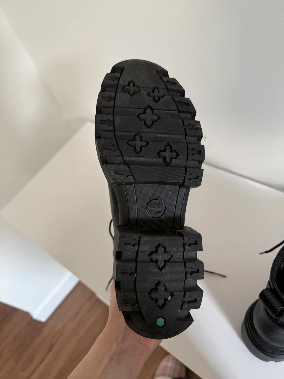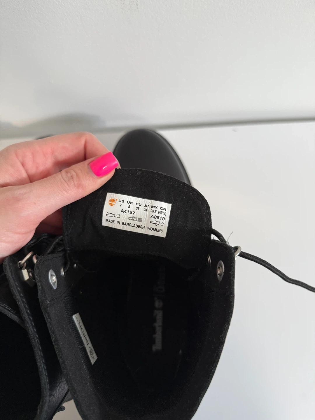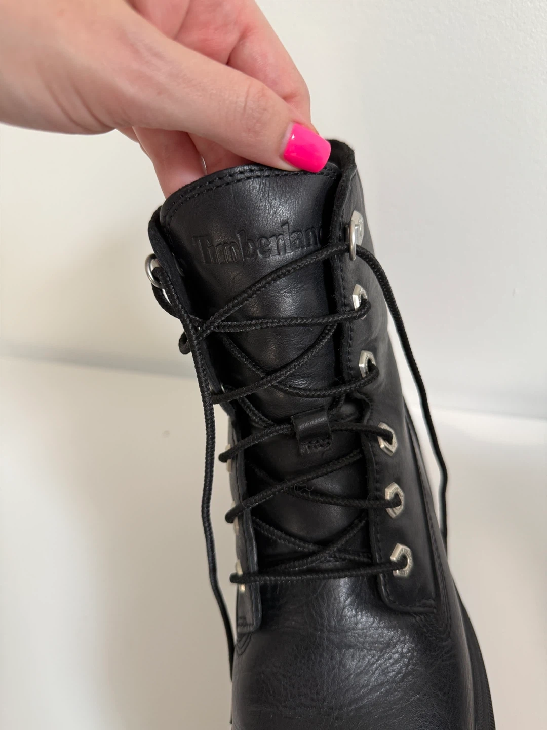 Selling a pair of Timberland platform boots in black leather. They are a women's size 7 US. These boots are in excellent condition and ready for a new home!