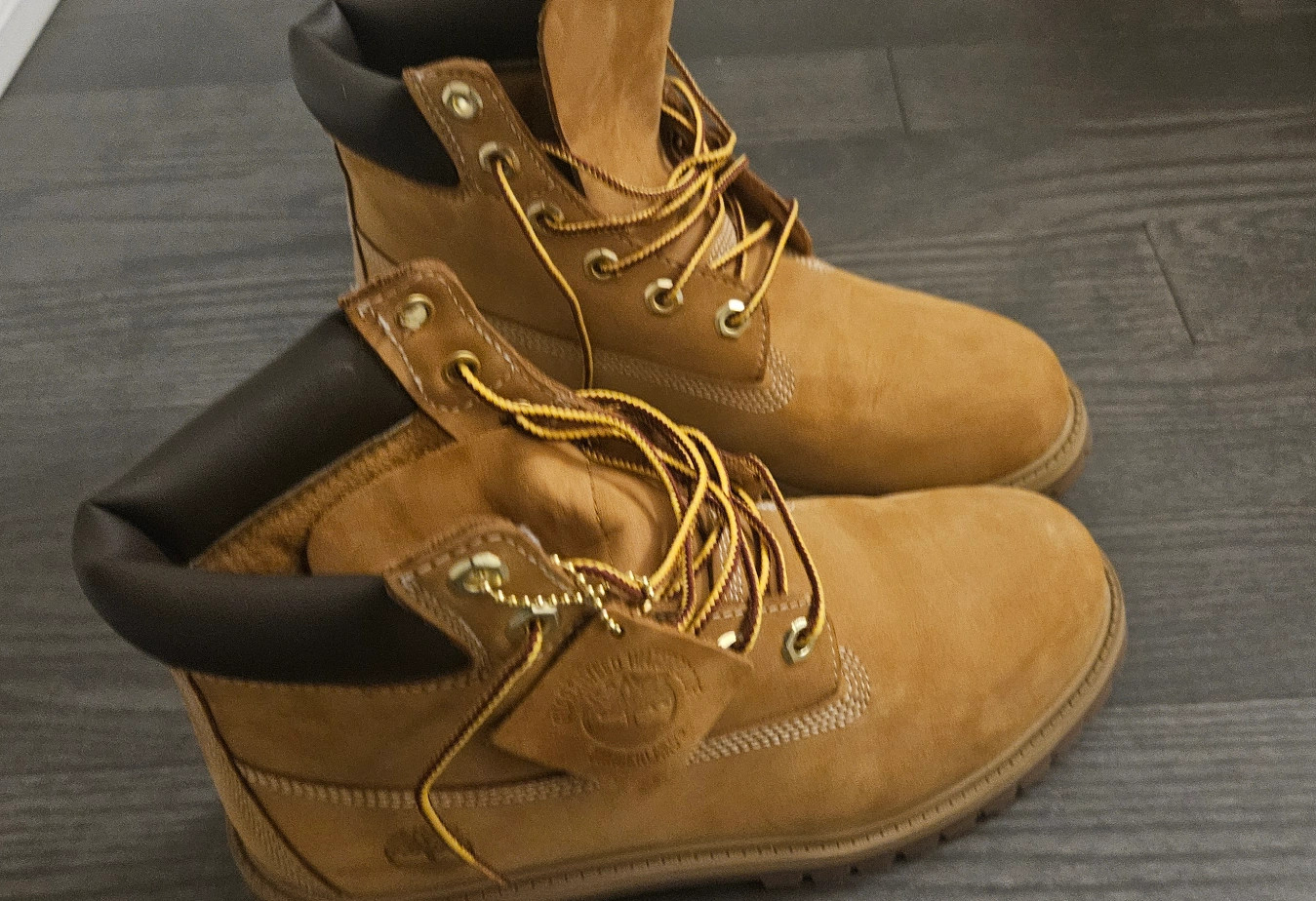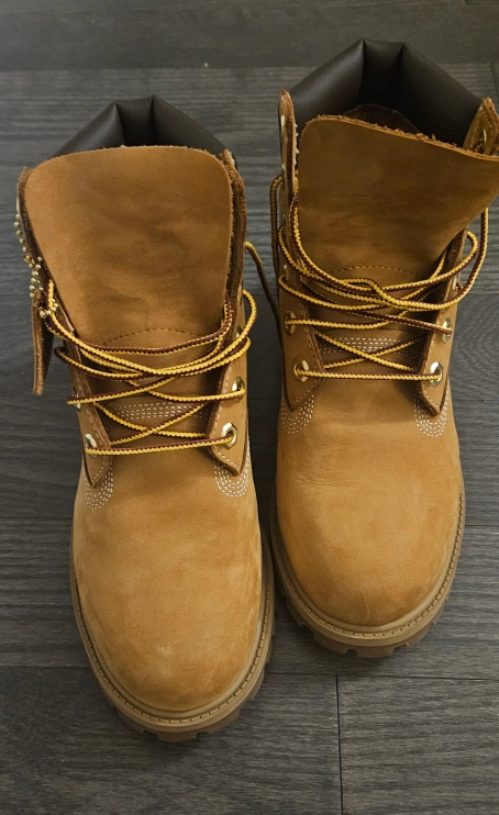 Classic Timberland 6-inch premium boots. Wheat nubuck leather. Yellow laces. Worn just once. Comes with original box.