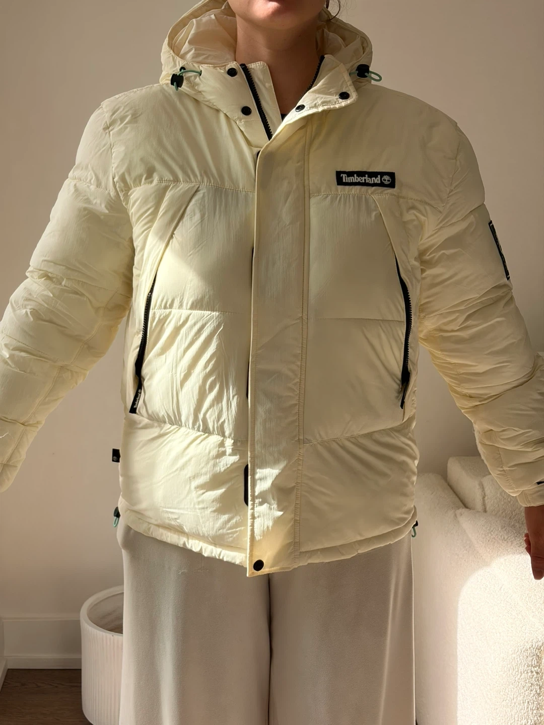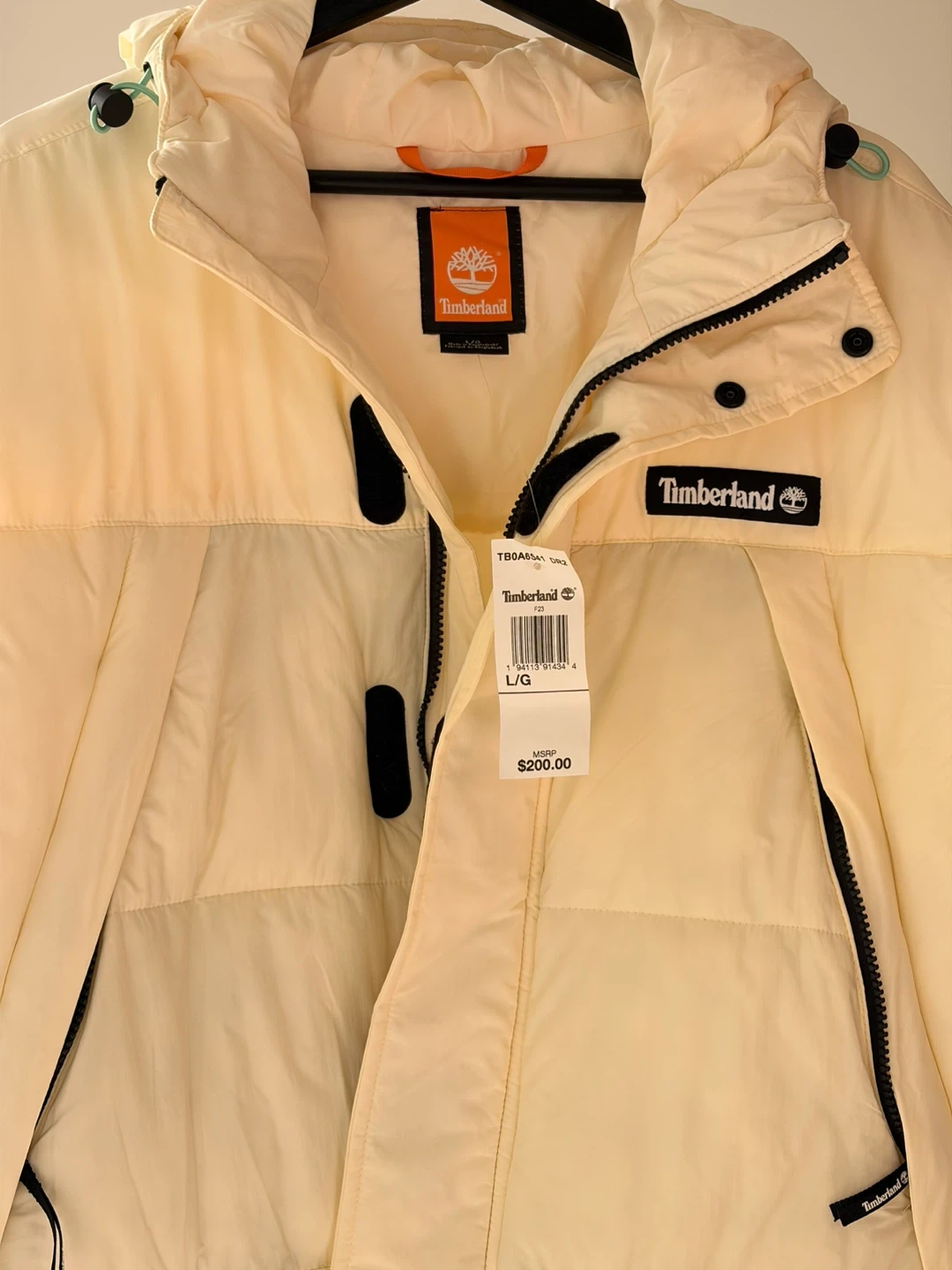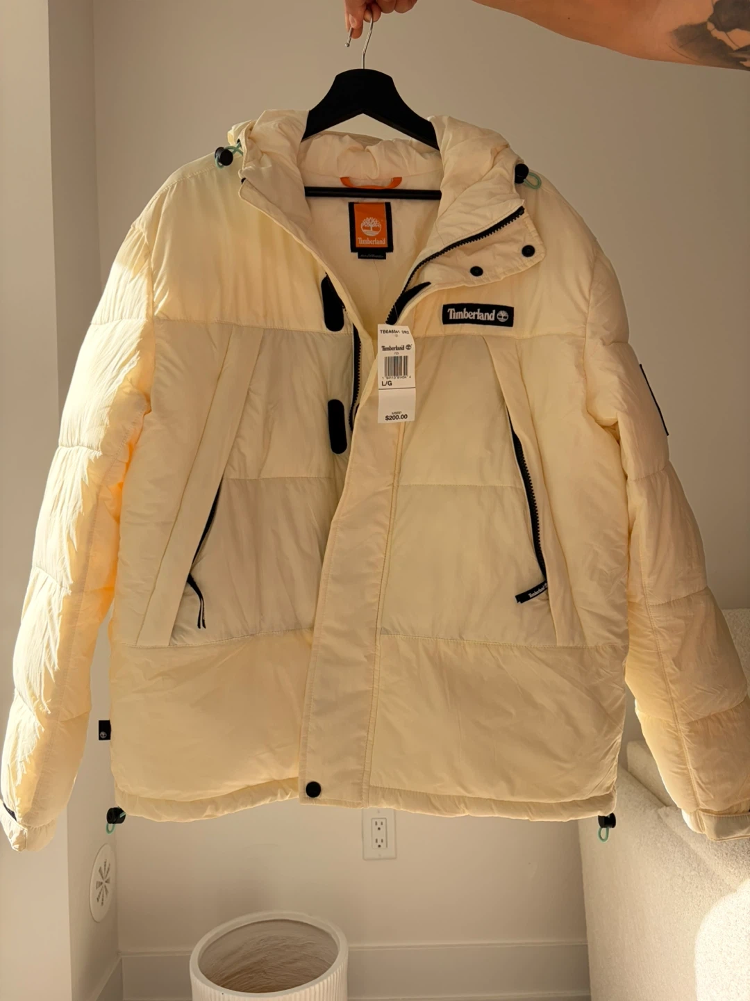 Selling a Timberland puffer jacket in cream color. It's a size L and originally bought for $200. It's in great condition and ready for a new owner!