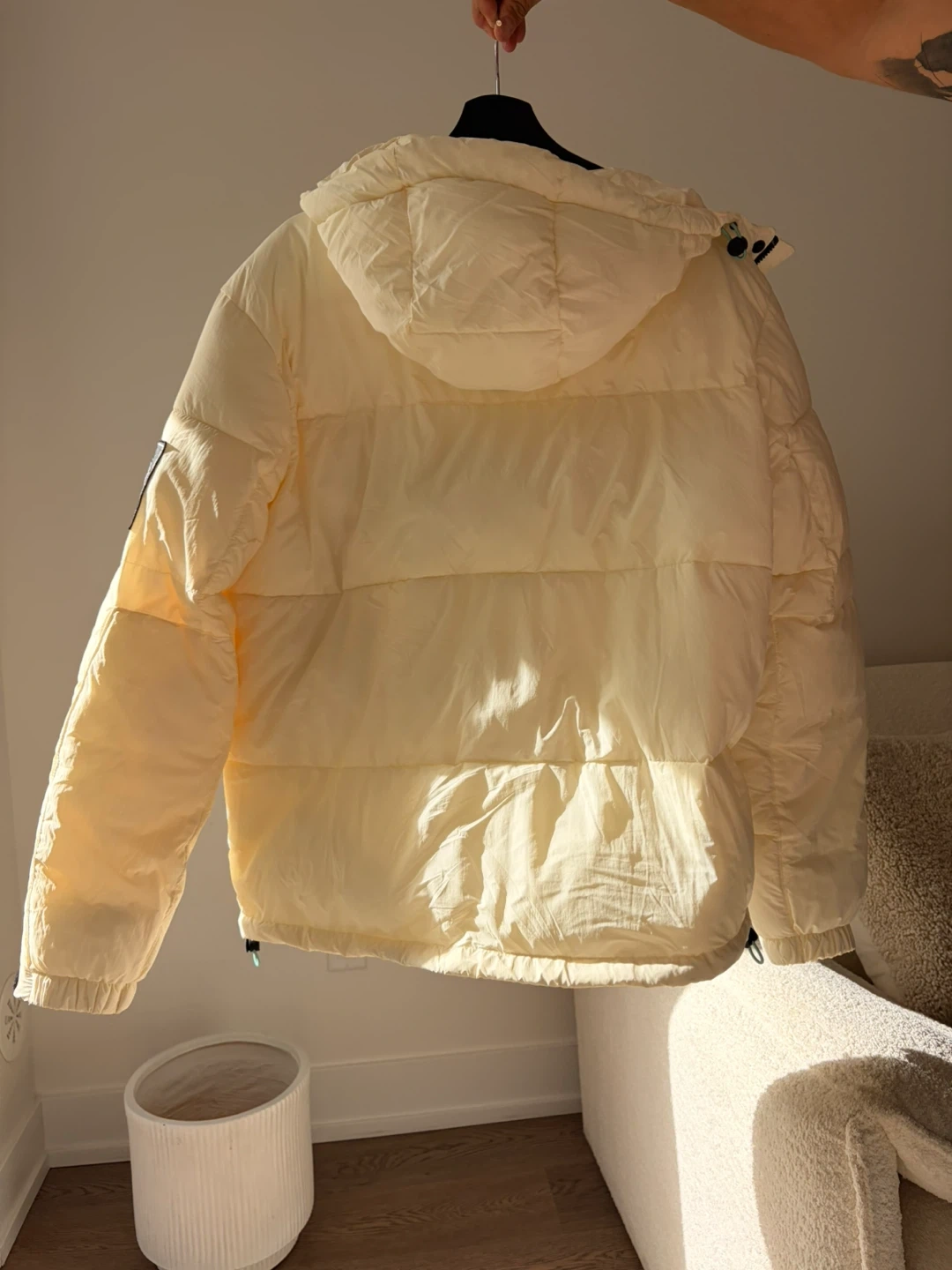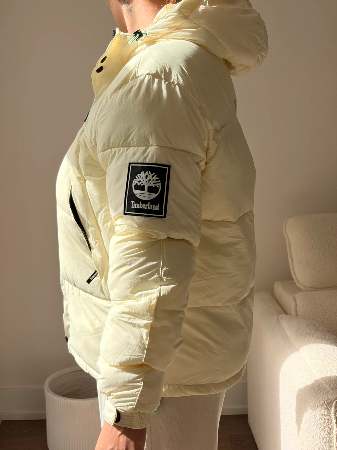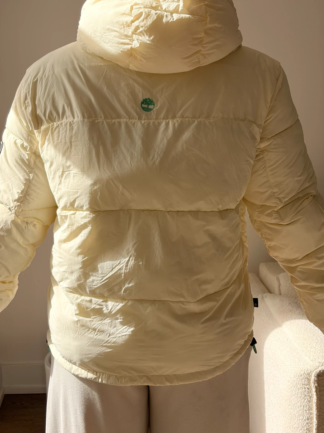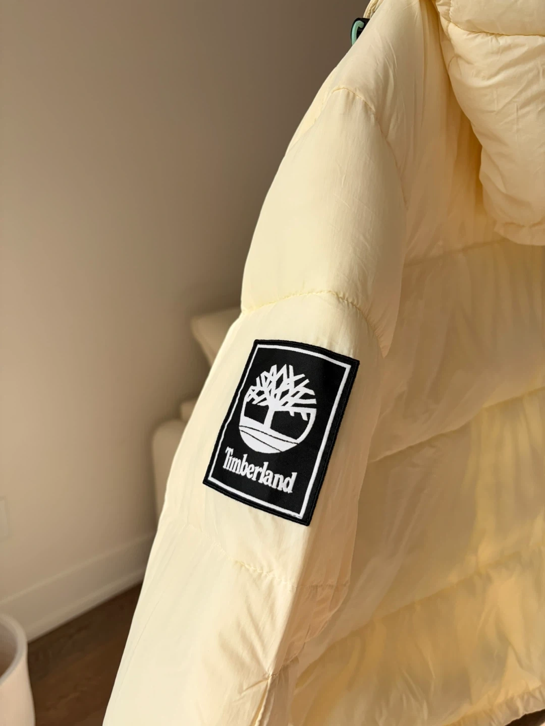 Selling a Timberland puffer jacket in cream color. It's a size L and originally bought for $200. It's in great condition and ready for a new owner!