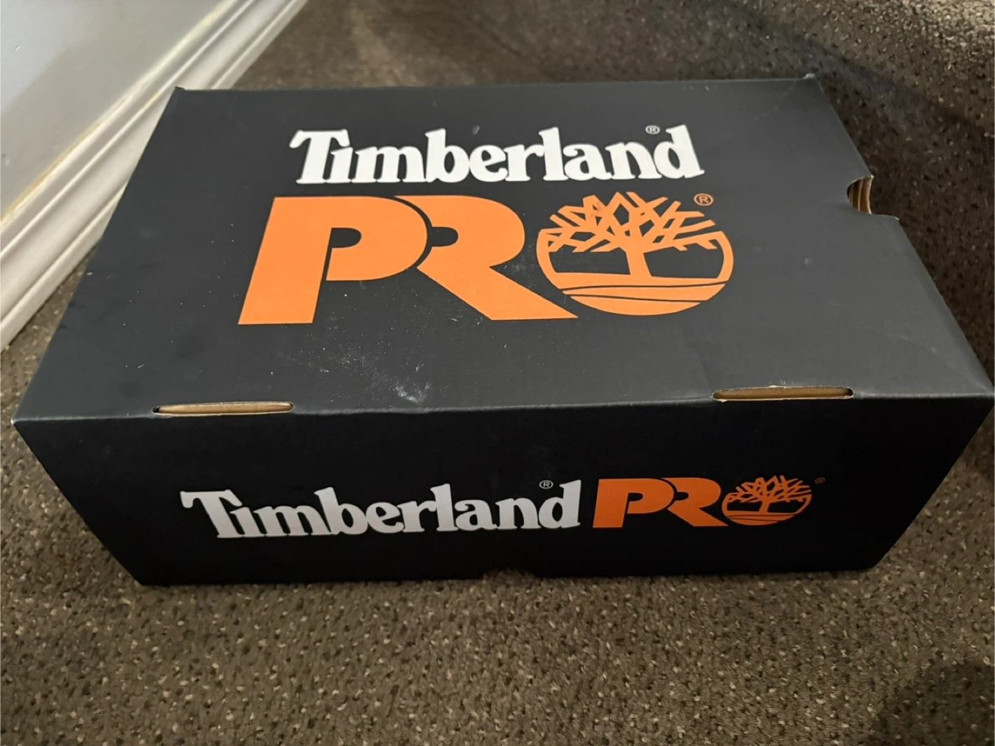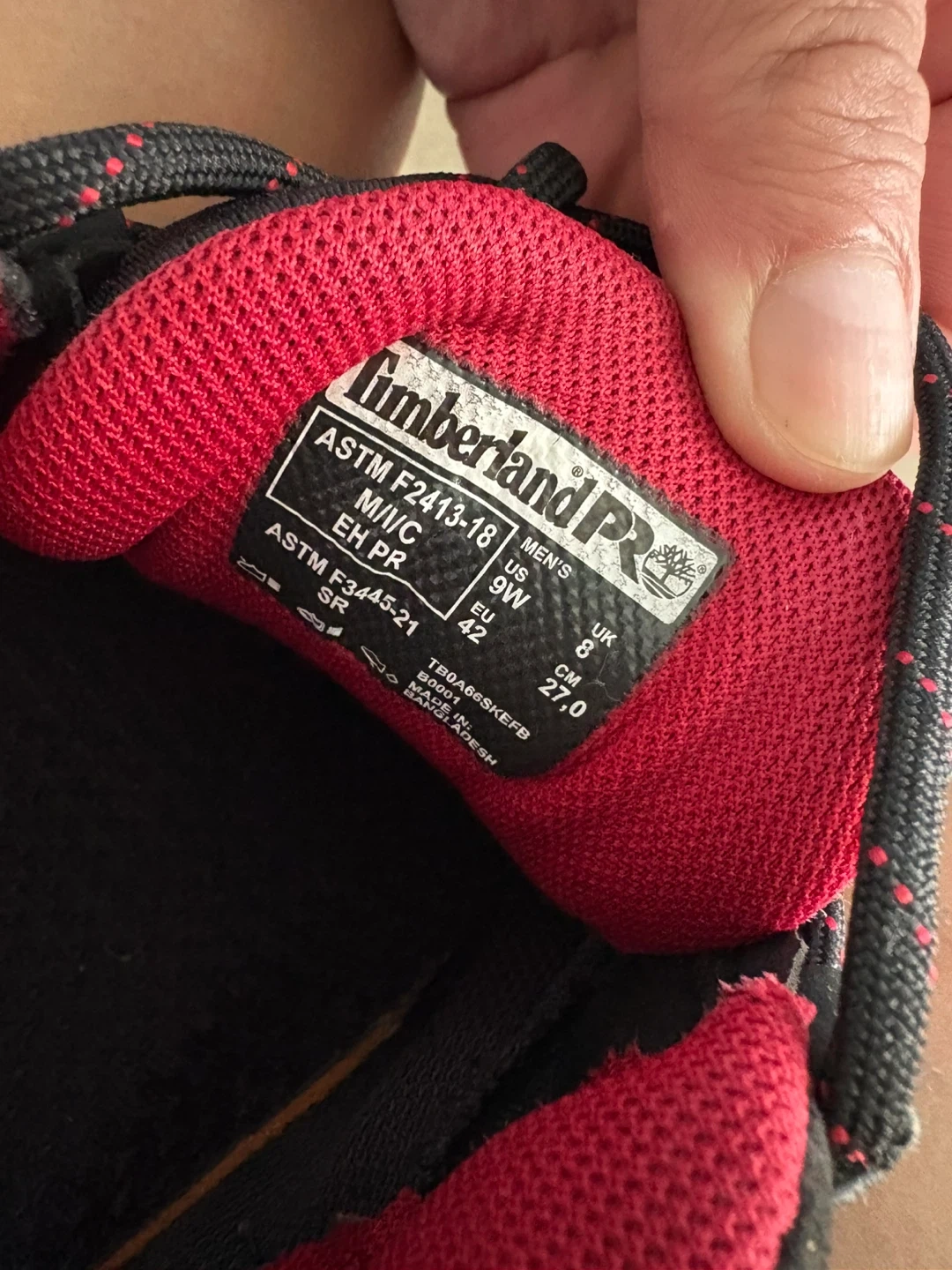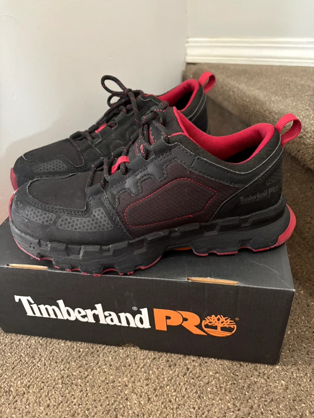 Selling a pair of Timberland Pro men's shoes in size 9W. They are black with red accents. The shoes come with the original box!