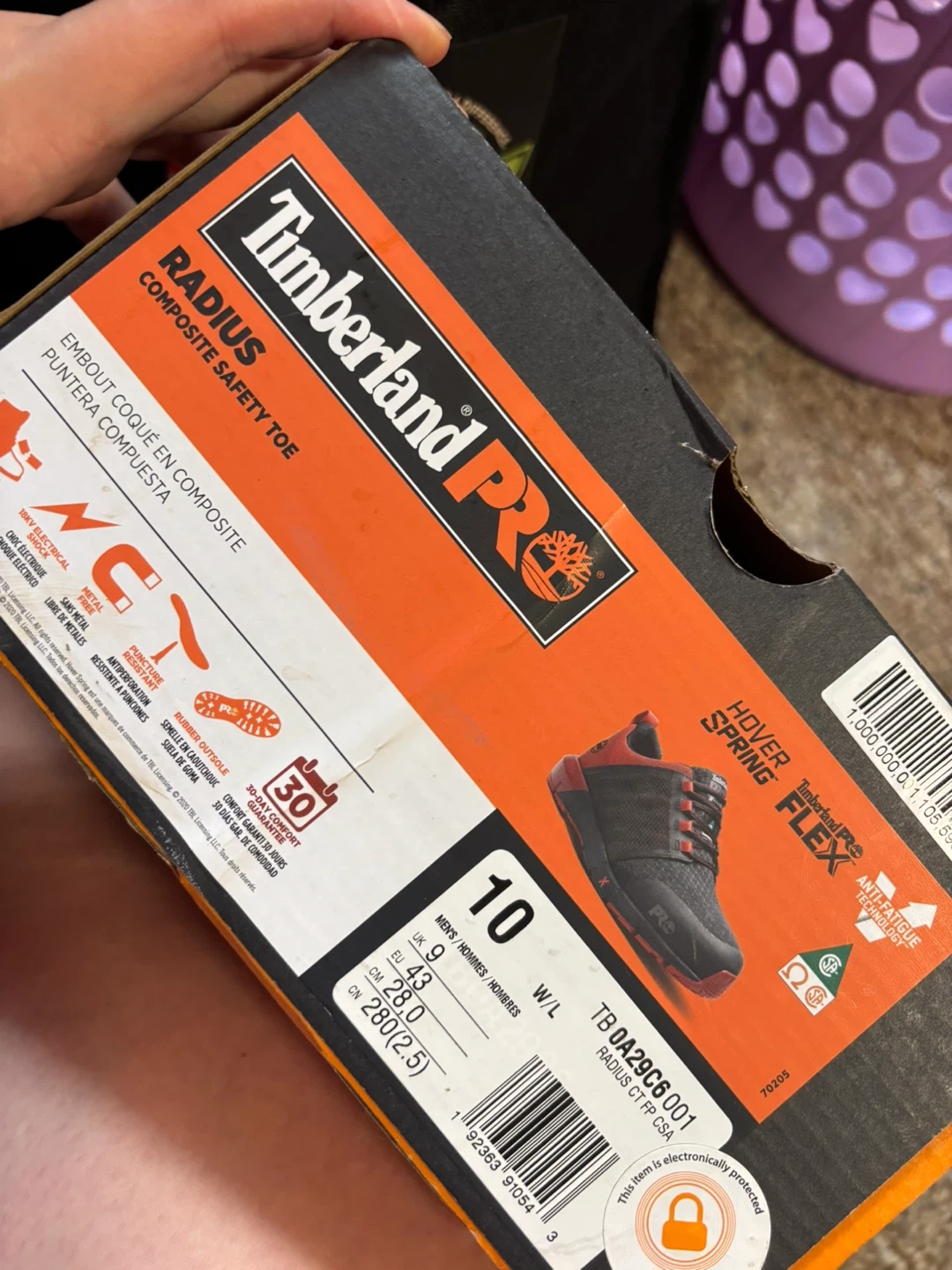 Selling a pair of Timberland PRO Radius composite safety toe work boots in size 10. These boots feature anti-fatigue technology and a Hover Spring Flex outsole for comfort. They have a composite safety toe and are designed for electrical hazard protection. The boots are in used condition but still have plenty of life left! Comes with the original box