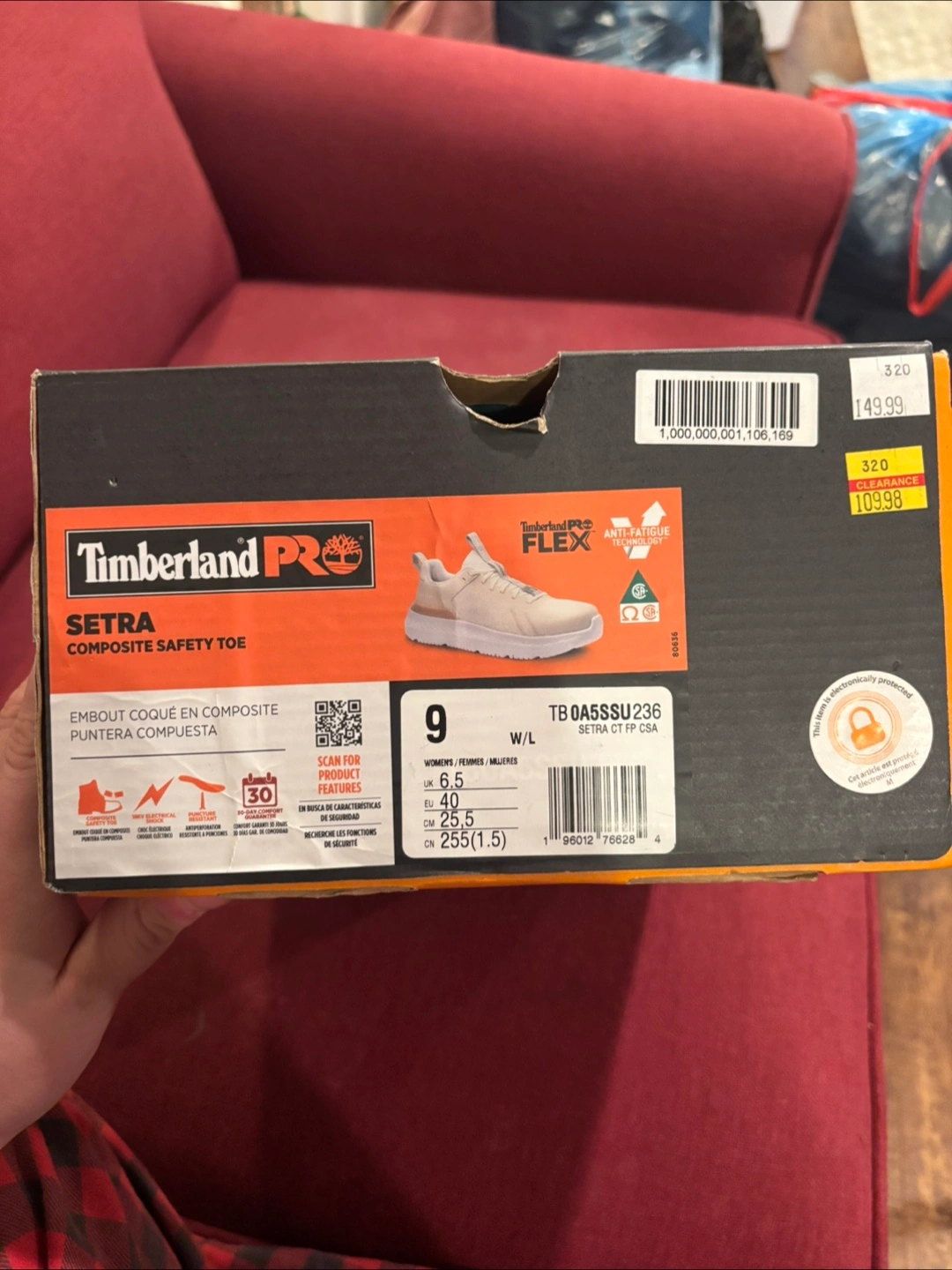 Selling a pair of Timberland PRO CSA Approved, composite toe shoes in tan. They are a women's size 9, wide. Originally bought for $109.98 (regular price $150!). The box is included! Only worn once but I work in a hardware store so they got pretty dirty. They were just very uncomfortable for me so I found a better pair and forgot about these until waaay past the return date.