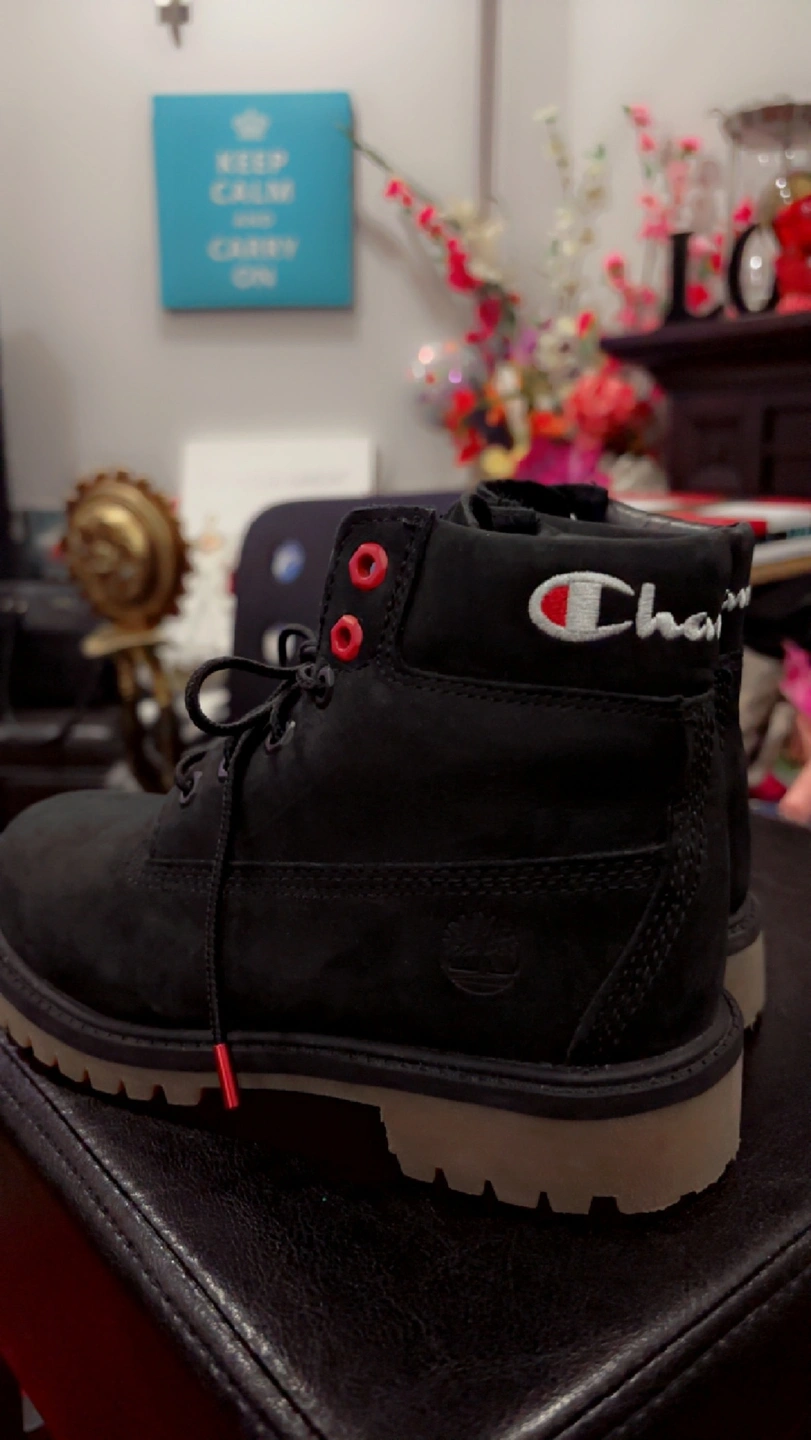 Black Timberland boots with Champion branding. Size 1 new without tags, only tried on was over $200 selling for $85