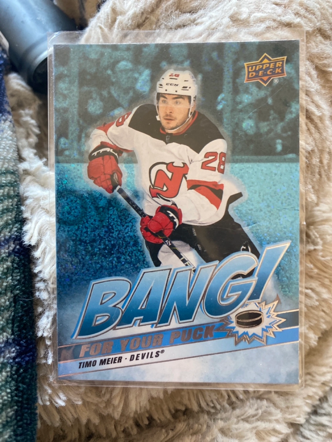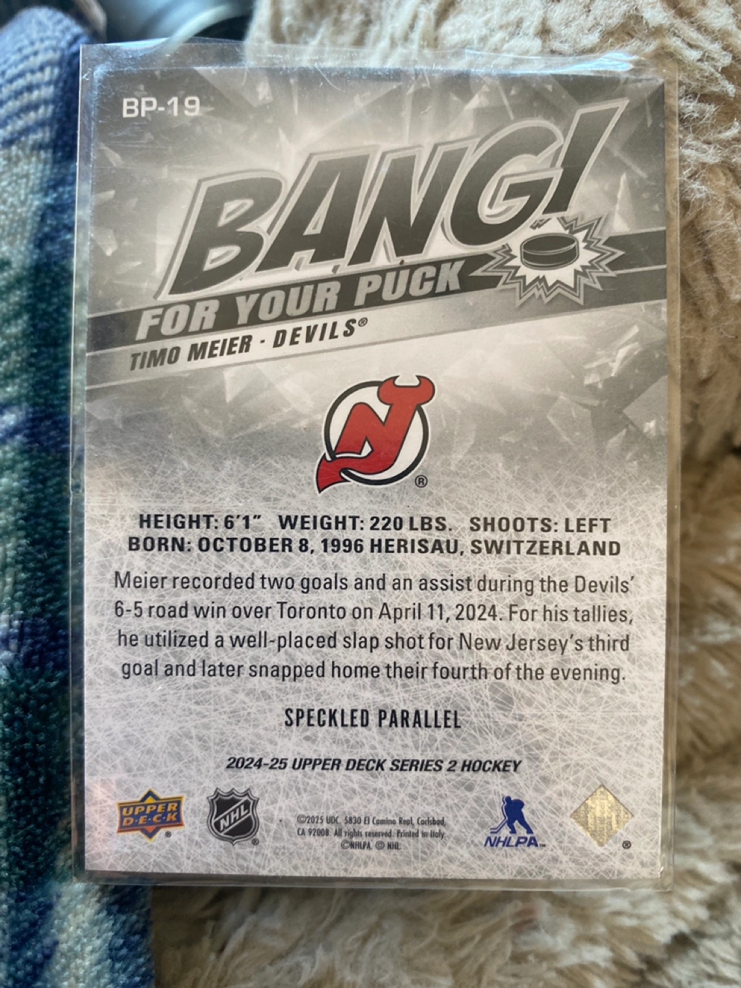 Selling a Timo Meier Devils Upper Deck hockey card from the 2024-25 Upper Deck Series 2 Hockey collection. It's a Speckled Parallel card featuring player stats and highlights from his time with the Devils.