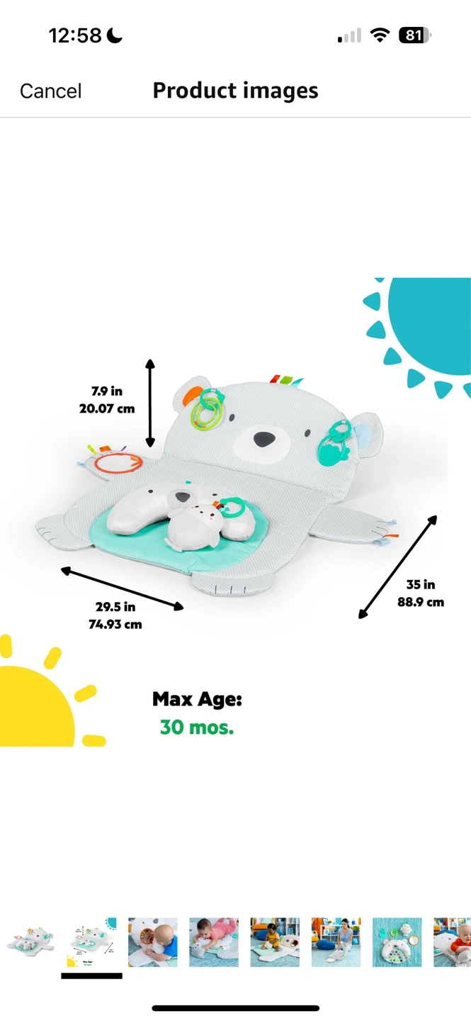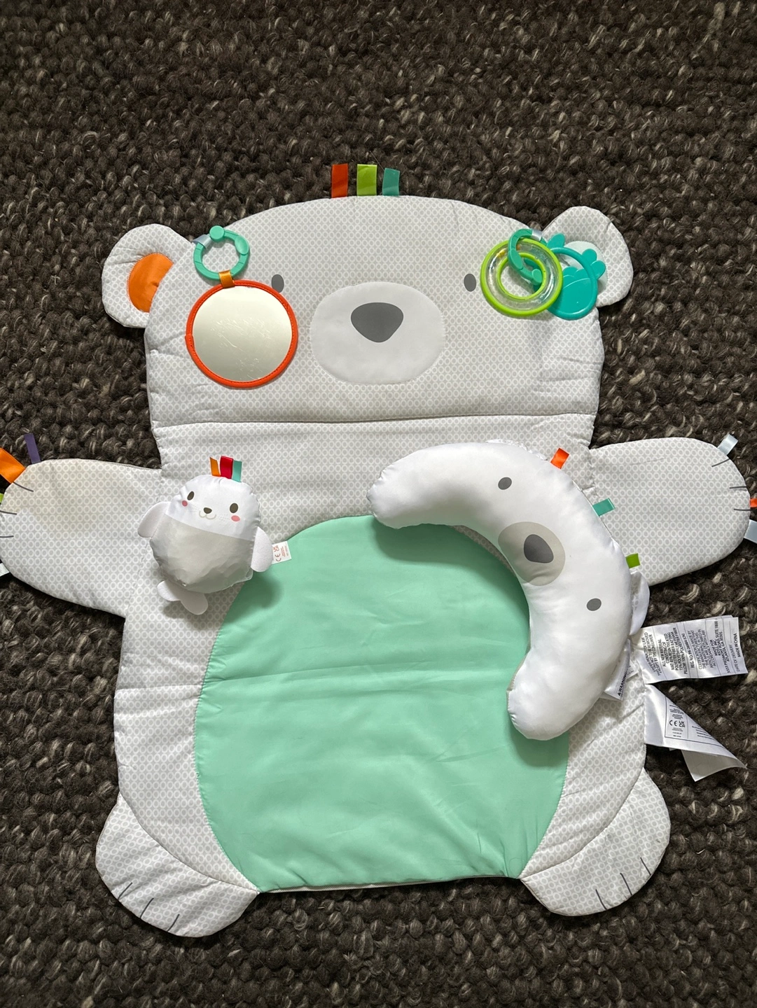 Bright Starts baby playmat. Features a polar bear design. Includes a detachable head support and various sensory toys. Great for tummy time and playtime. Used once. Received as a gift but put it away and forgot about it.