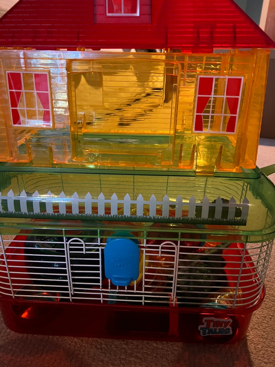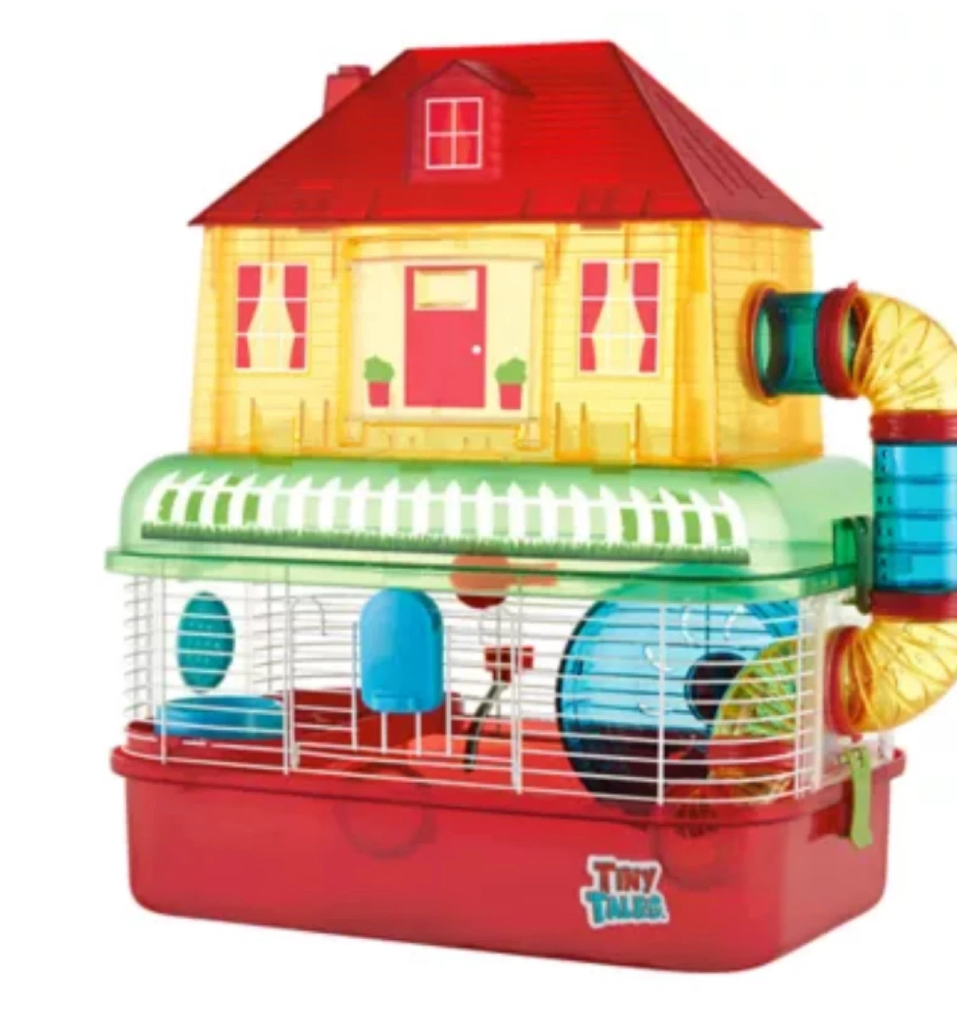 Selling a Tiny Tales hamster cage! This fun and colourful cage is perfect for your little friend. It comes with tubes, a house, and a running wheel.