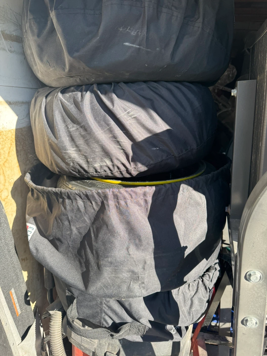 Selling a tire with a rim. It comes with a Motomaster cover. The tire has some wear and tear but is still in good condition