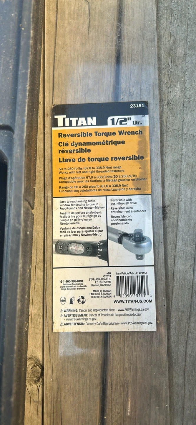 Selling a Titan 1/2" Dr. reversible torque wrench! It works with both left and right-threaded fasteners. Comes with an easy-to-read analog scale in both foot-pounds and Newton-meters.