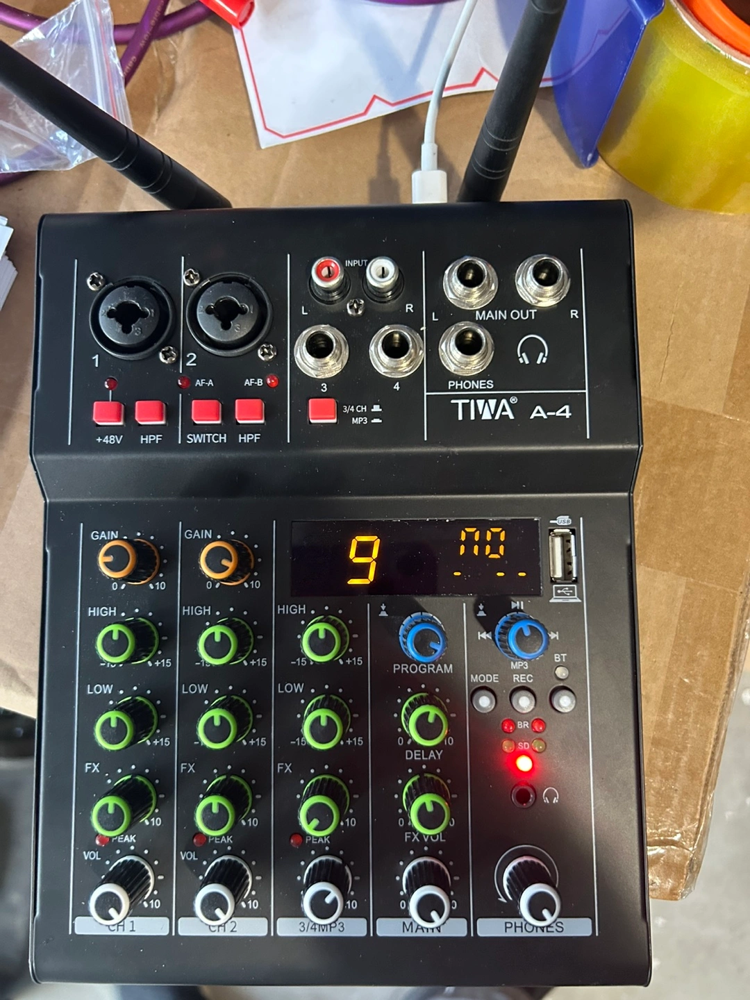Selling a TIWA A-4 audio mixer. It comes with microphones and is in good condition. Great for karaoke or small events!