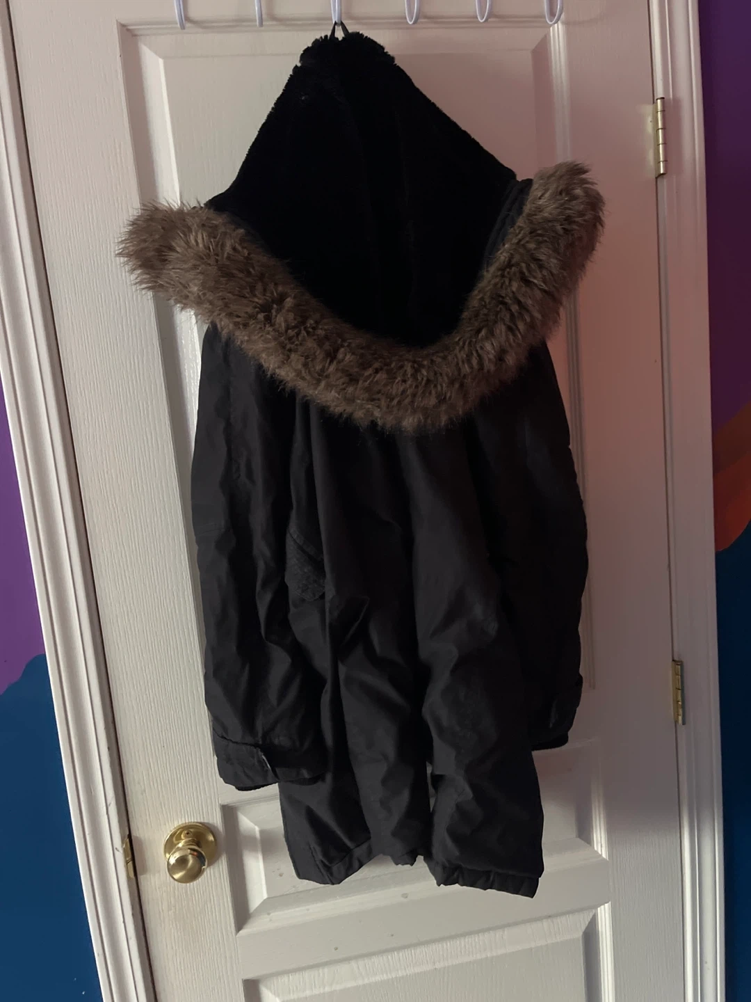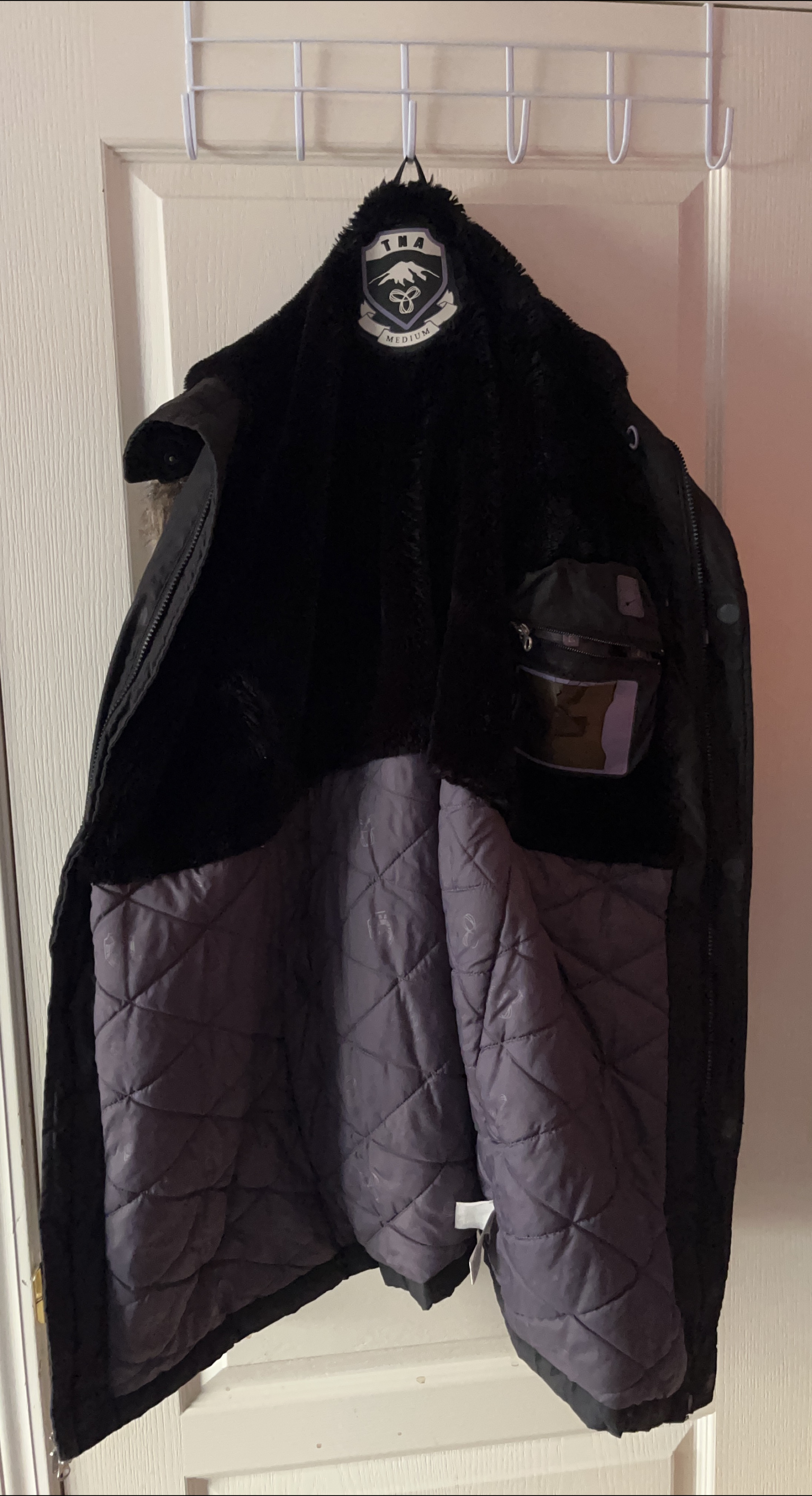 Selling a TNA winter jacket in black, size medium! It's in good condition and perfect for the cold weather. The jacket features a faux fur trim on the hood and a quilted lining for extra warmth.