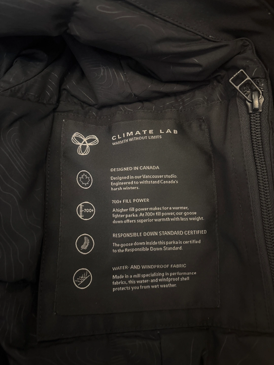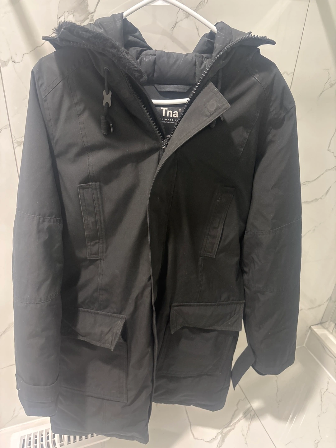 Selling a TNA Climate Lab parka in black. This parka is designed in Canada to withstand Canada's harsh winters. It features 700+ fill power, offering superior warmth with less weight. The goose down inside this parka is certified to the Responsible Down Standard. It's made with water and windproof fabric, protecting you from wet weather