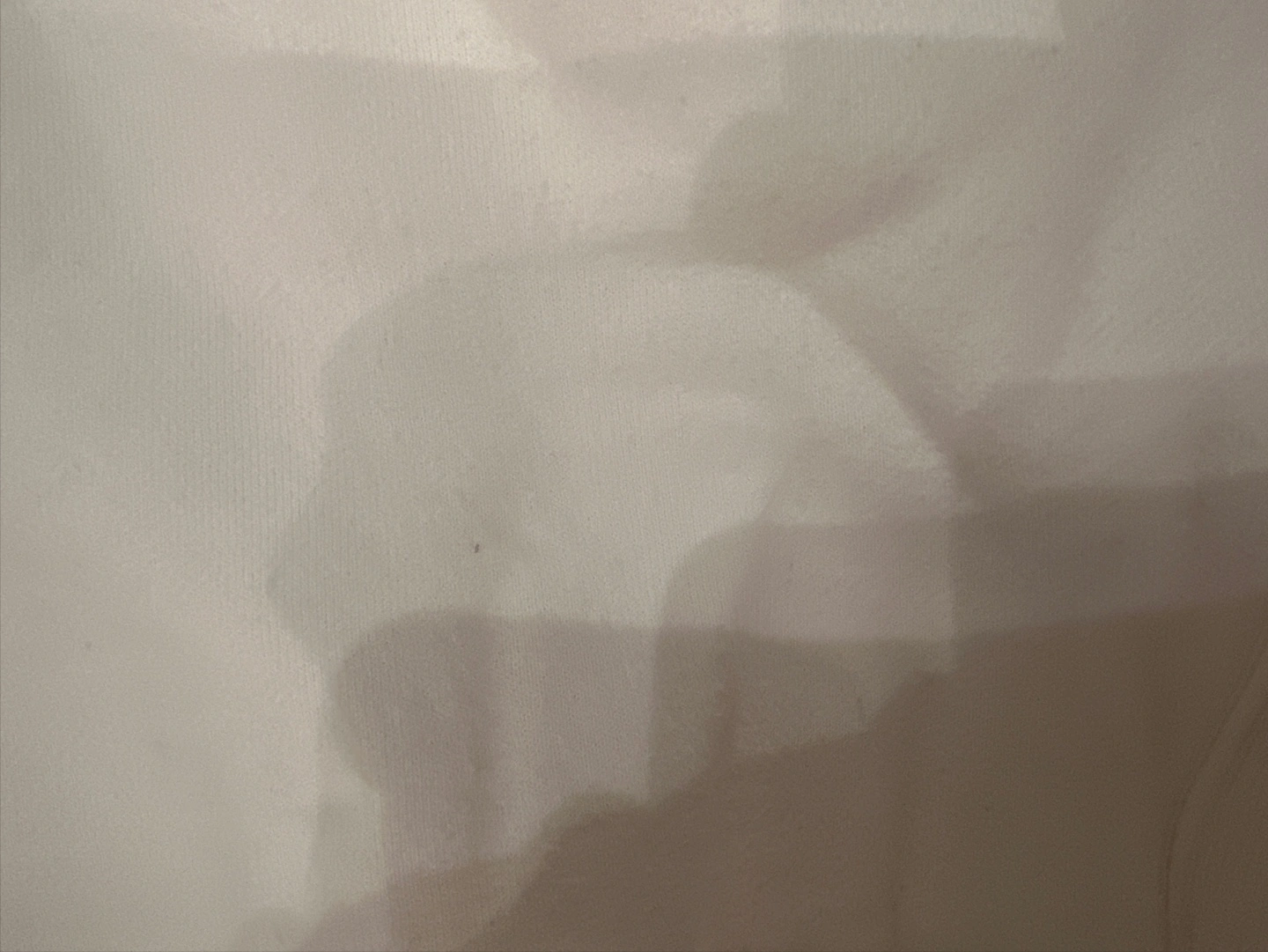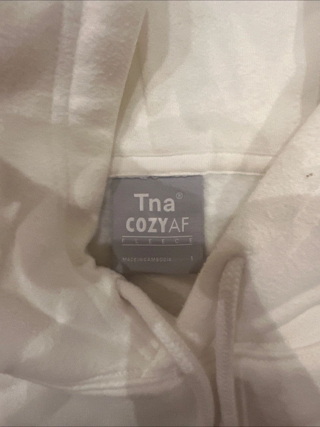 White, cropped length. Features long sleeves and a hood with a drawstring. The material is soft and comfy. Perfect for feeling cosy on a relaxing day.