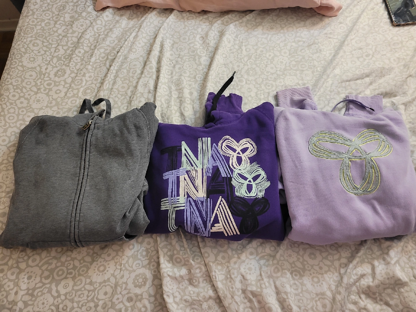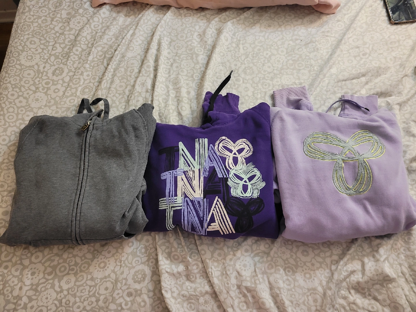 Selling a bundle of three TNA hoodies! Included are: - Grey zip-up hoodie (size m) - Purple graphic hoodie (size L) - Light purple hoodie (size L) All in great condition and ready for a new home 25 each or all for $60