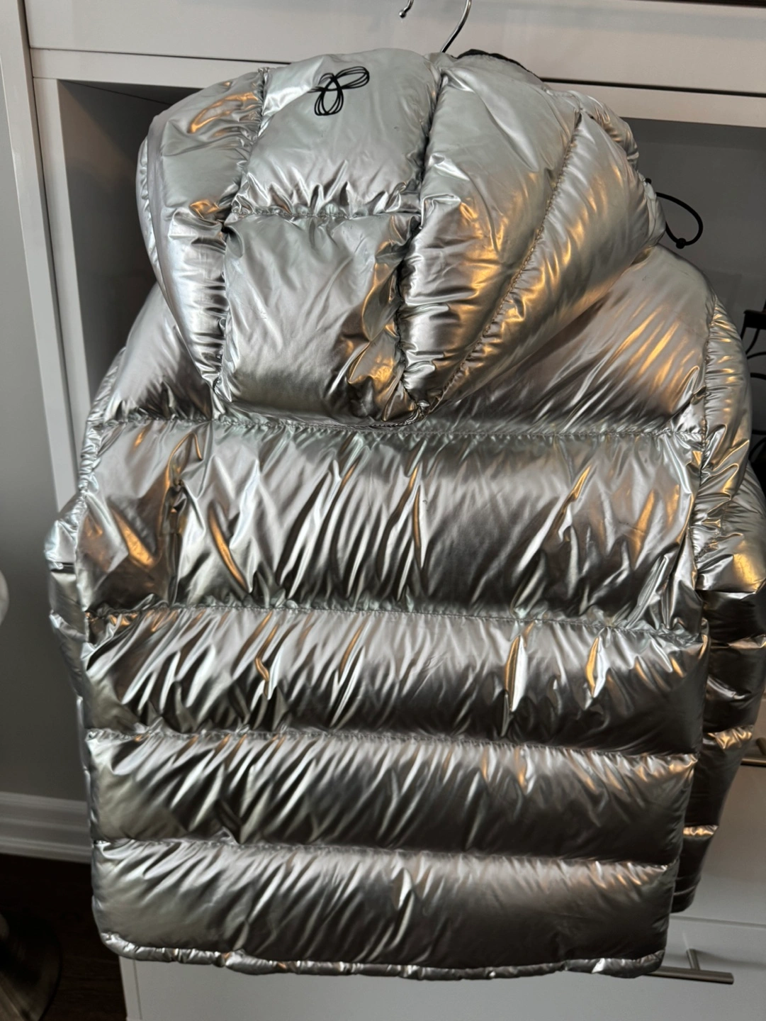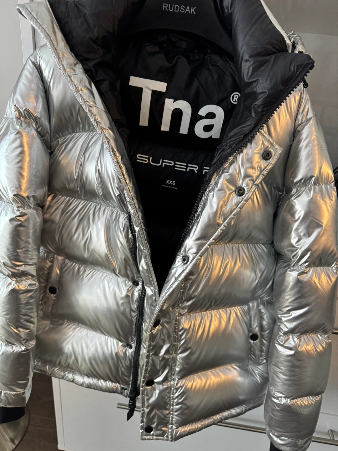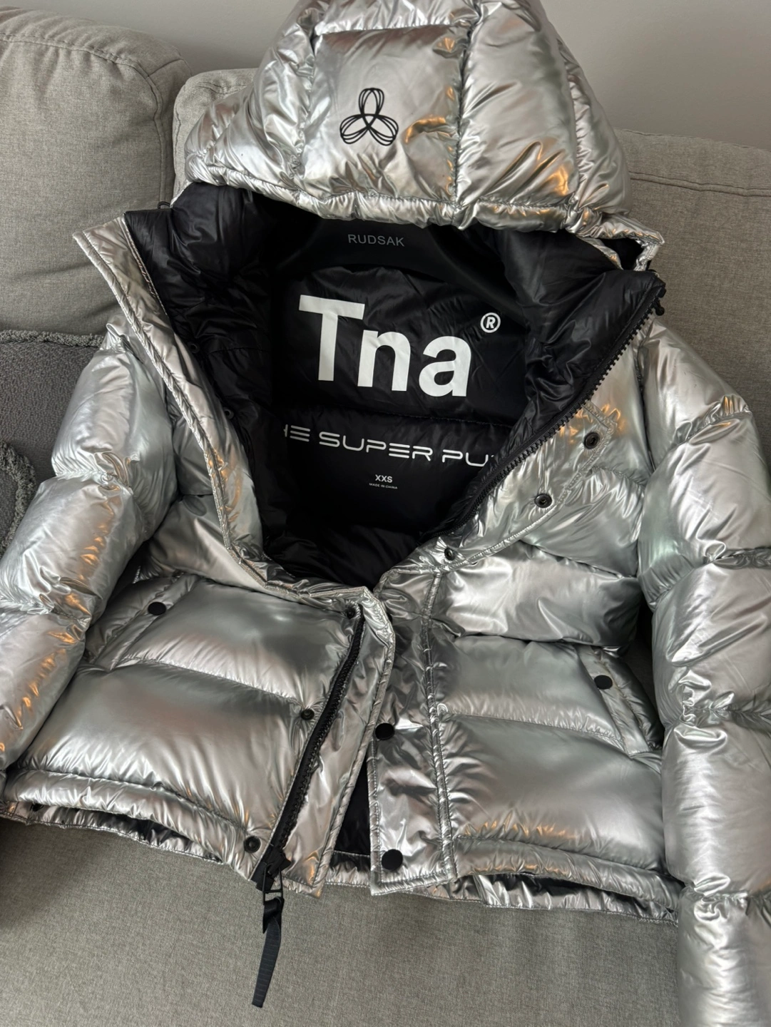 Silver Tna Super Puff jacket. Size XXS. Features a hood. Sold by Aritzia