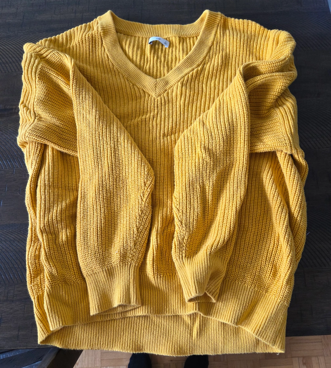 Cozy TNA sweater in a lovely mustard yellow colour! It's a V-neck style and size small. Perfect for layering or wearing on its own. In great condition! Get ready and cozy this fall with this vibrant sweater.