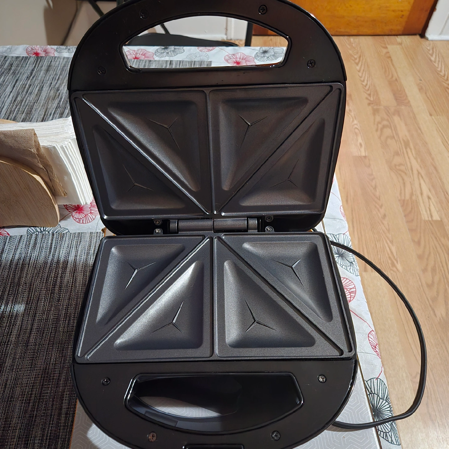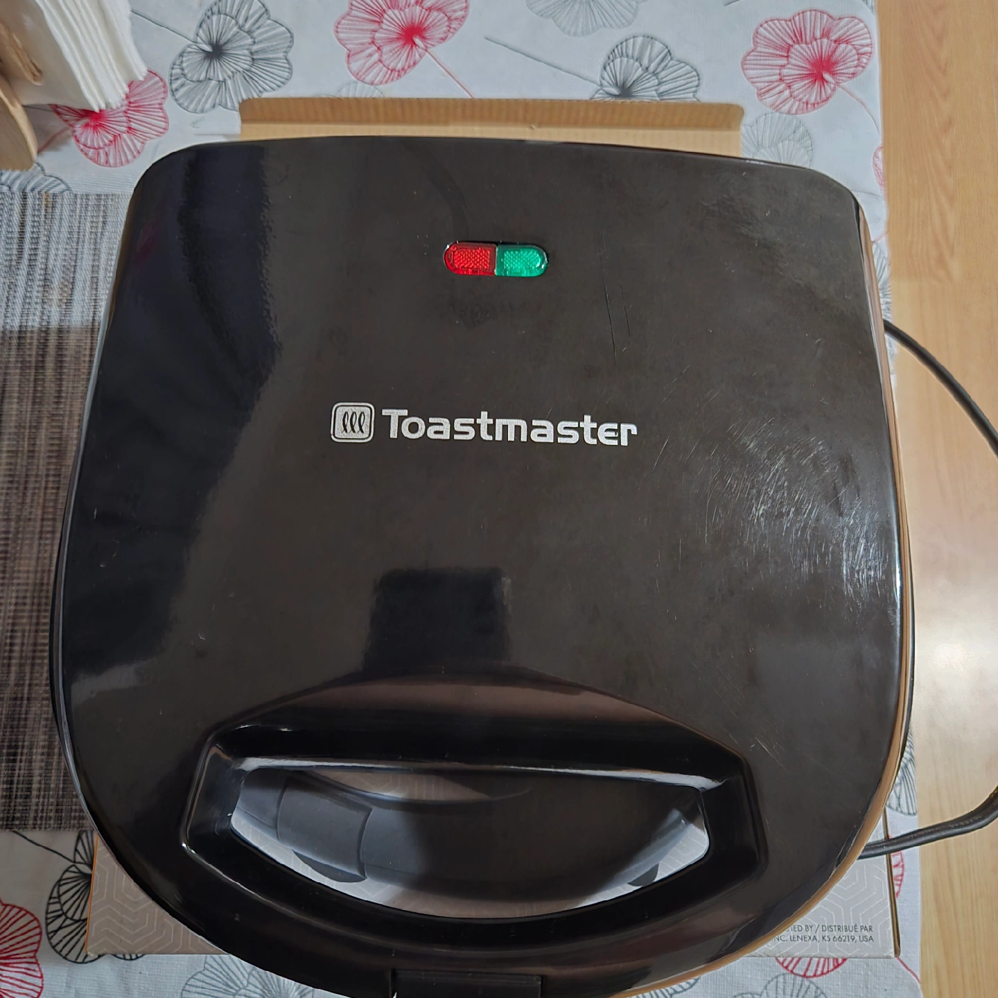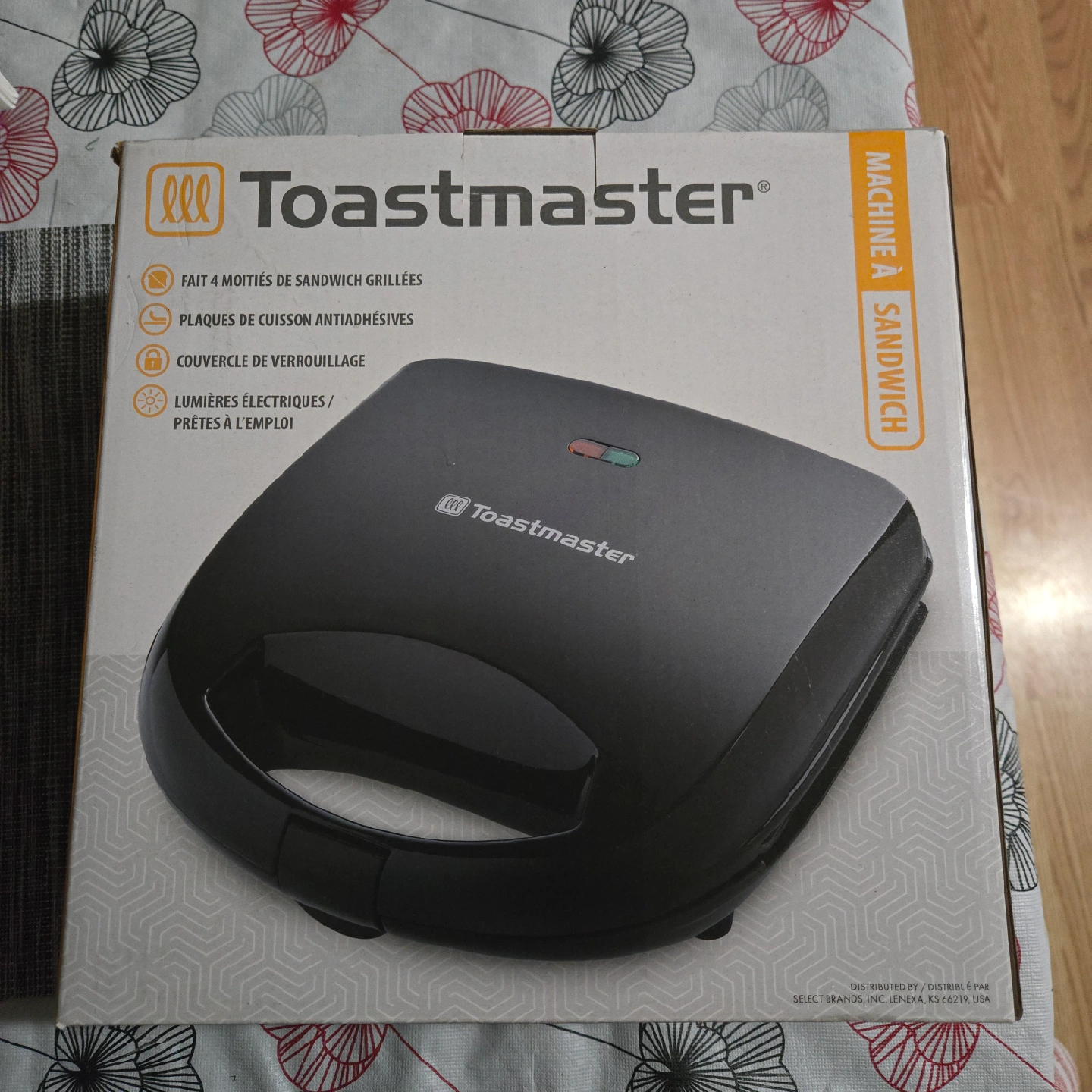 Selling a Toastmaster sandwich maker! It makes 4 sandwich halves and has non-stick cooking plates for easy cleanup. The lid locks for secure cooking.