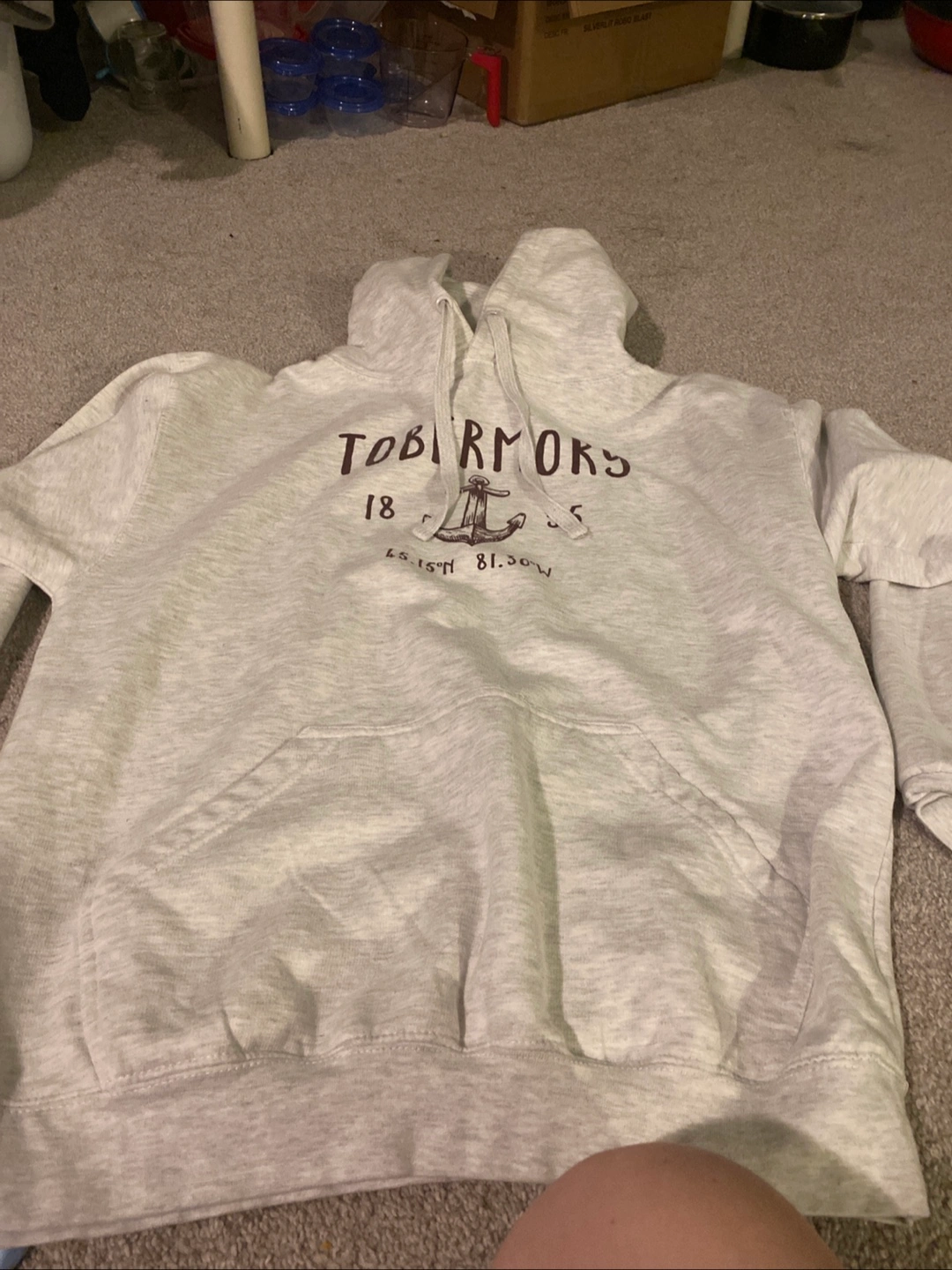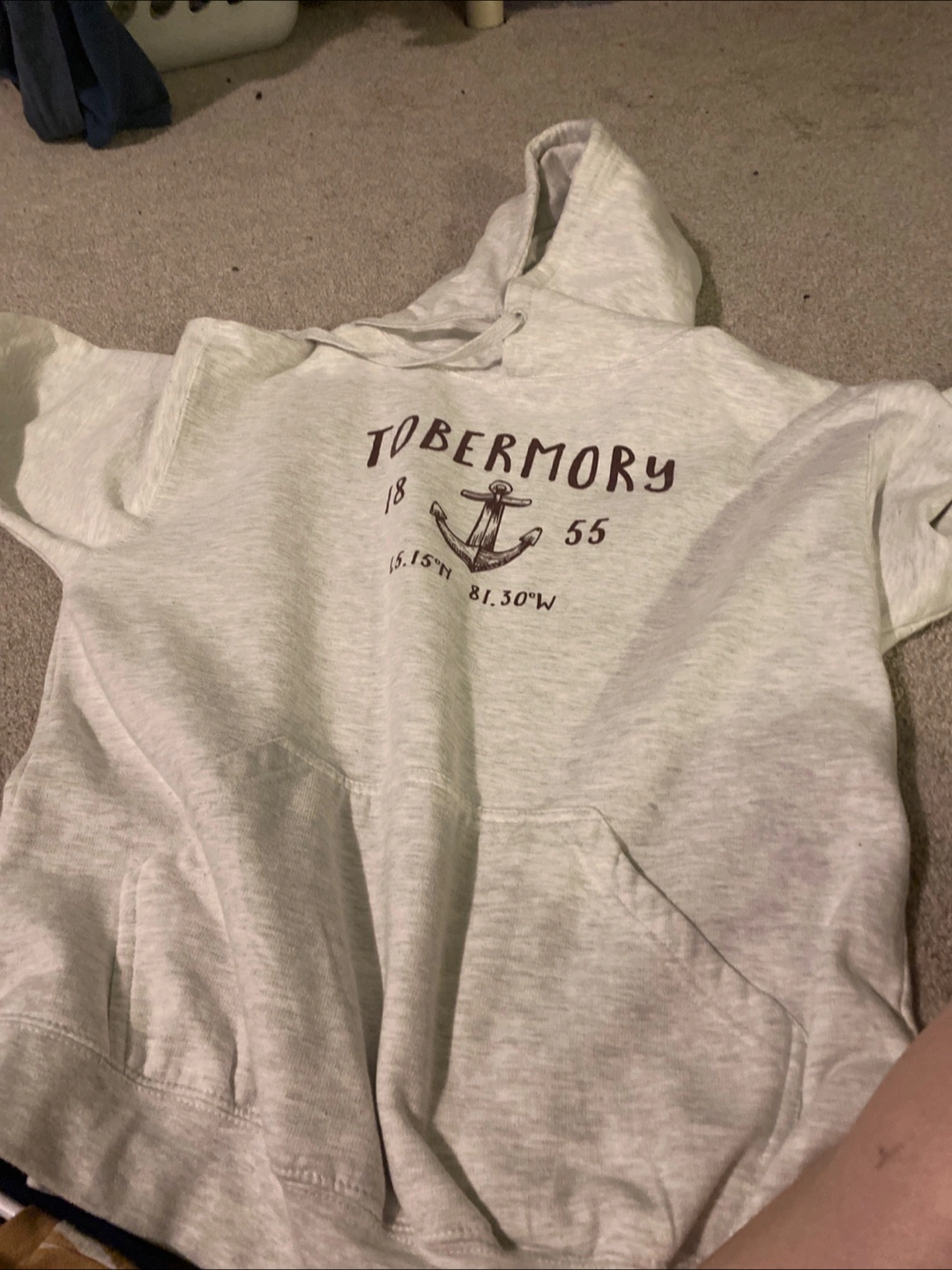 Cozy Tobermory hoodie in a size medium! It's in great condition and ready for a new home. Perfect for chilly evenings or casual wear. The design features the town name and an anchor. If you love Tobermory, this hoodie is for you!