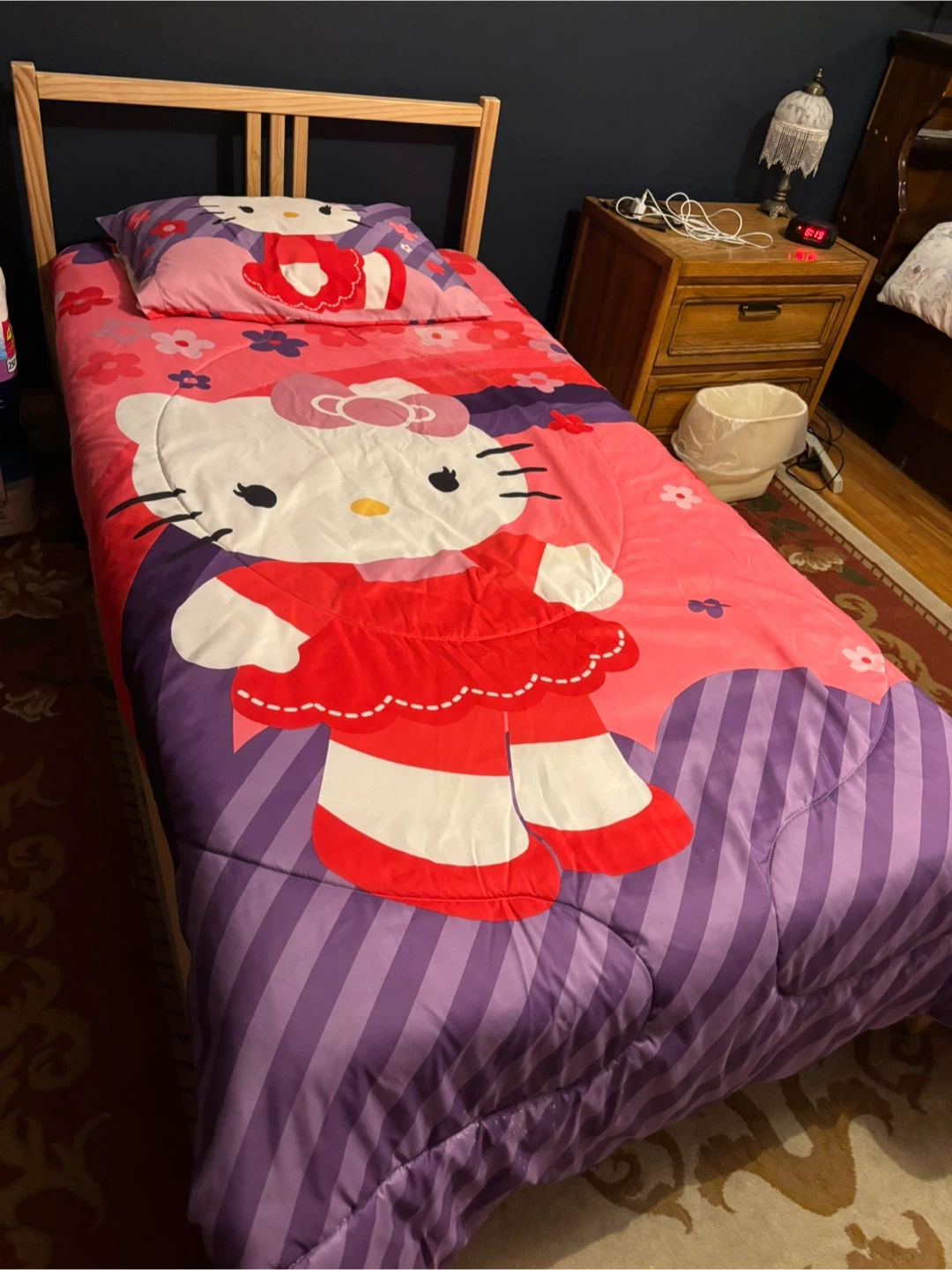 Great transitioning toddler bed that comes with Hello Kitty sheets set and comforter. A little girls dream.