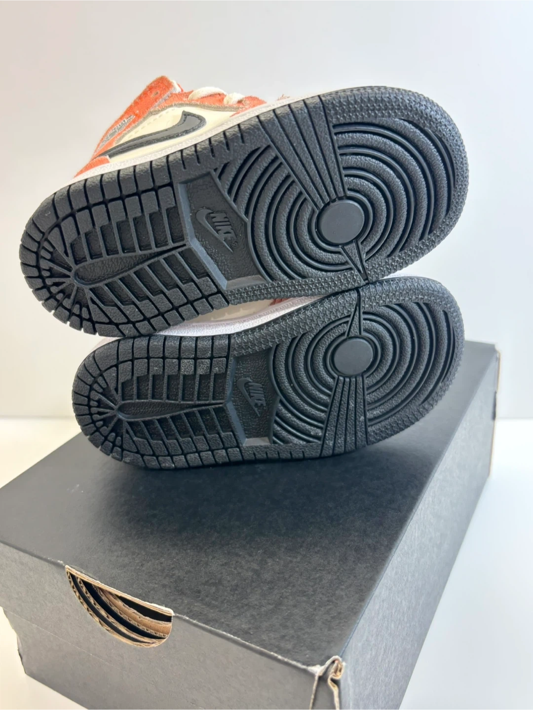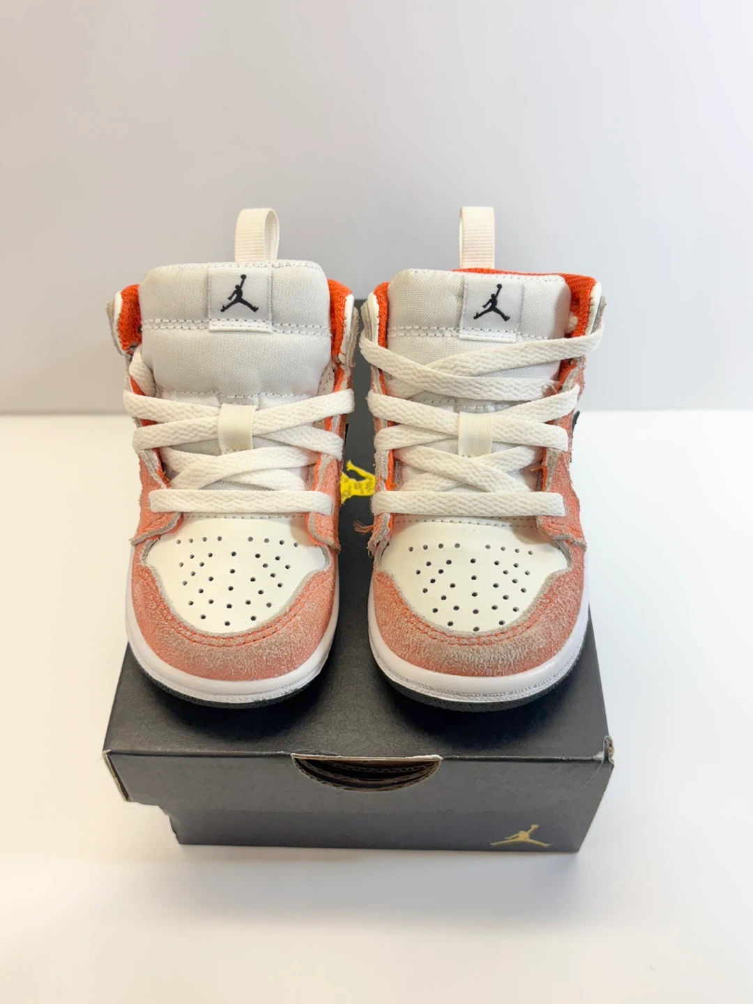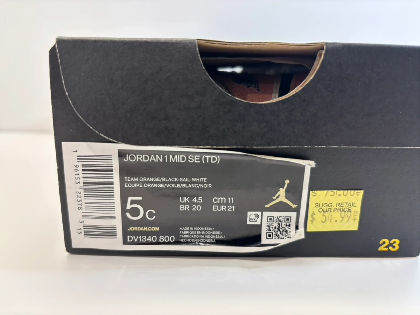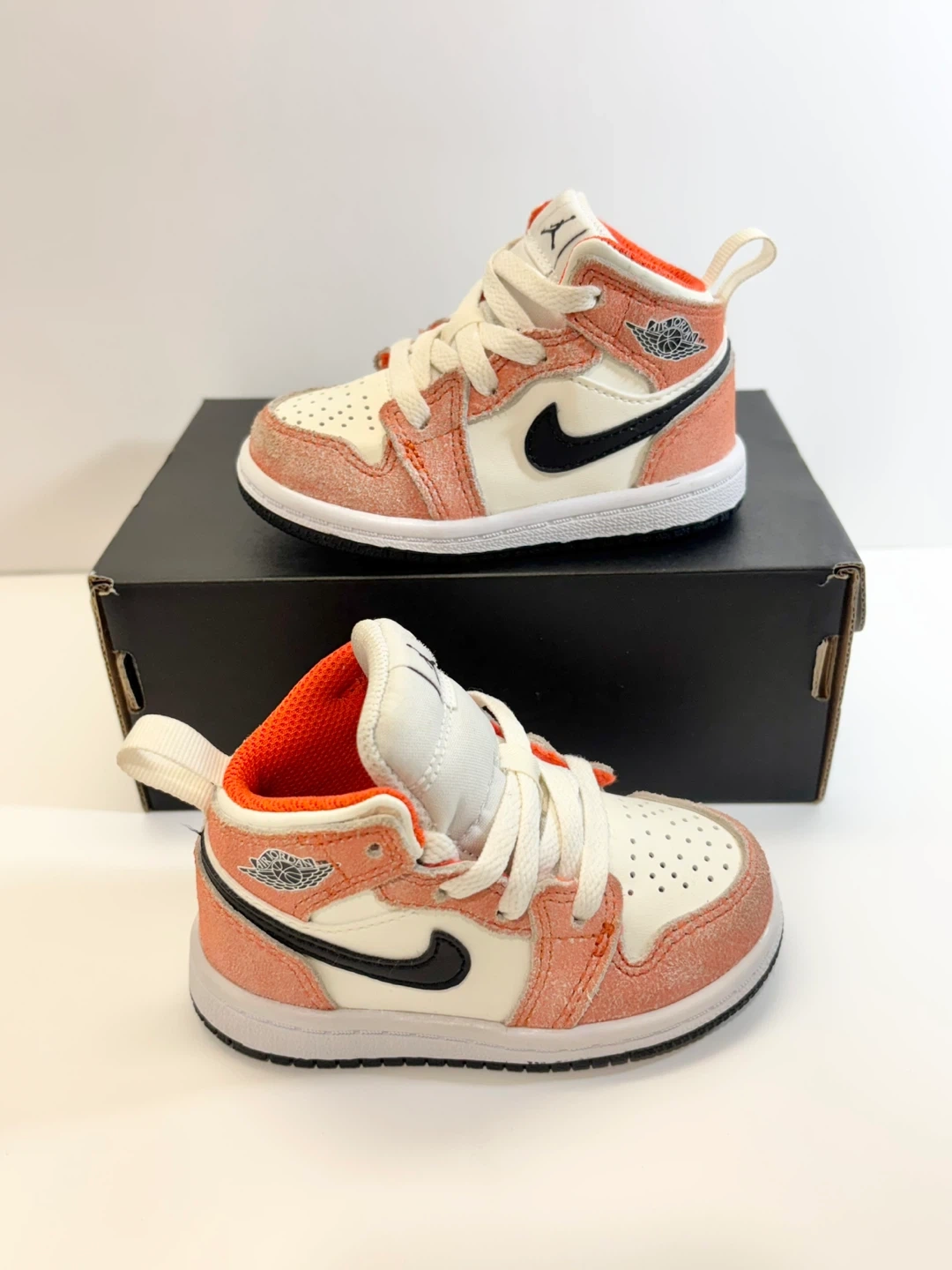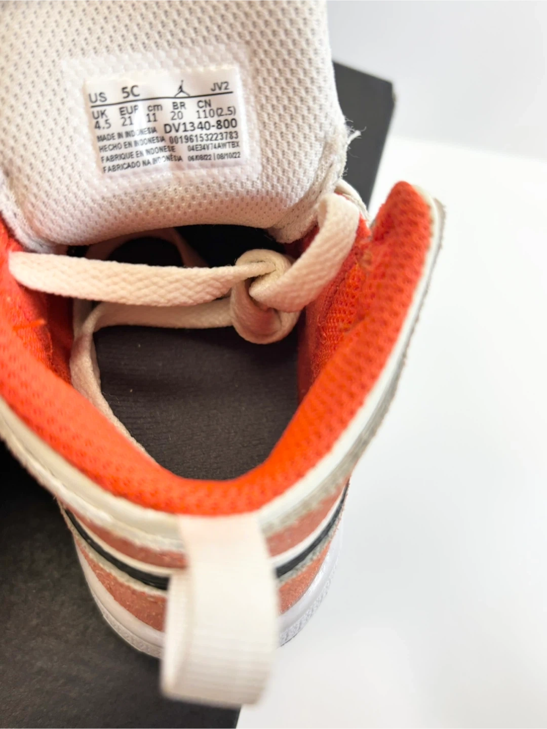 Clean and in like new condition Comes with the original box! Toddler size 5 or size 5c ( roughly fits ages 1-2 year old ) These adorable Jordan 1 Mid toddler shoes Team Orange , Black , Sail White . Was $54.99 in store