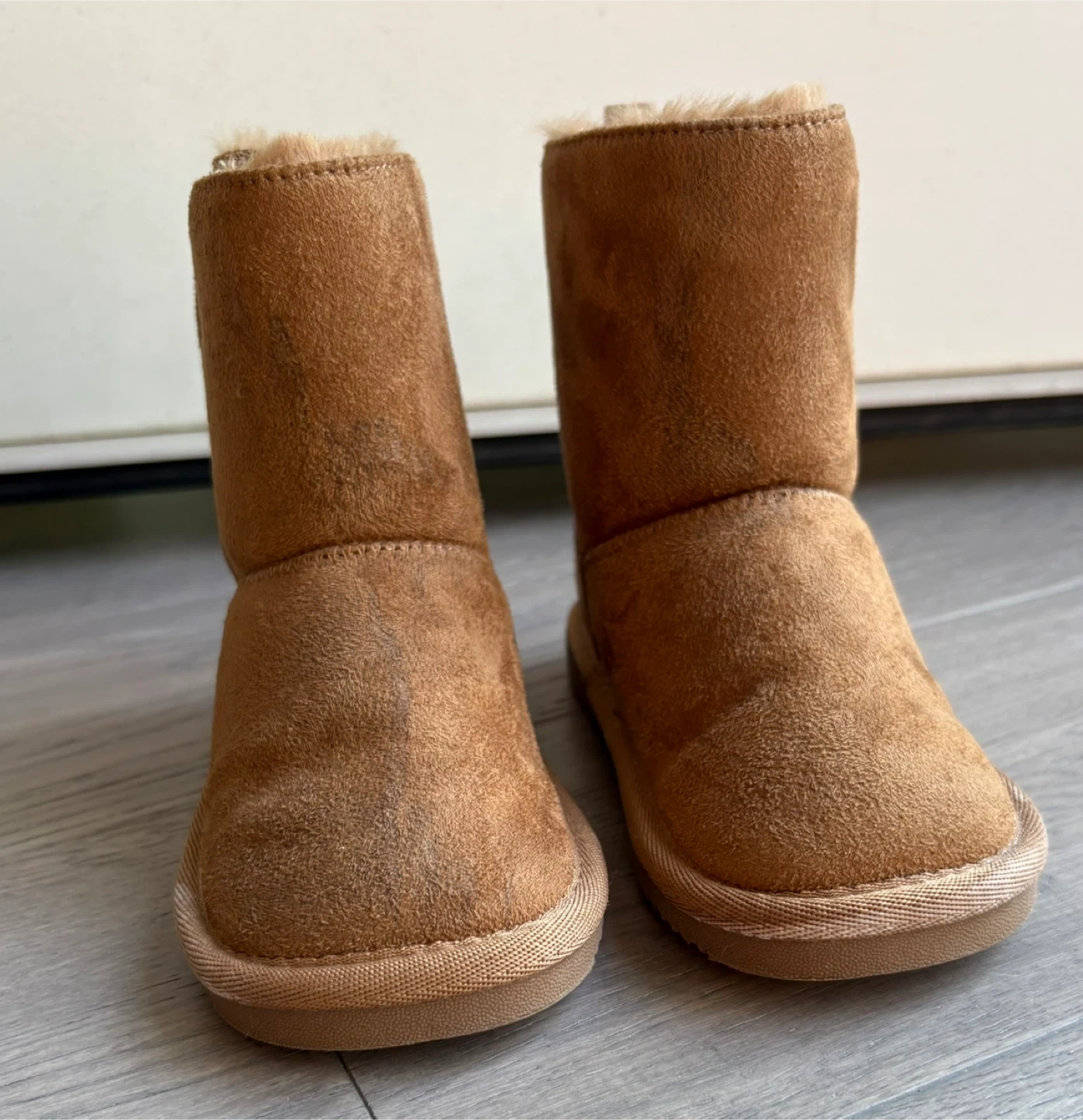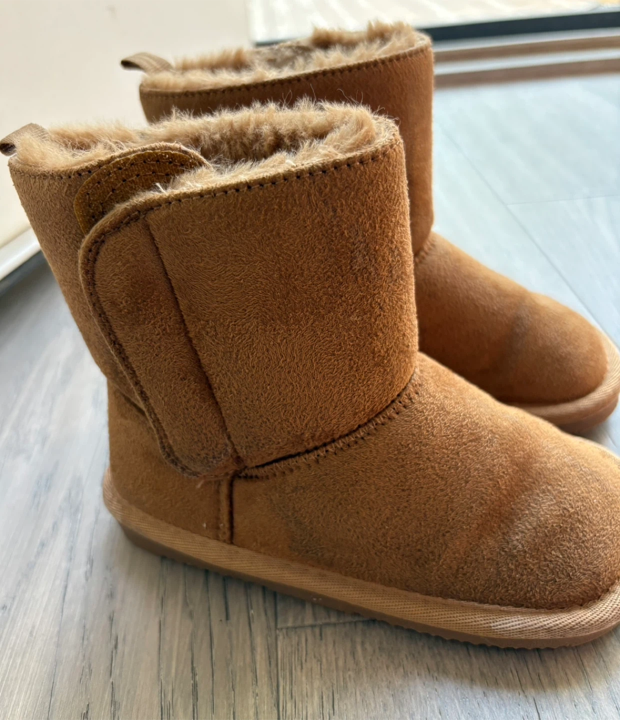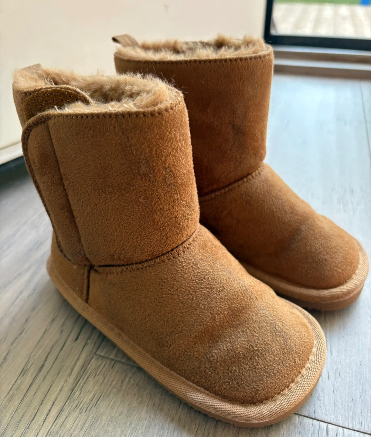 - A pair of brown, suede-like winter boots. - They are in good condition and ready to keep a little one's feet warm this winter! - They have a soft, furry lining.