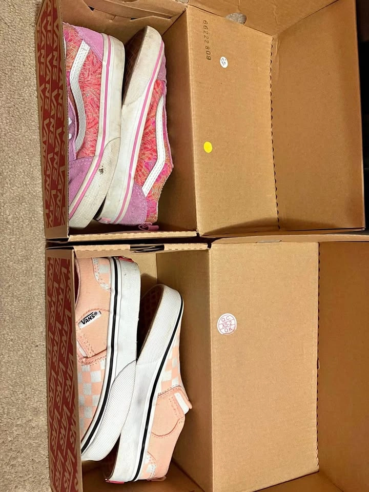 Checkered only worn twice. Purple well loved. Both need a good cleaning but lots of life left in them. Both for $20