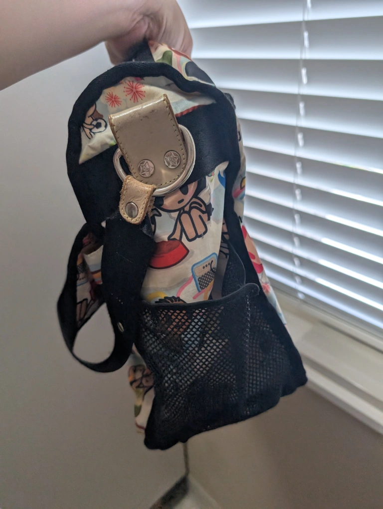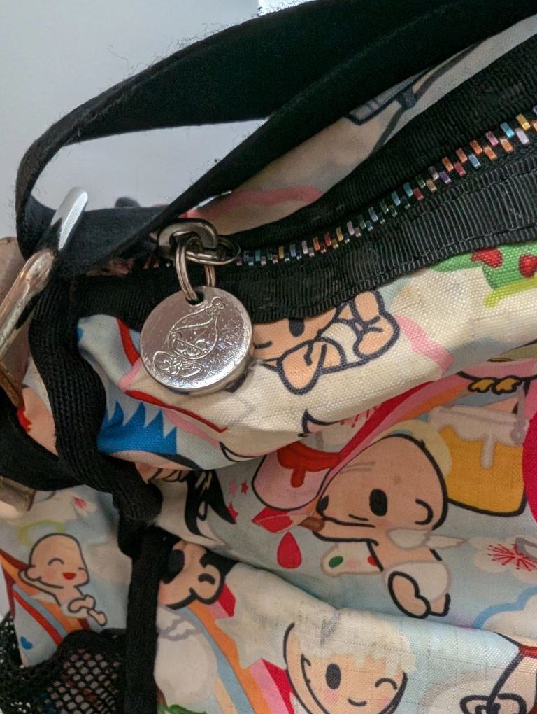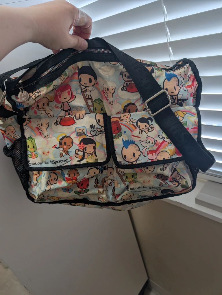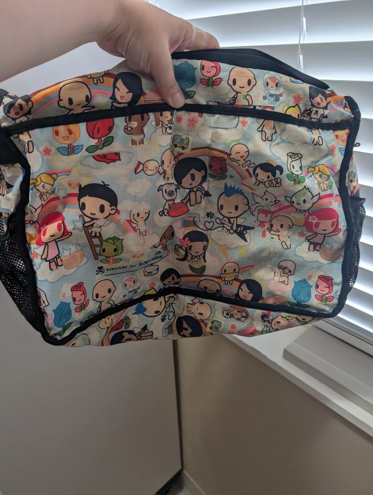 Tokidoki for LeSportsac diaper bag. I used it as a messenger bag for school. It well used but still has lots of life left. It could use a bit of cleaning. No rips, not even in the mesh. Has the beautiful rainbow zipper. This bag features a fun, colourful Tokidoki print on a LeSportsac design. Was purchased for over $100. The cute print is no longer available. Lesportsac bags have rip stop nylon.