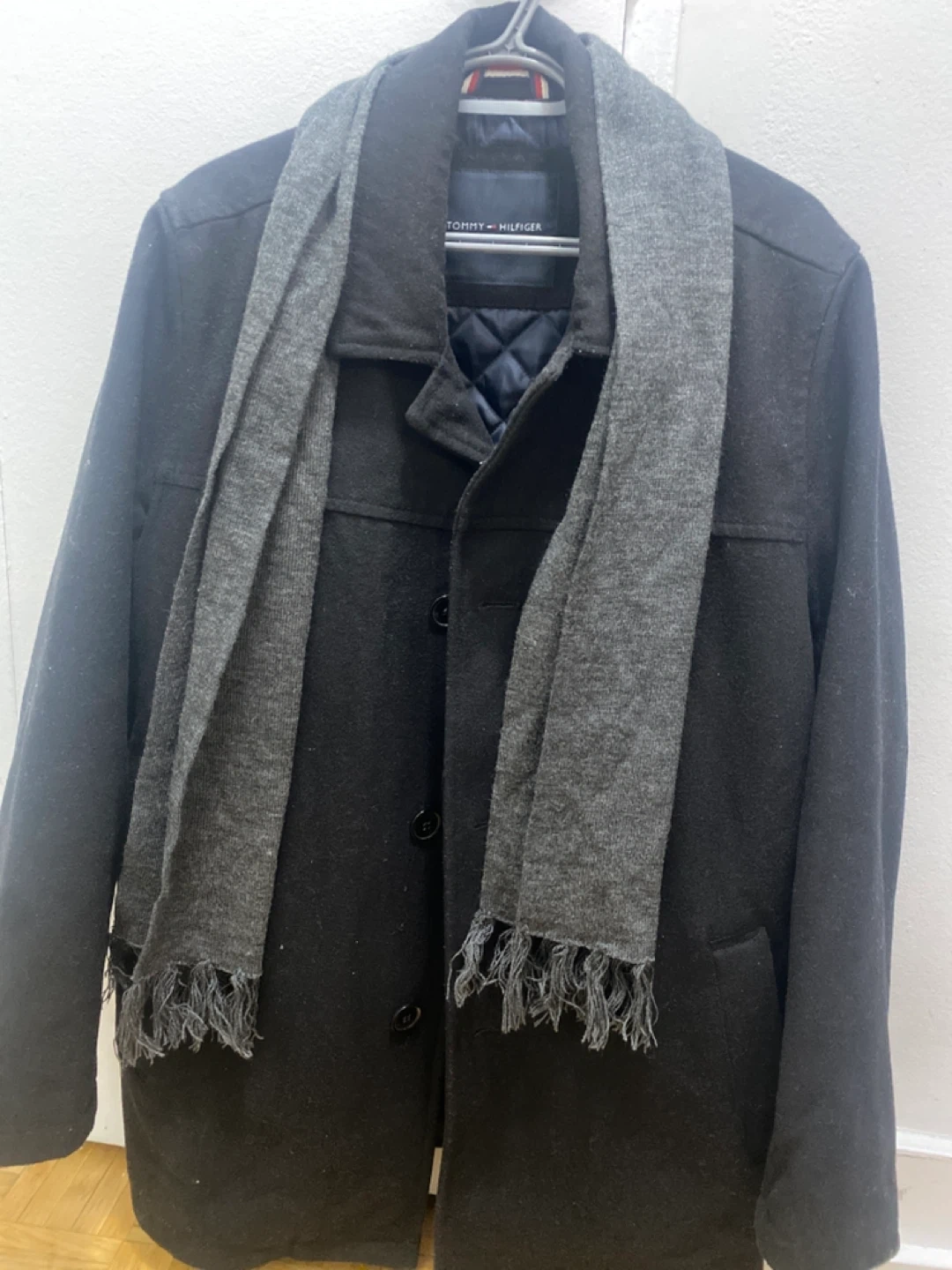 Selling a Tommy Hilfiger black coat that comes with a gray scarf. It's in great condition and ready for a new home!