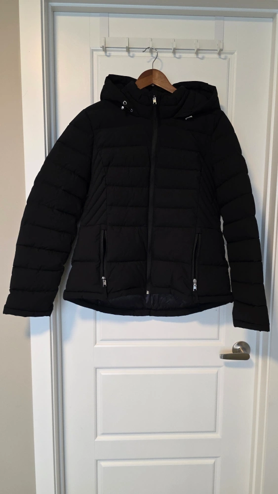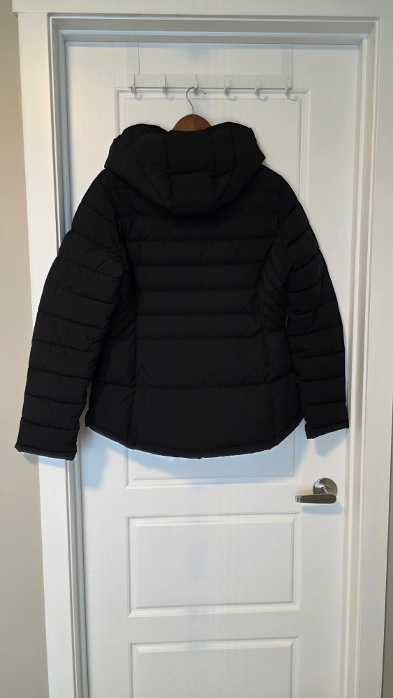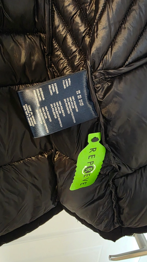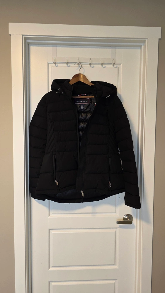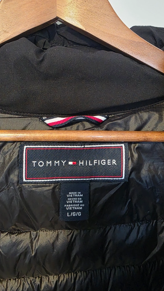 Women's Tommy Hilfiger puffer jacket in size L. Exterior is 100% nylon, lining is 100% polyester, and filling is 70% down and 30% polyester