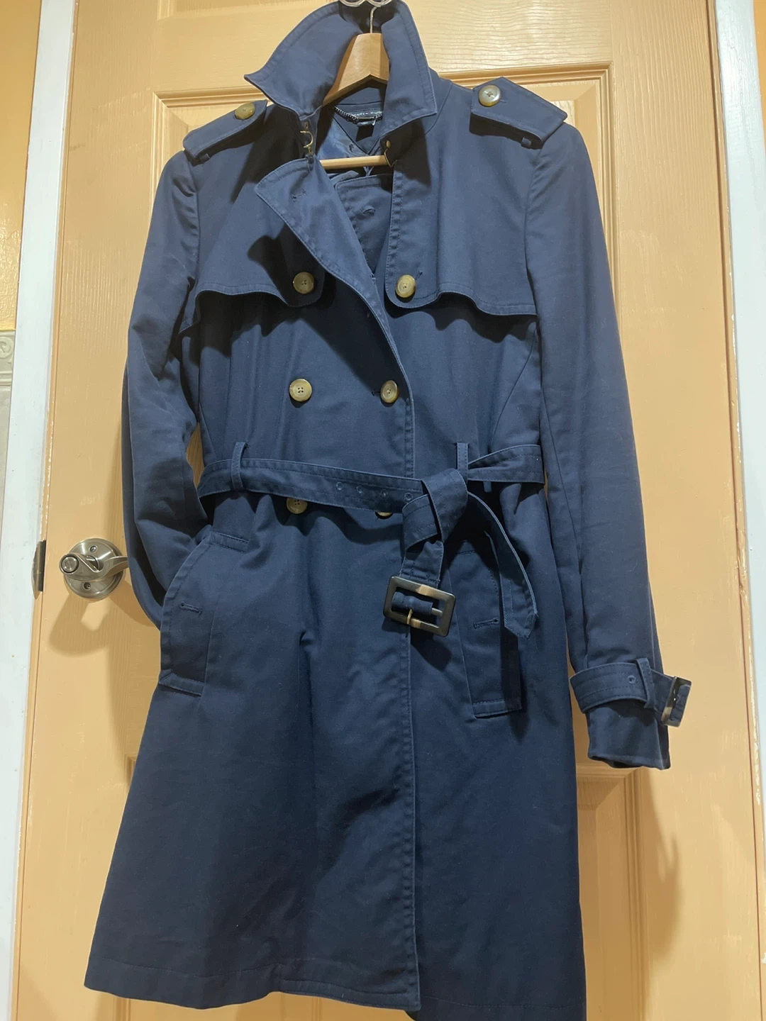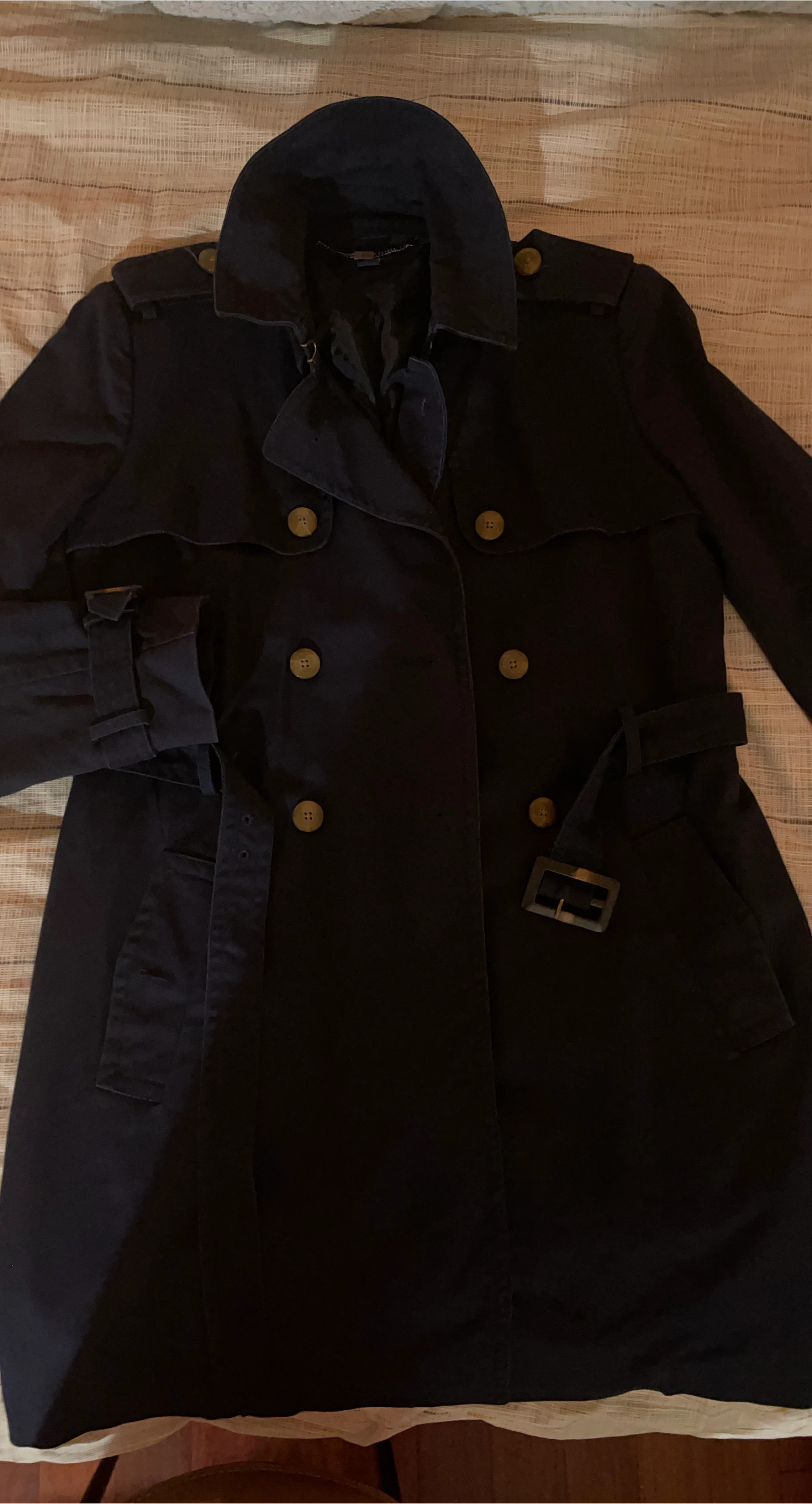 A classic black trench coat from Tommy Hilfiger! It features a double-breasted design with gold-tone buttons and a belted waist. Perfect for adding a touch of sophistication to any outfit. The material feels durable and comfortable.