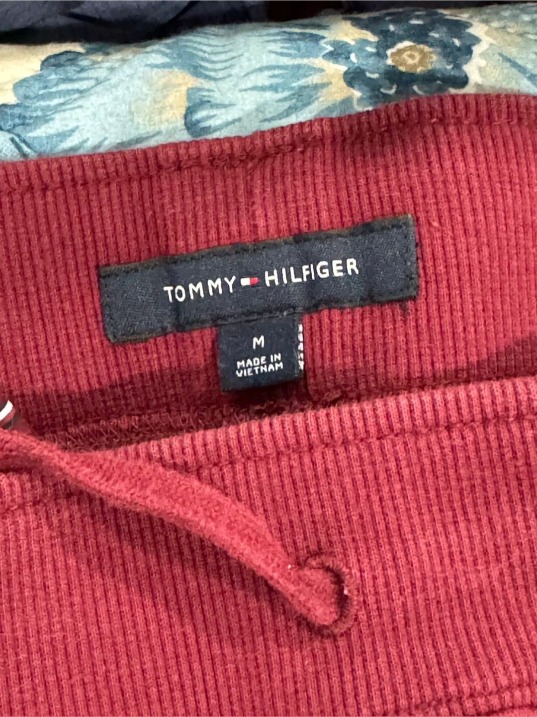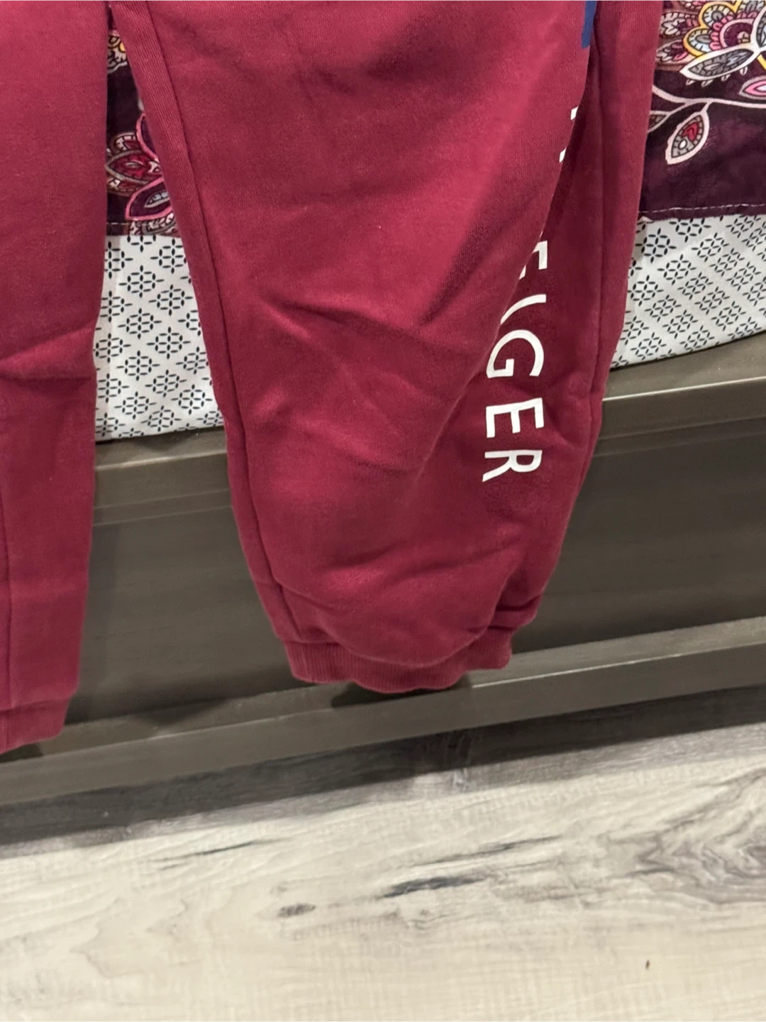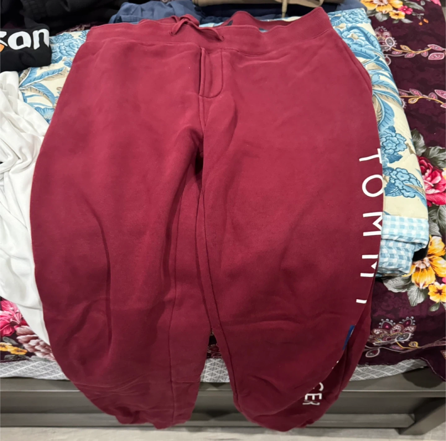 Cozy Tommy Hilfiger sweatpants in a lovely burgundy colour! They're a size medium and feature the Tommy Hilfiger logo on the side. Perfect for lounging or running errands!