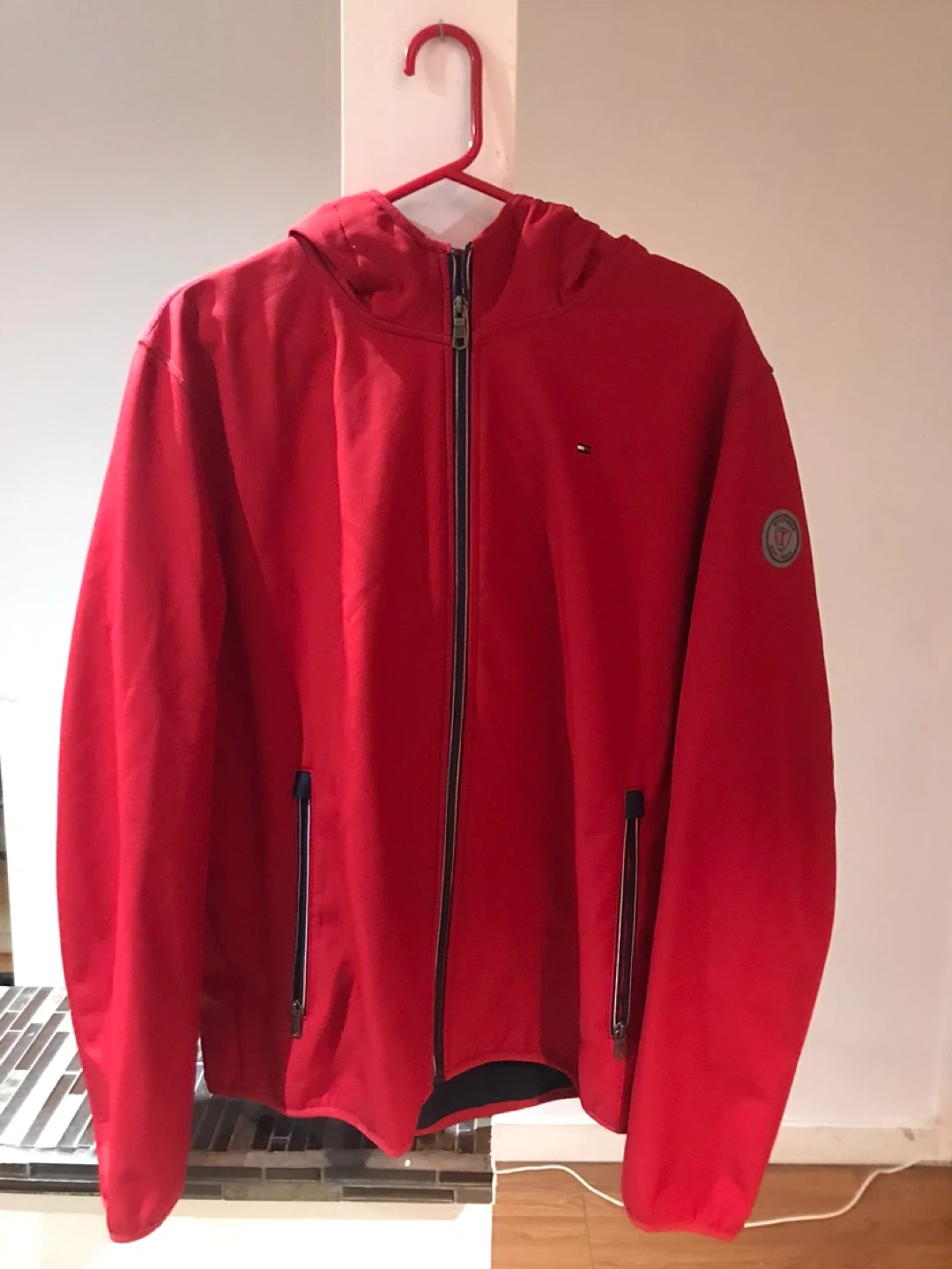Men's red softshell jacket. Size XL. Features a zip-up front, hood, and pockets. Excellent condition. Asking $30 Call/text 431-792-3594