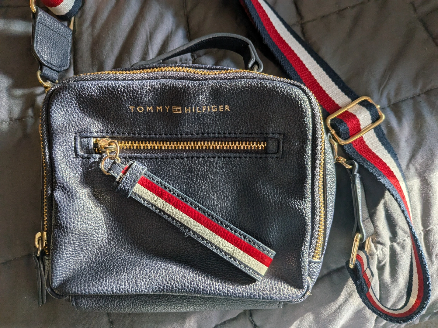 Selling a cute Tommy Hilfiger crossbody bag! It's in great shape and features a navy blue colour with gold hardware. The strap has a red, white, and navy stripe. Perfect for everyday use! pickup location Oxford and Wonderland FCFS cross posted please checkout my other listings