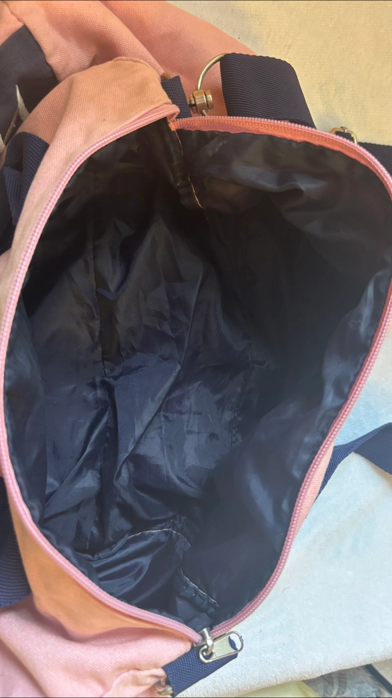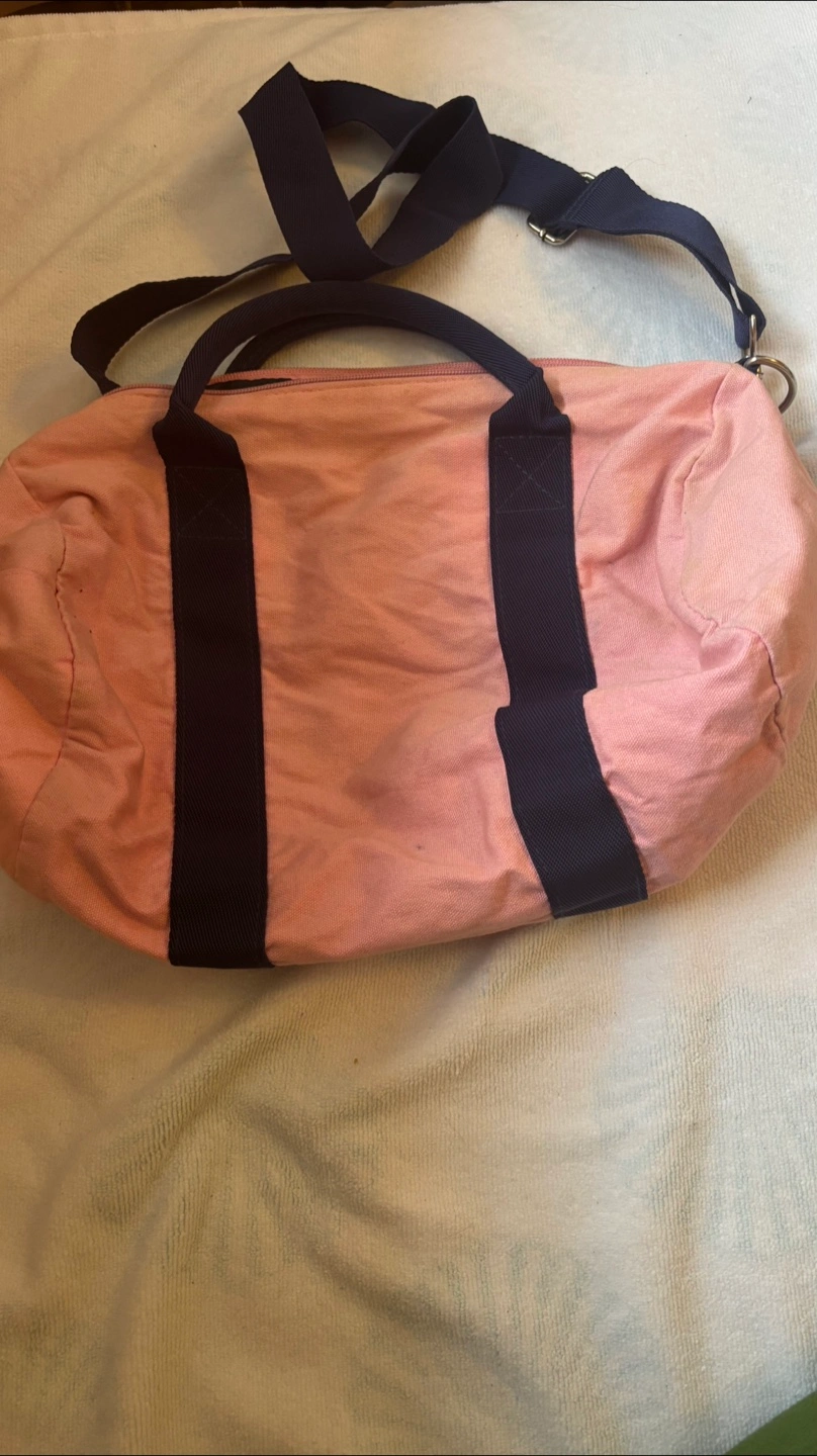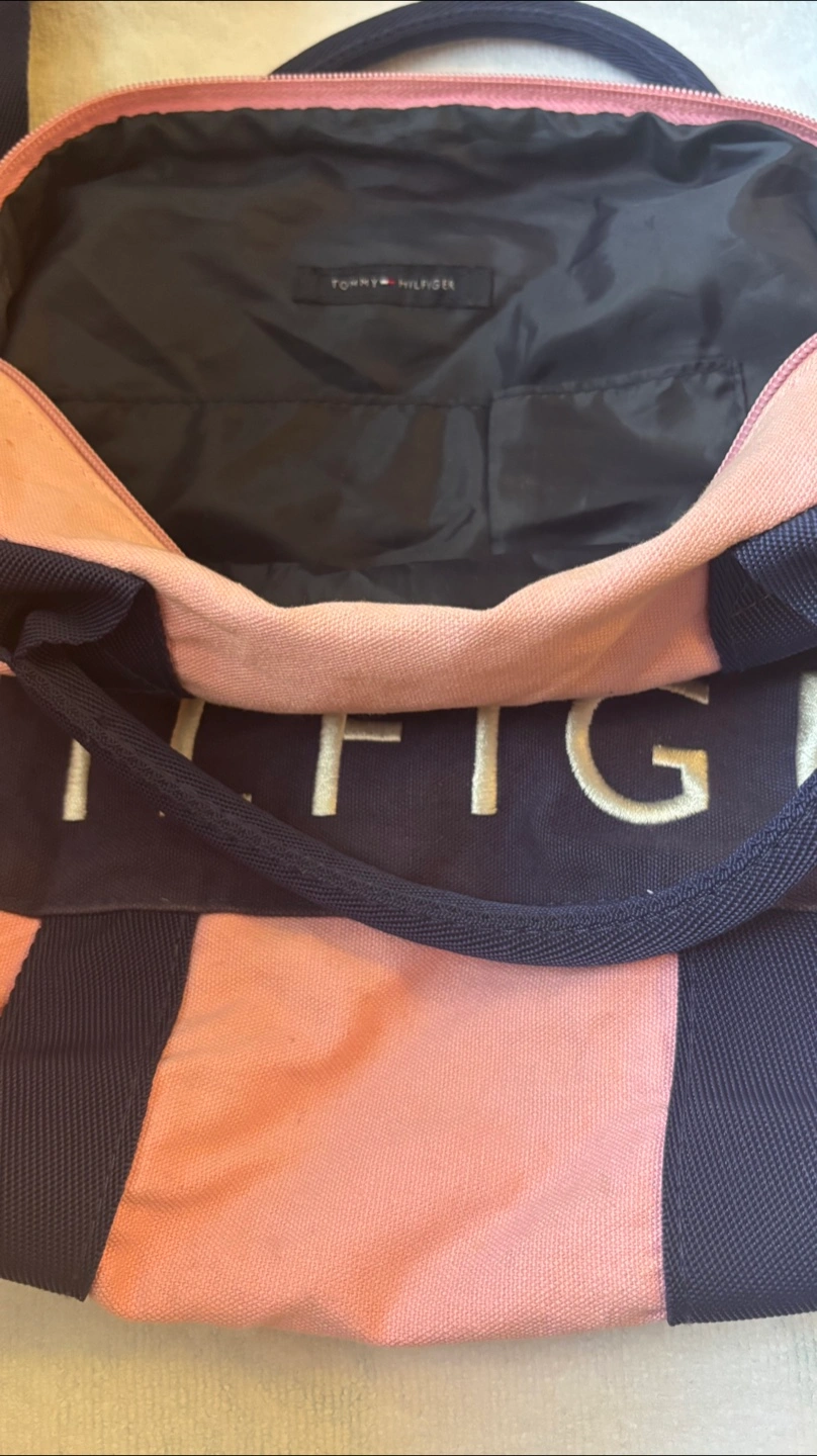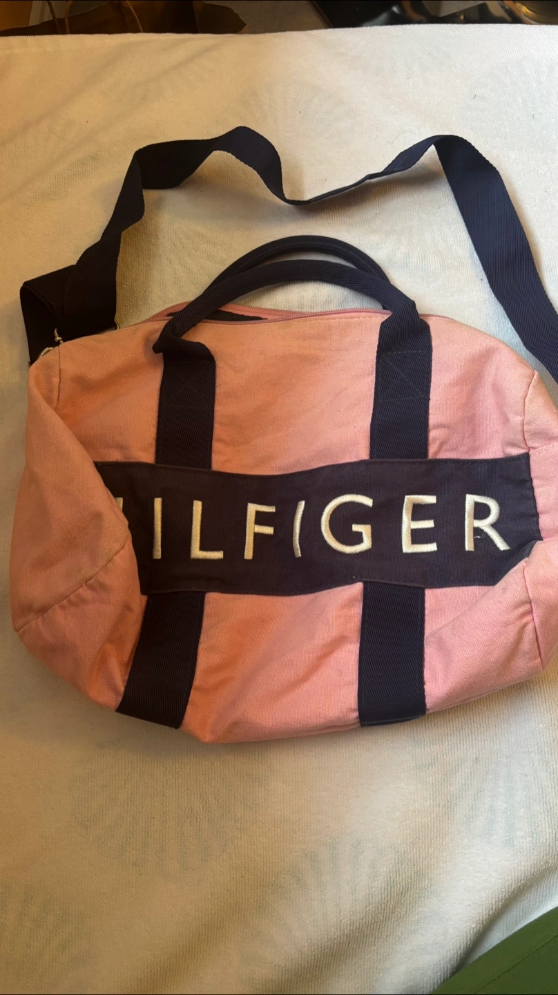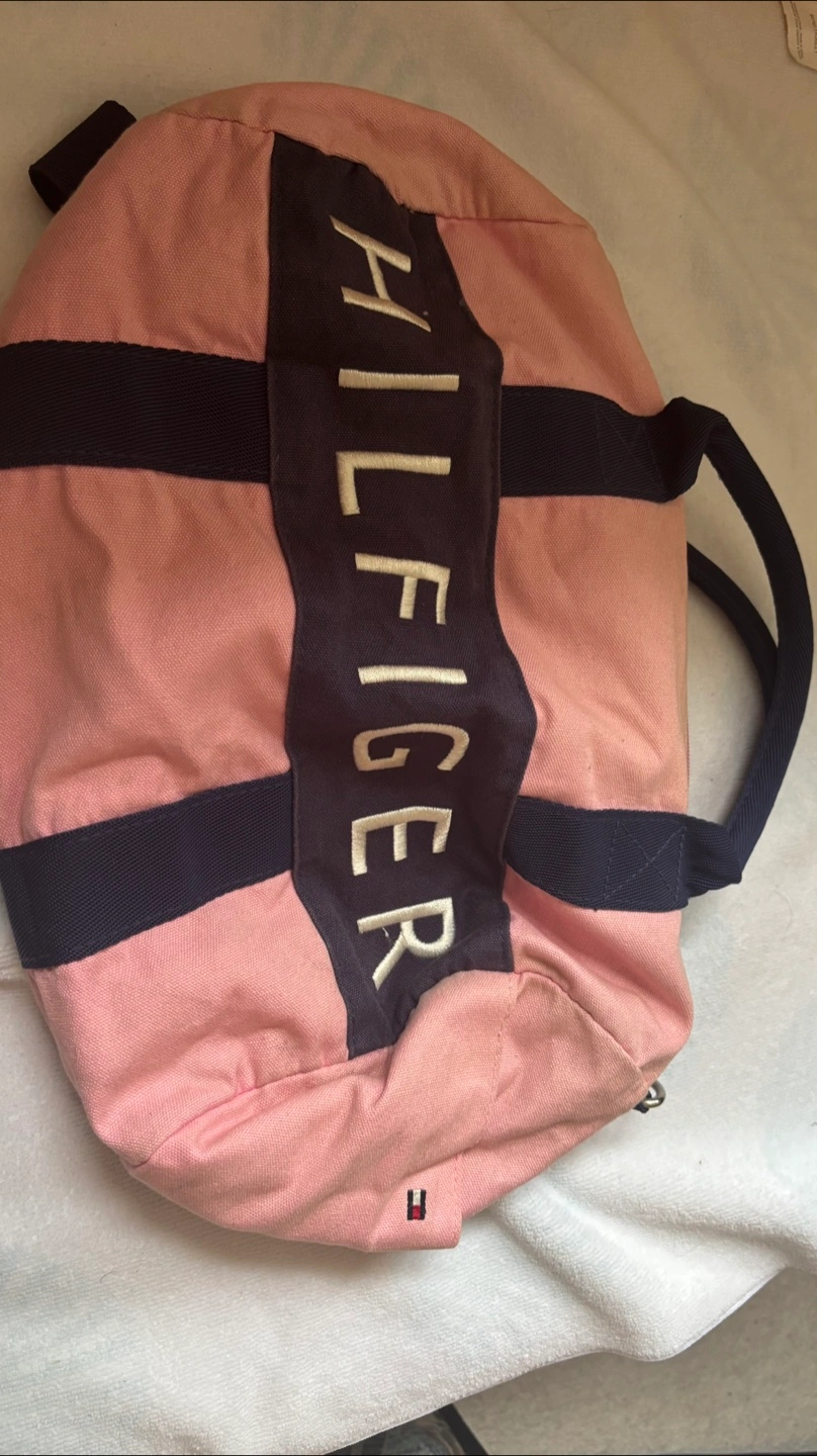 Here's a cute Tommy Hilfiger duffle bag in pink and navy! It has a shoulder strap and is perfect for the gym or a weekend getaway. It's in good condition and ready for a new home
