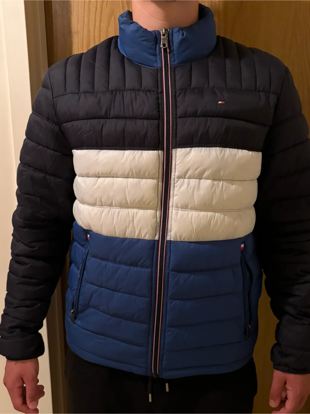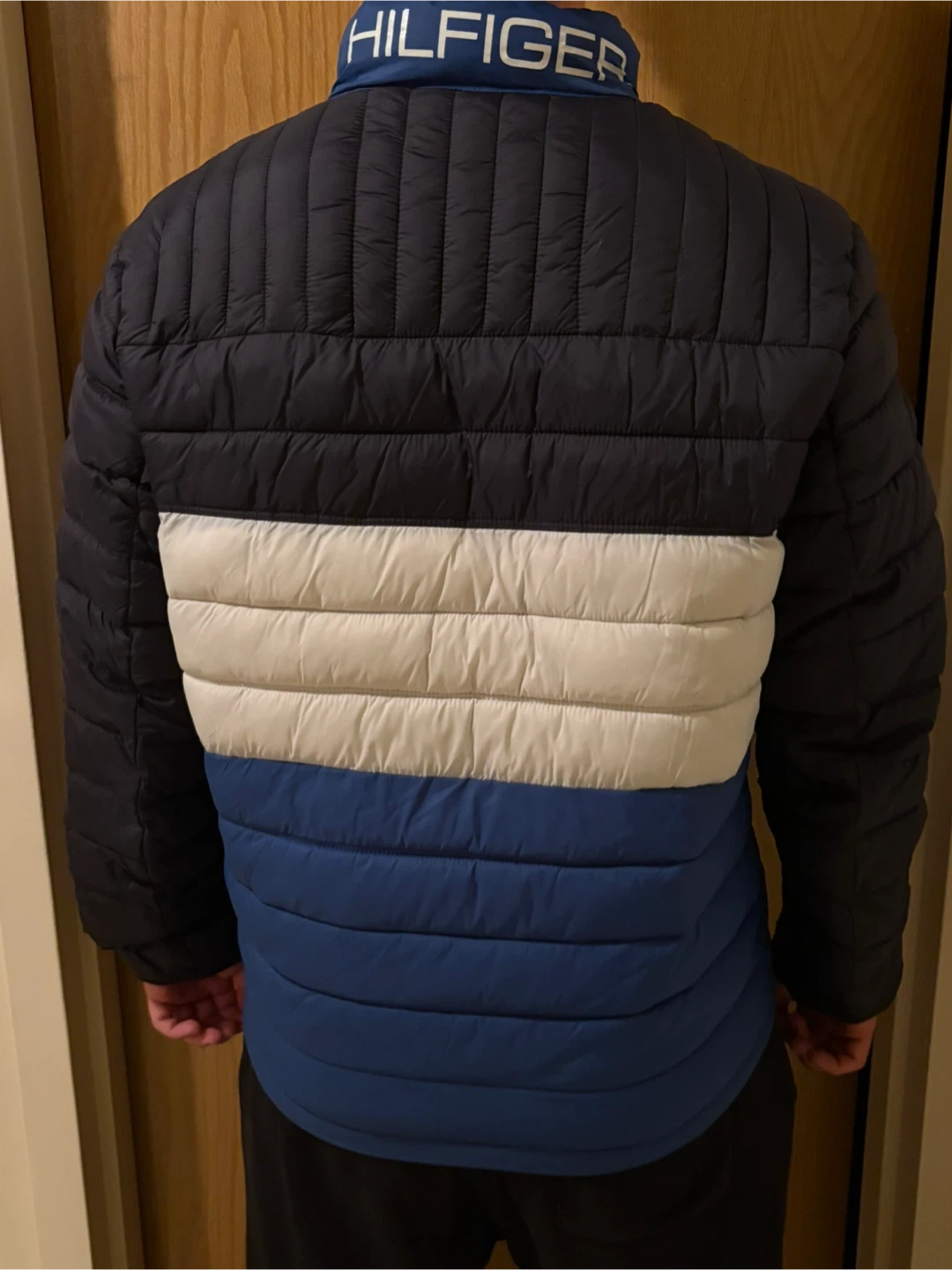 Tommy Hilfiger puffer jacket in a stylish colour block design featuring blue, white, and black. Great for staying warm during cooler weather!