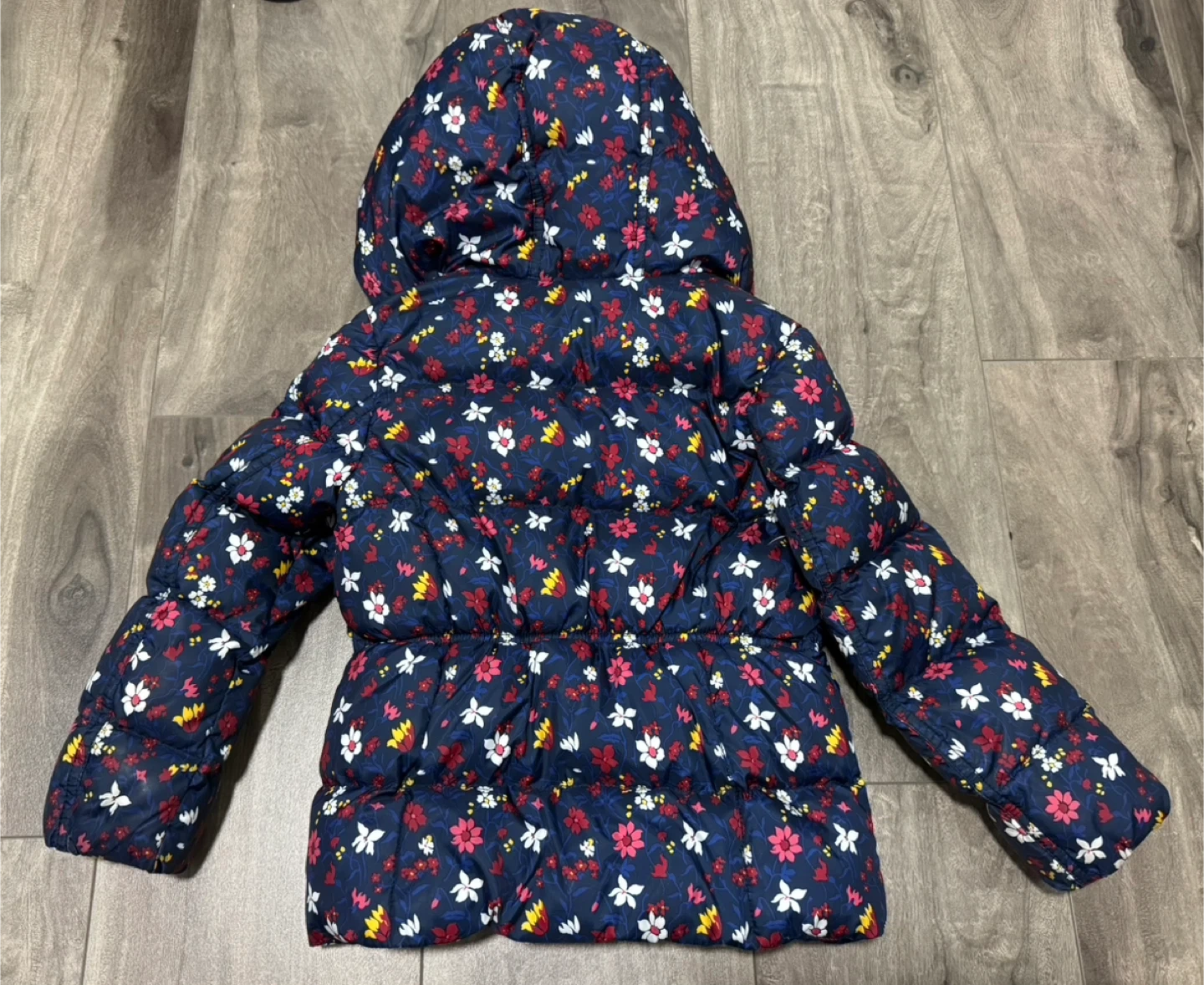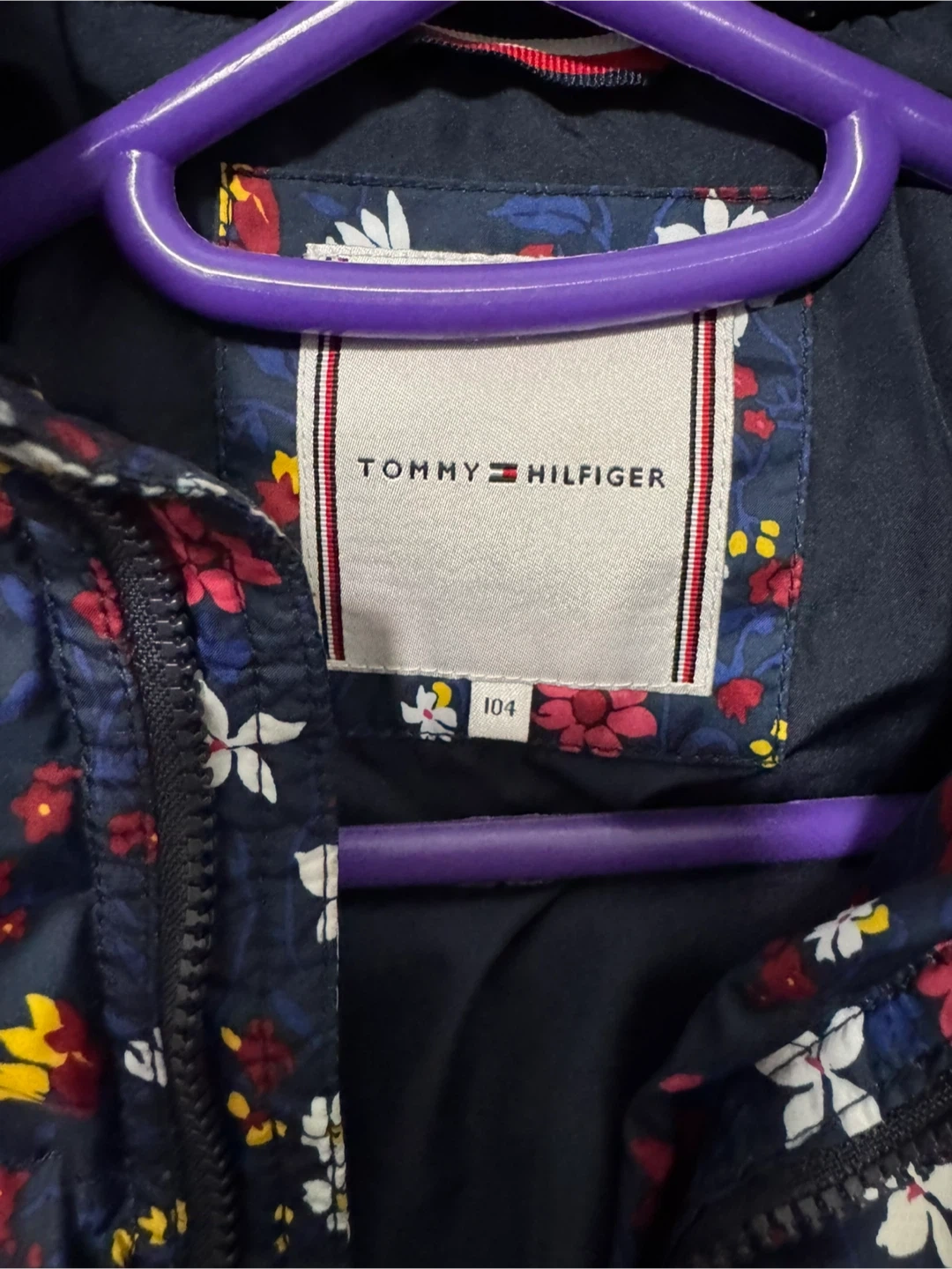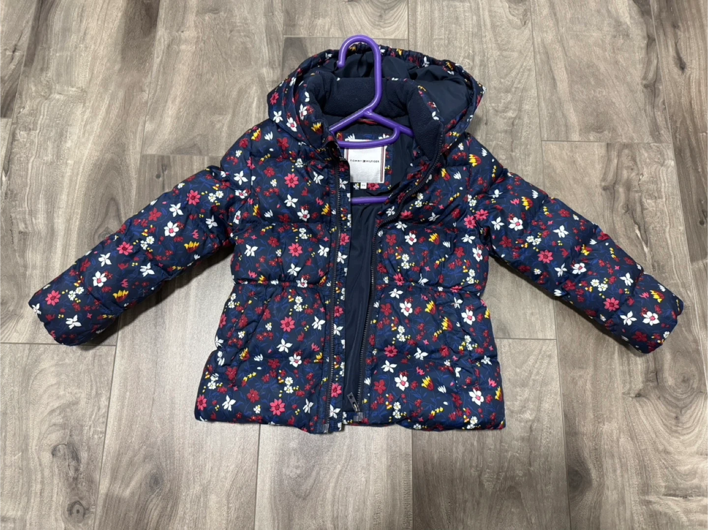Keep your little one warm and stylish with this adorable Tommy Hilfiger puffer jacket! It features a lovely floral pattern on a navy blue background. The jacket is a size 104. Perfect for those chilly Canadian days! 90% down 10% feather