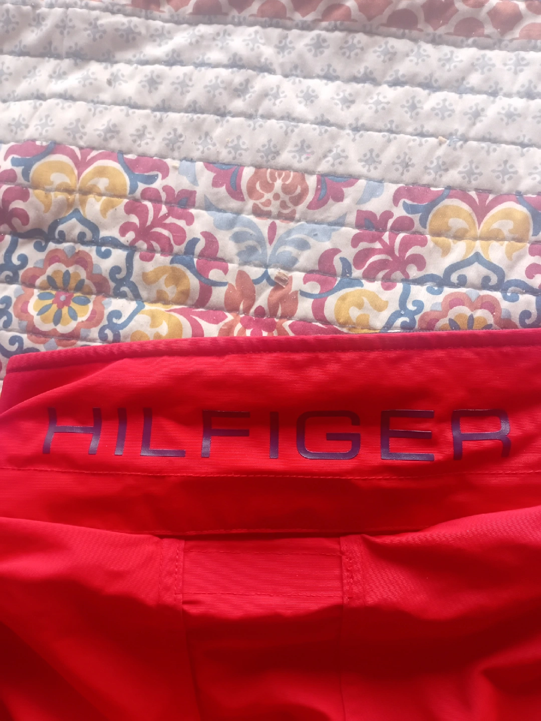 Trading a Tommy Hilfiger jacket in a vibrant red colour! It's a size large and features a hood, perfect for those cooler Canadian days. The jacket has a sporty design with striped detailing on the collar and hem. It's in great condition and ready for a new home! *note: the inside signing appears to be purple, but it's actually blue.