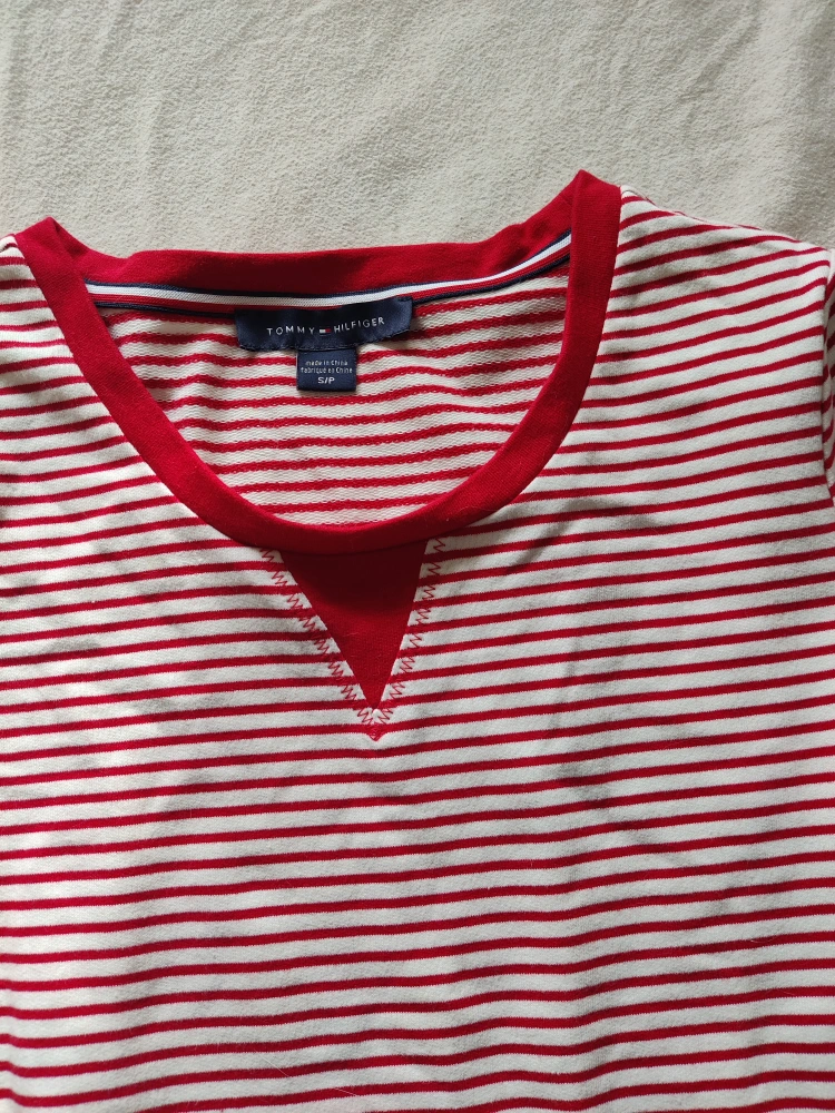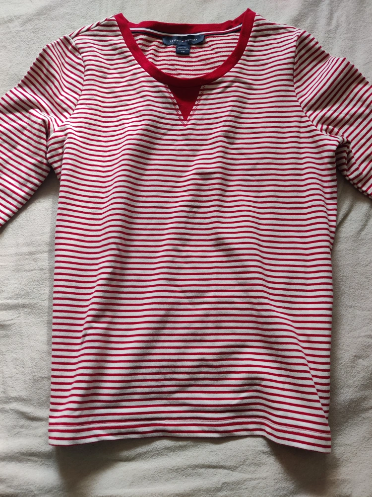 Red and white striped long-sleeved shirt with a v-shaped neckline. worn once