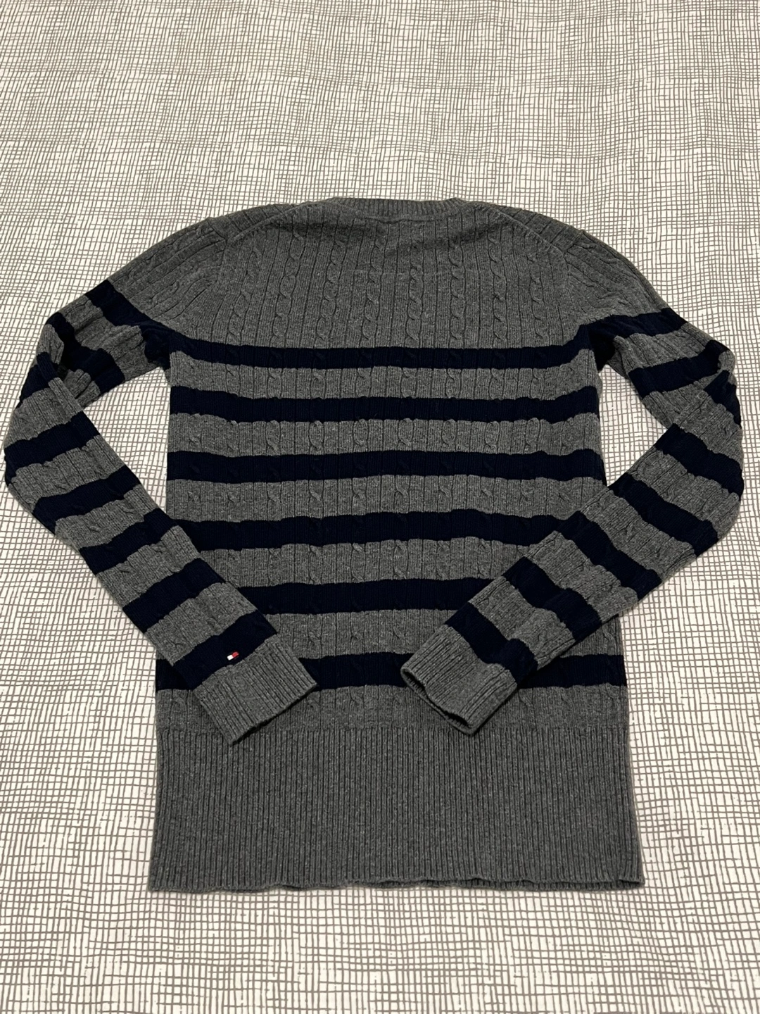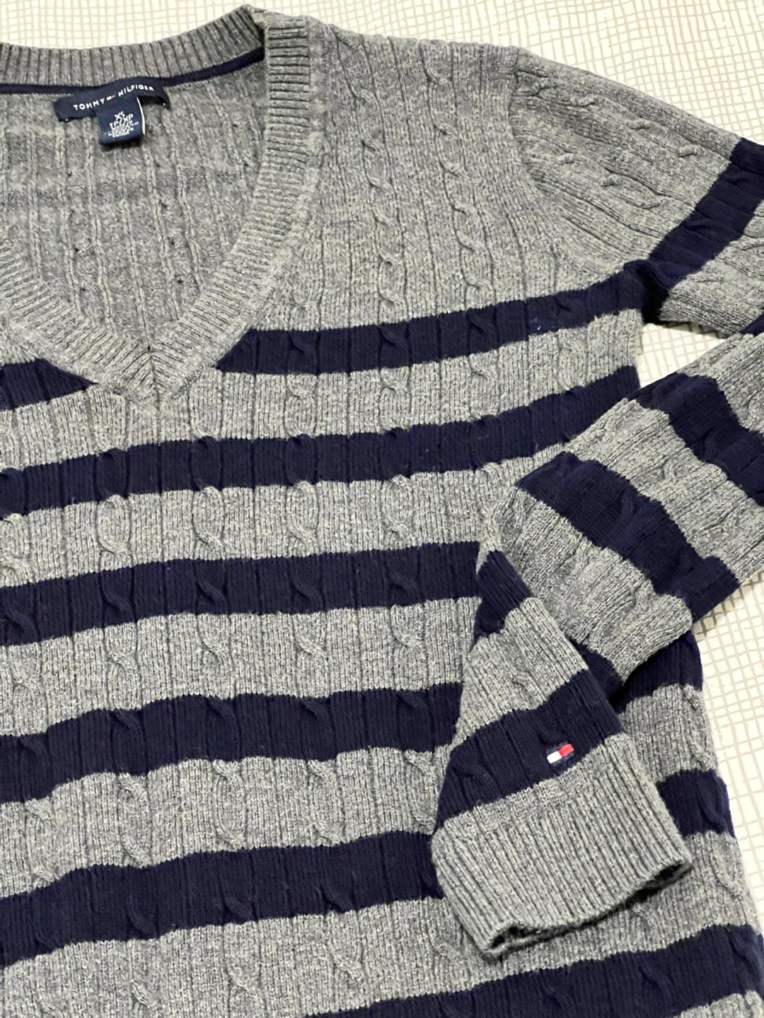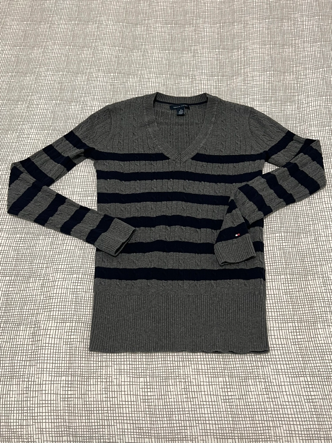 Grey and navy striped V-neck sweater. Long sleeves. Cable knit detail. Stretch fits XS/S.