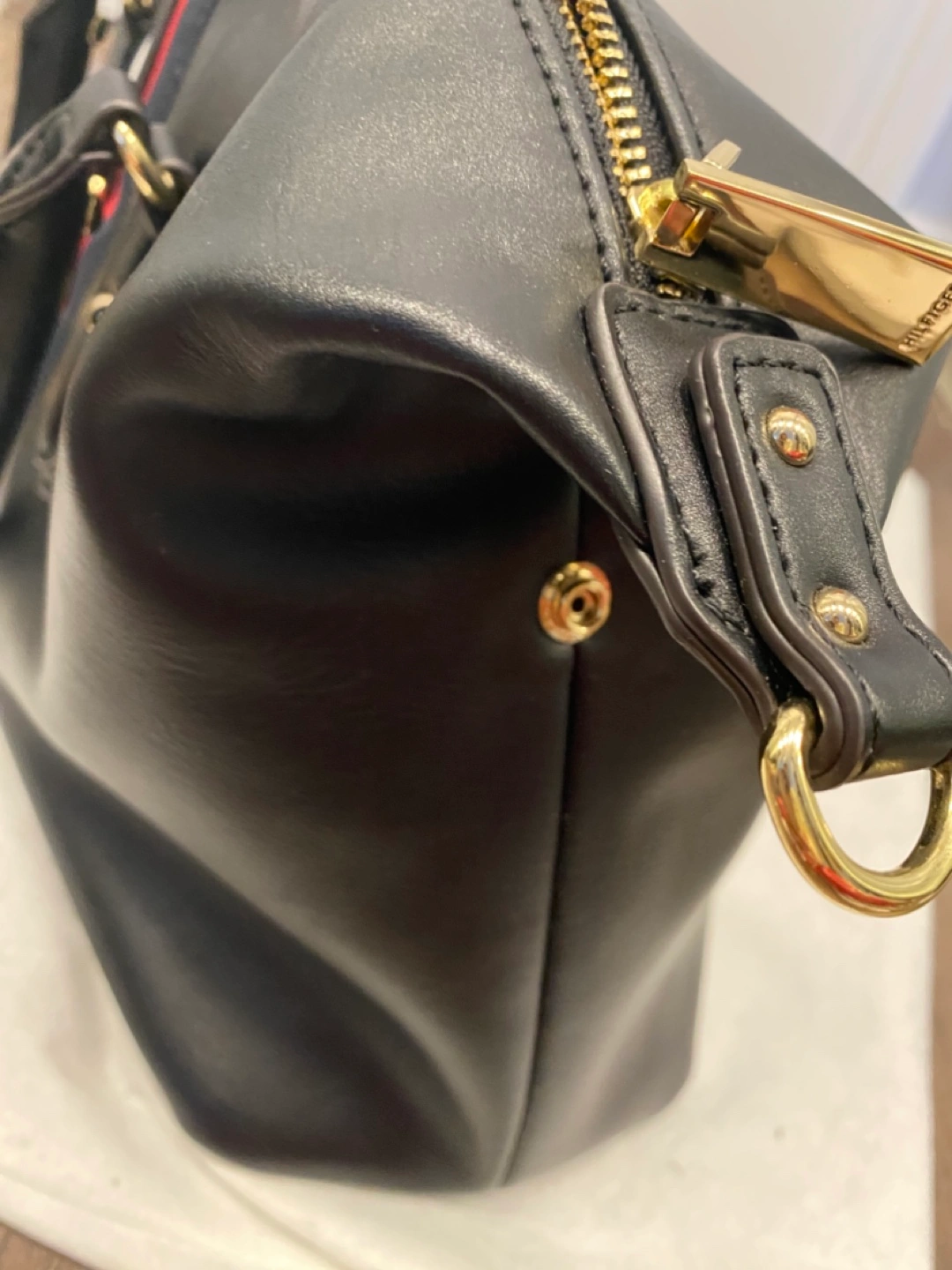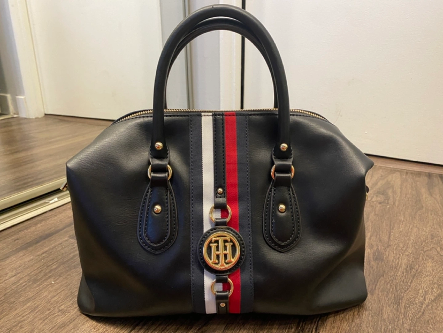 Tommy Hilfiger Women's Handbag Jaden Satchel Shoulder Top handle satchel handbag with Tommy Hilfiger women signature flag stripe and gold TH hardware. Double top handles and removable convertible strap with gold hardware details. Flat bottom, top zip closure. Lined nylon interior with wall zip pocket and slip pocket. This Tommy Hilfiger bag is a versatile essential, perfect for your next work bag. Excellent condition Size 13-3/4" L; 8-1/2" H; 5-1/2" W; 3-3/4 23-1/2" drop. Color Black Polyvinyl Chloride