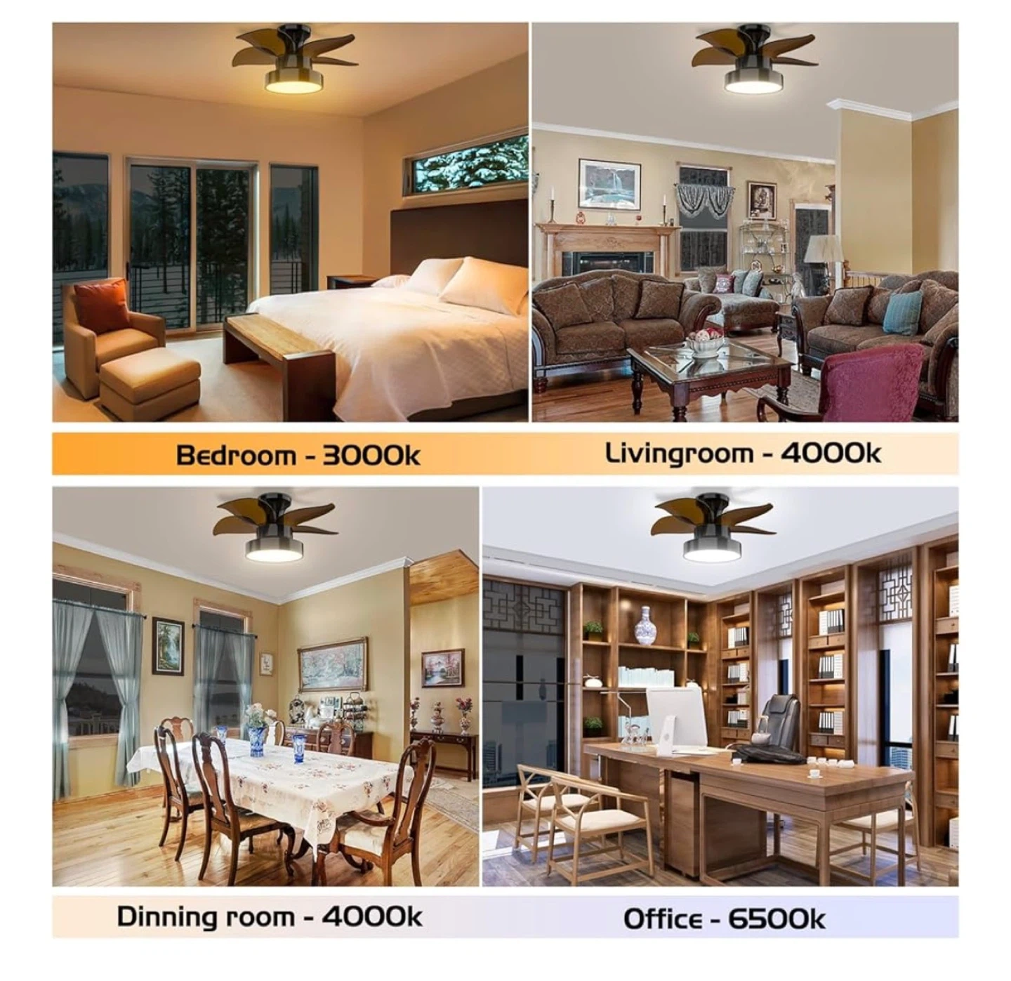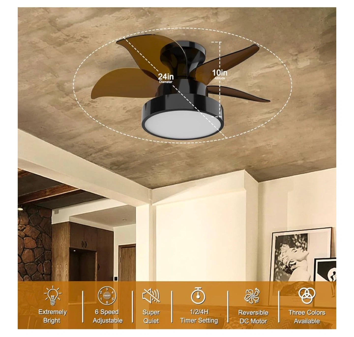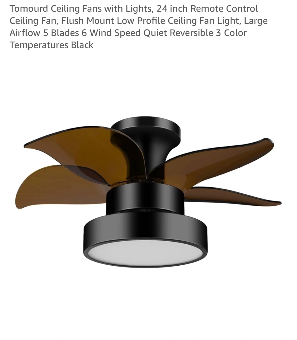 I'm selling a Tomourd ceiling fan with lights. It has a 24-inch remote control and a flush mount low-profile design. It has a large airflow with 5 blades and 6 wind speeds. It also has a quiet, reversible 3-color temperature setting. The color temperature can be adjusted in three settings: warm white (3000K), cool white (4000K), and clear white (6500K). It also has an automatic memory function and is suitable for all seasons. The noise is well controlled at 30 dB