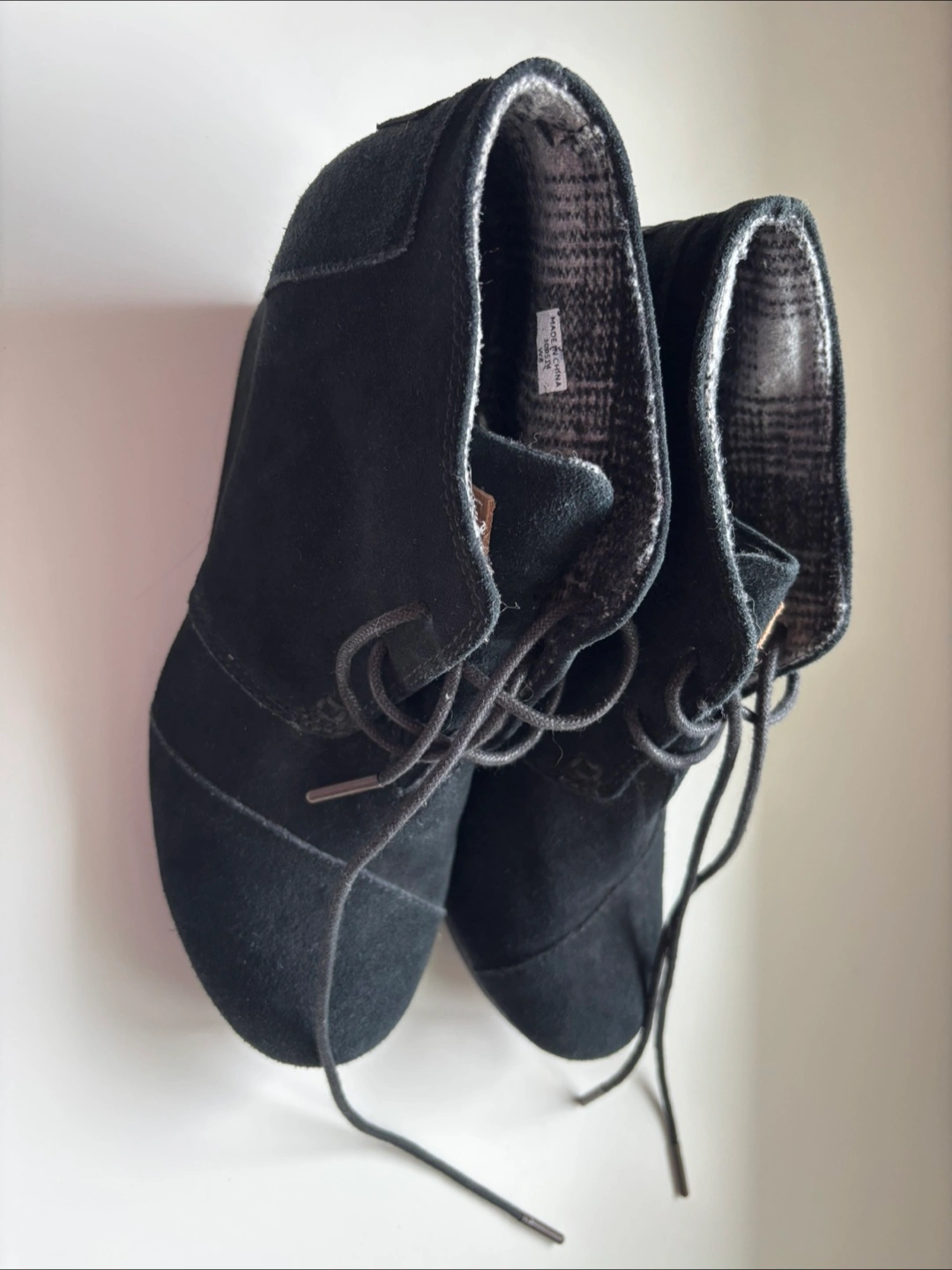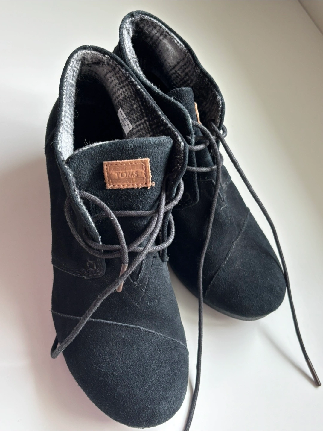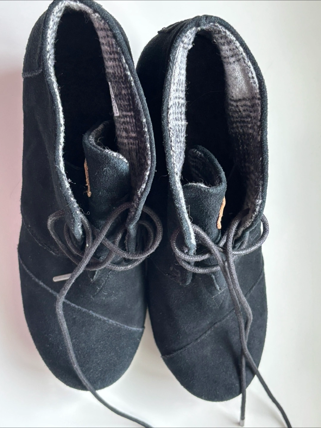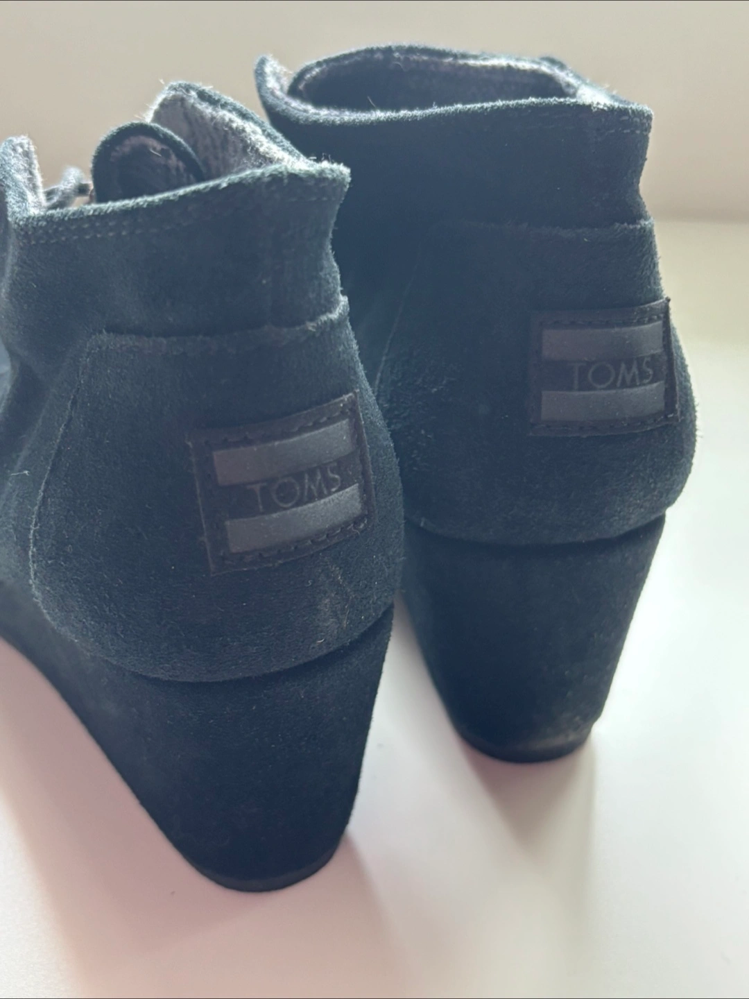 Selling a pair of black TOMS ankle boots in size 8. They're made of suede and have a cute, casual style. Perfect for adding a bit of flair to your everyday look!