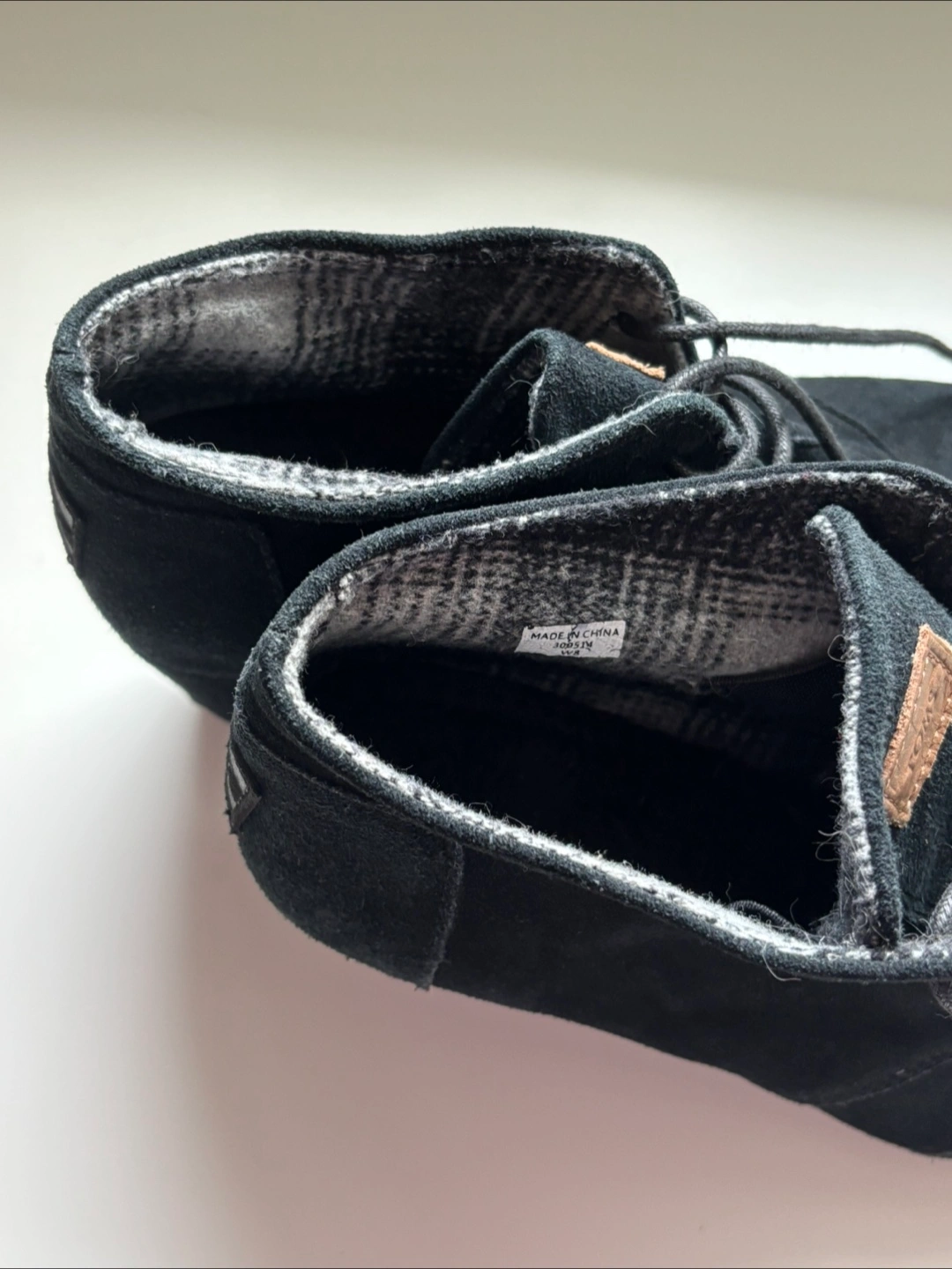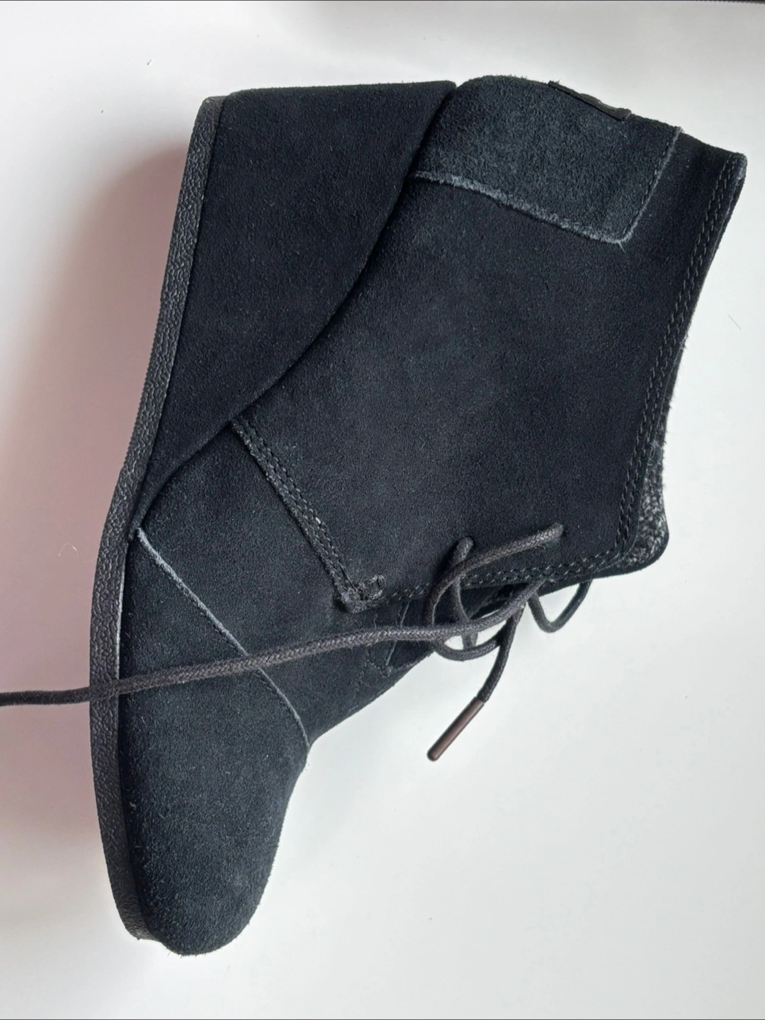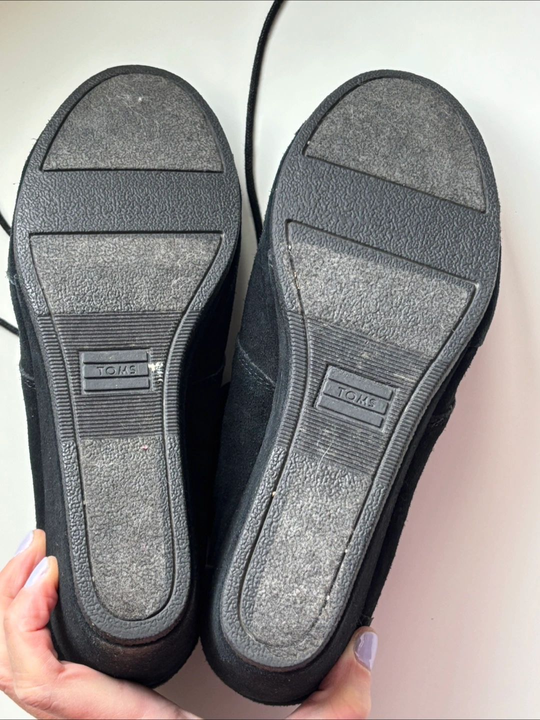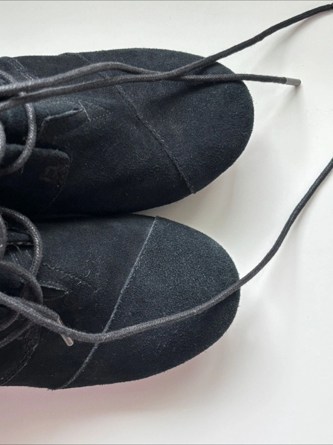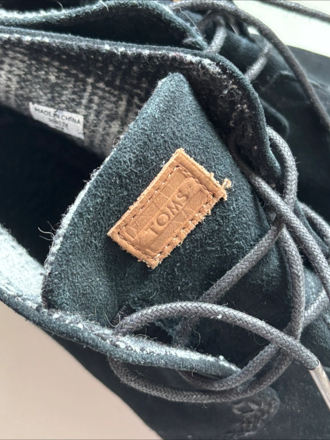 Selling a pair of black TOMS ankle boots in size 8. They're made of suede and have a cute, casual style. Perfect for adding a bit of flair to your everyday look!